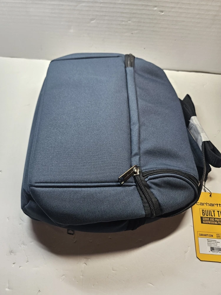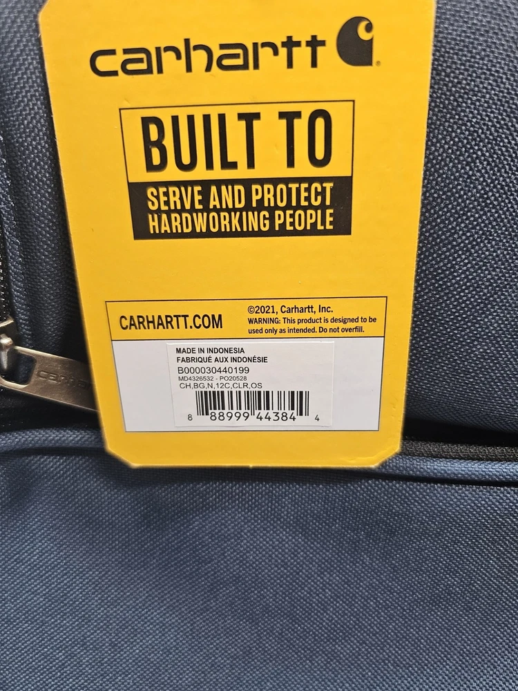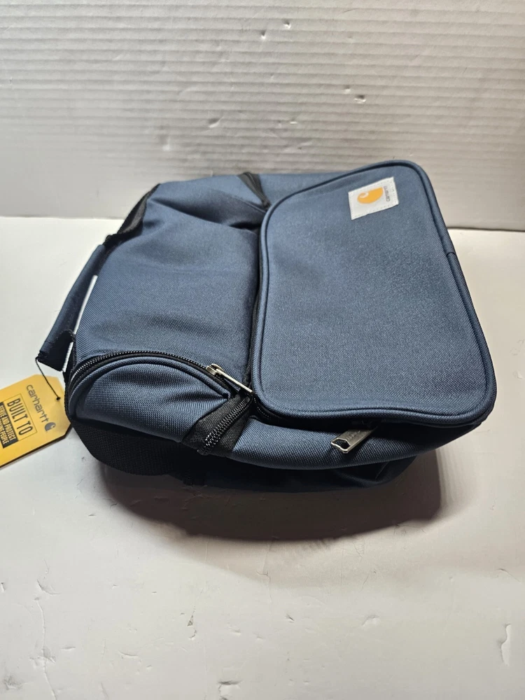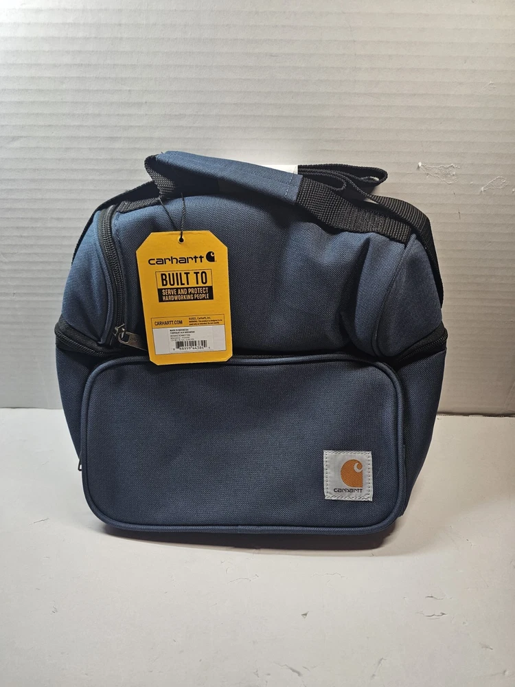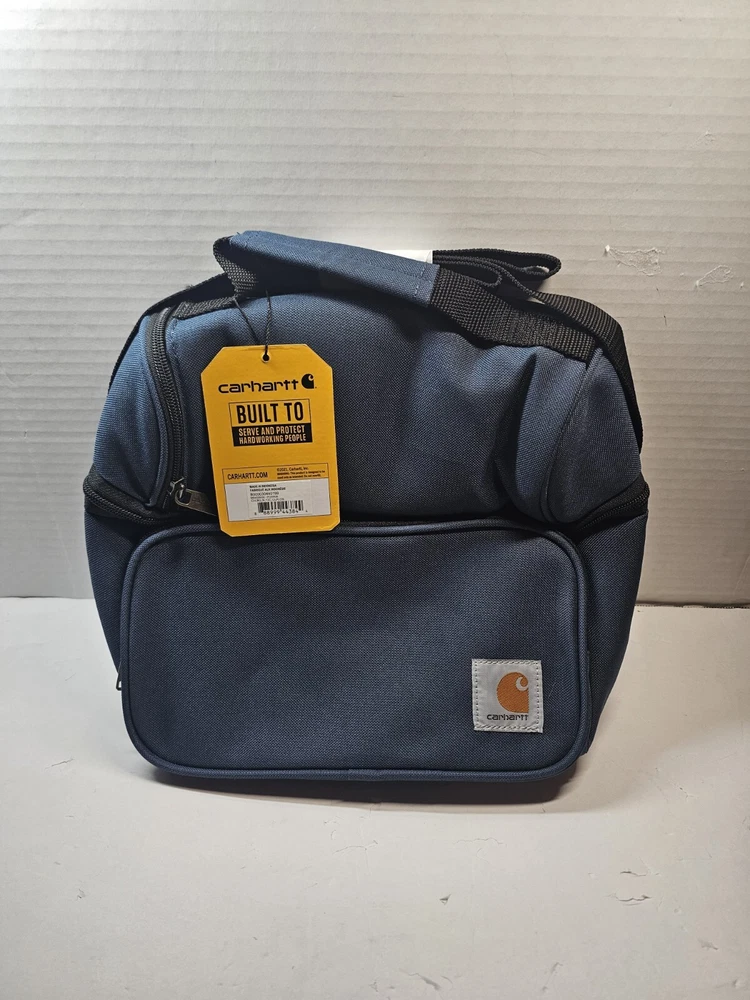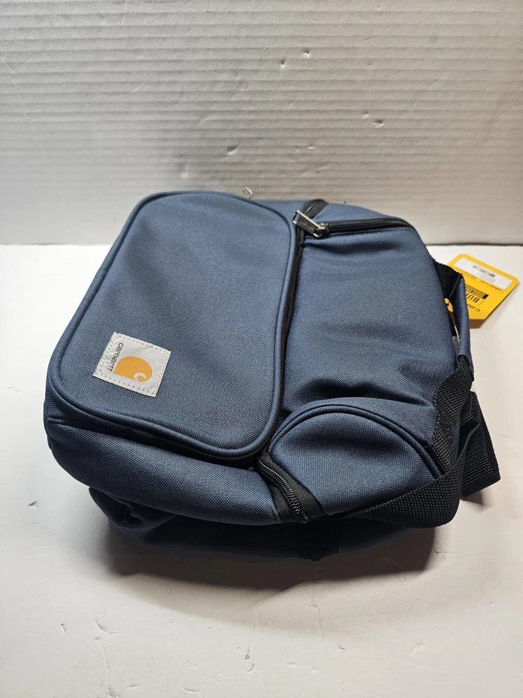 This Carhartt lunch cooler in classic navy blue is perfect for your outdoor adventures or daily commute. With two compartments and accessory pockets, it can hold up to 12 cans and keep your food and drinks insulated. The water repellent canvas material ensures durability, and the lid handle makes it easy to carry. The rectangular shape and solid pattern give it a sleek look that is both functional and stylish. Whether you're heading to the beach, camping, or just need to bring your lunch to work, this Carhartt lunch cooler is the perfect choice.