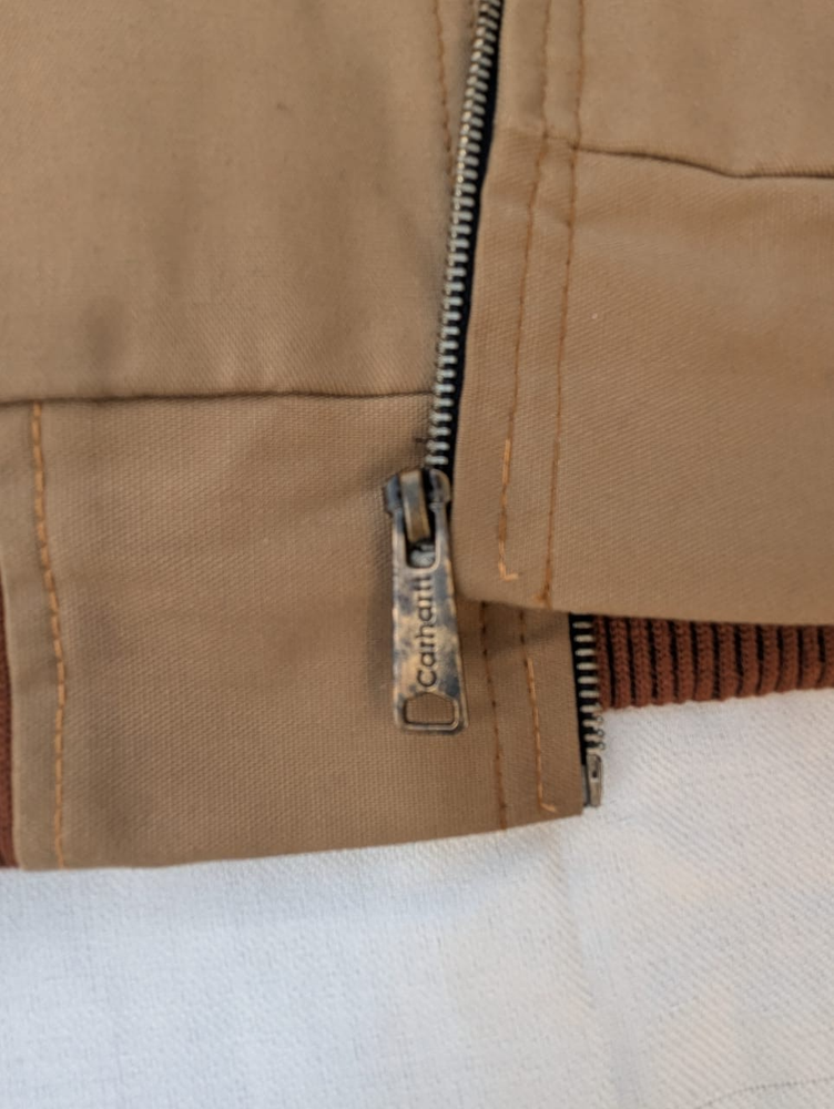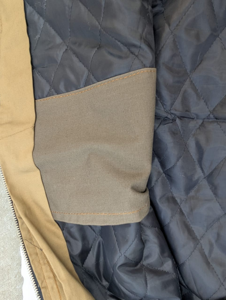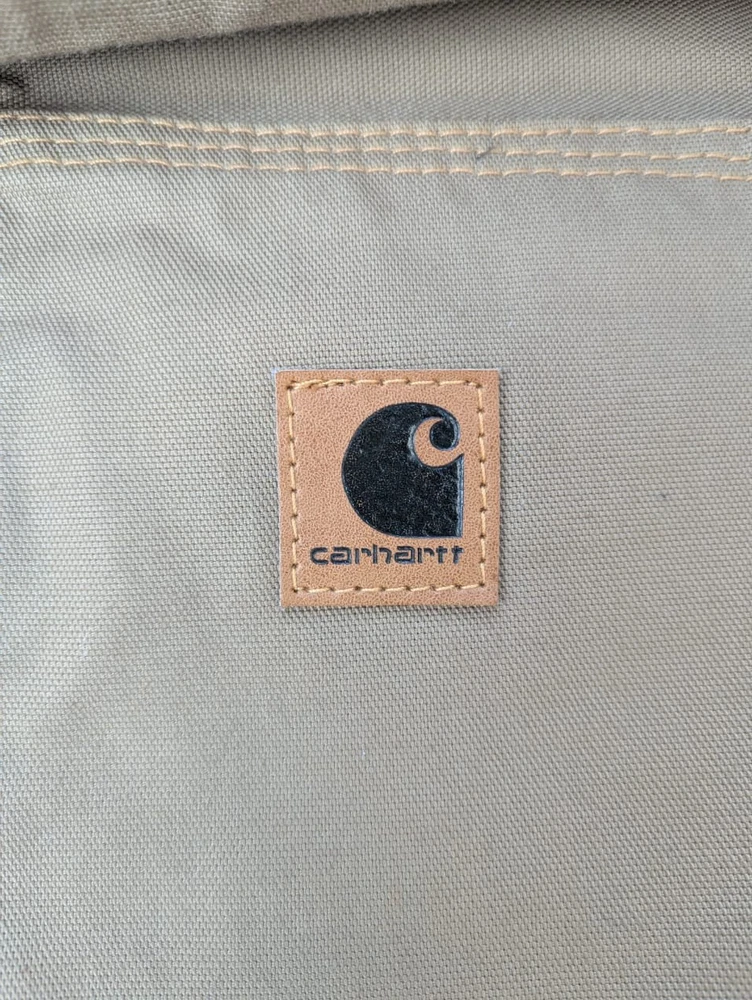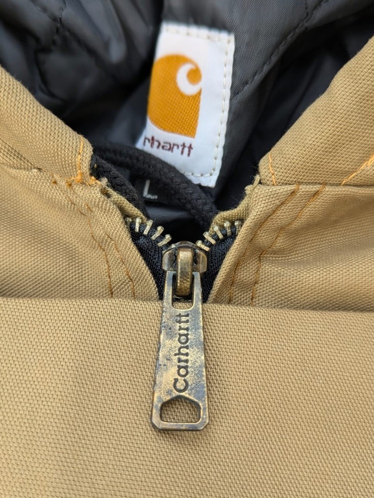 Carhartt Men's Sandstone Duck Active Jacket - Quilted Lined Up for sale is a classic Carhartt hooded work jacket in the iconic tan/brown colorway. This jacket features the "Sandstone" duck canvas finish with the leather Carhartt logo patch on the pocket. It has a warm, black diamond-quilted lining that makes it easy to layer over flannel or hoodies without bunching up. This item features the desirable "broken-in" workwear look with natural fading. Features: Heavyweight Cotton Duck Canvas shell. Black quilted nylon lining (Midweight insulation). Attached hood with drawstring. Rib-knit cuffs and waistband to keep the cold out. Two large front hand-warmer pockets. Interior zippered pocket for valuables. Heavy-duty brass front zipper. Measurements (Taken flat): Chest (Armpit to Armpit): 23.5 inches Length (Shoulder to Hem): 26 inches Tag Size: Large Shipping: Fast and secure shipping! Your item will be packed with care. Shipped withing 2-3 days. Estimated delivery time within 10-14 days.