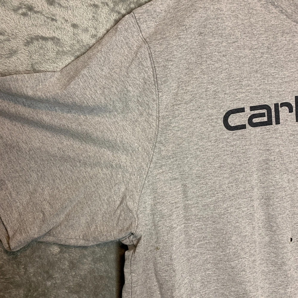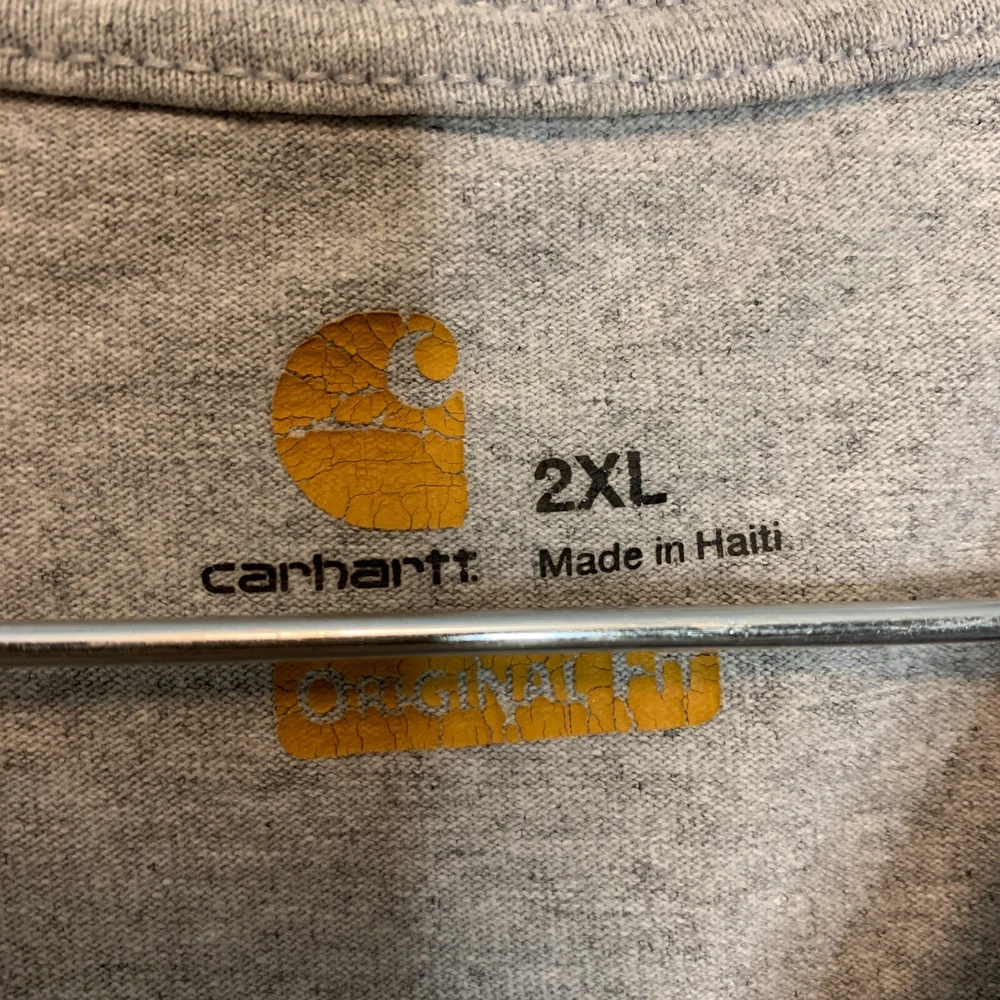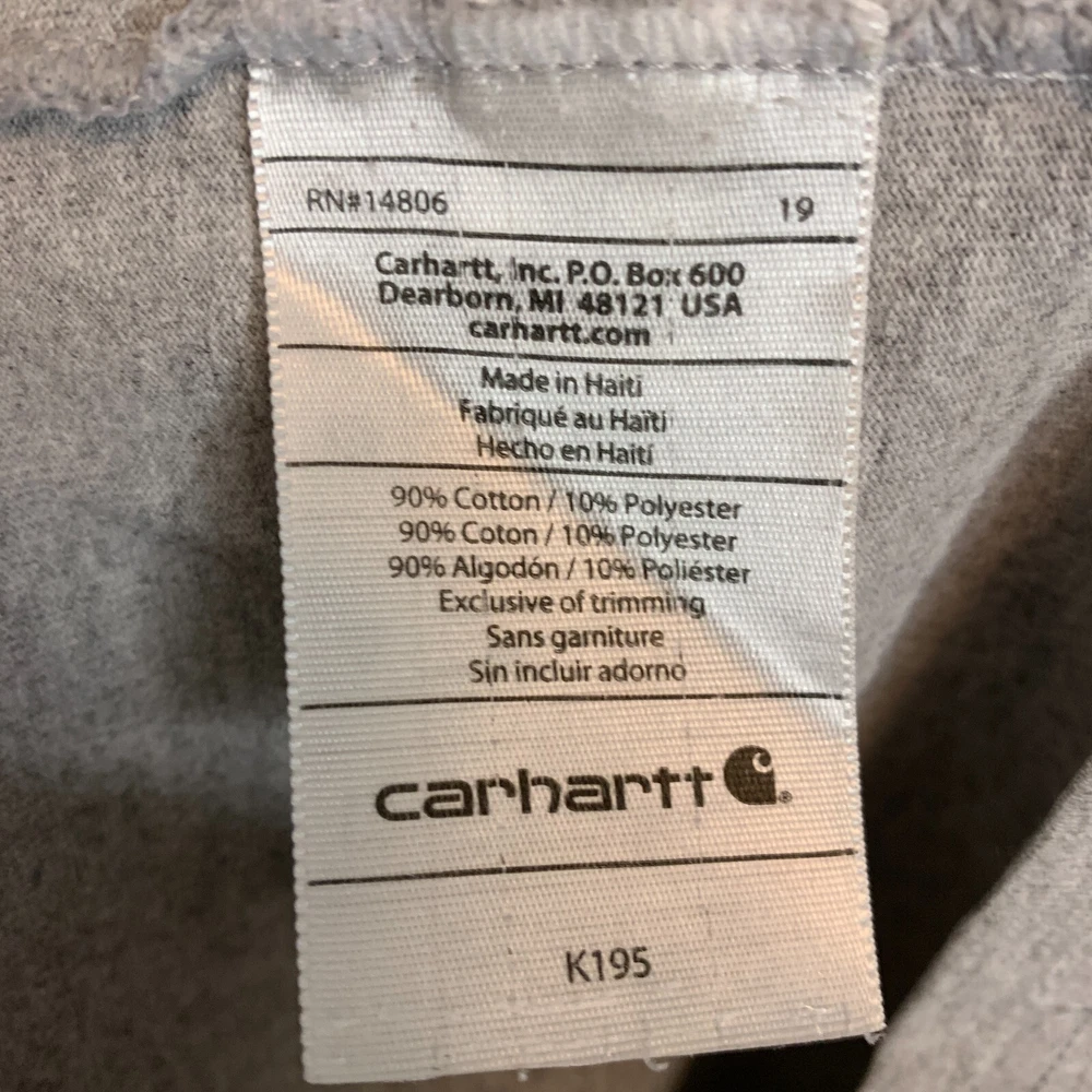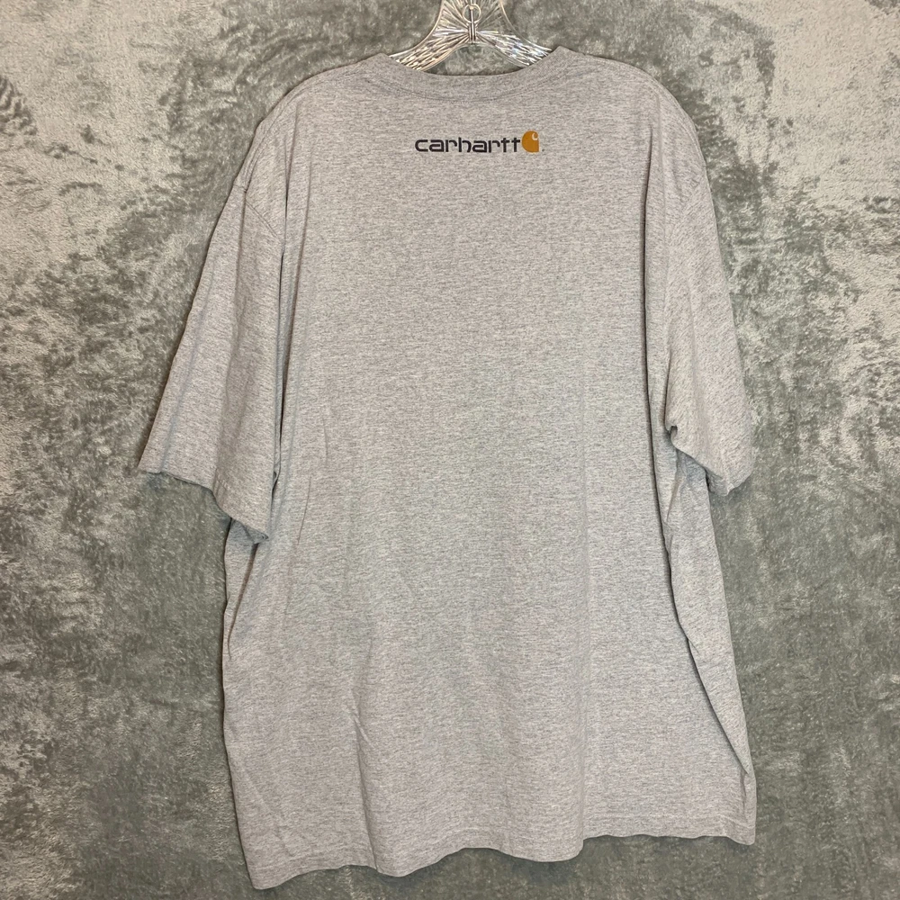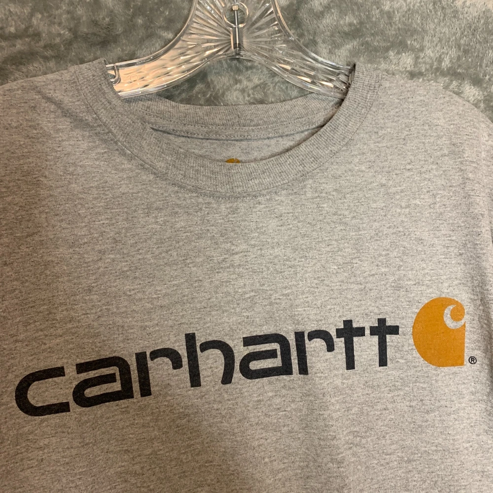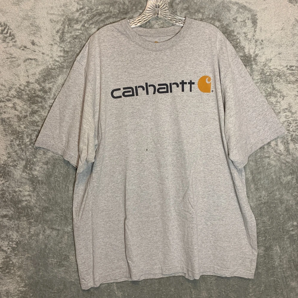Neckline: Crew Neck Vintage: No Department: Men Material: Cotton, Cotton Blend, Polyester Fabric Type: Knit Size Type: Regular Features: Double-Sided, Easy Care, Heavyweight Personalize: No Garment Care: Machine Washable Color: Gray Size: 2XL Accents: Logo Fit: Relaxed Pattern: Solid Sleeve Length: Short Sleeve Brand: Carhartt Handmade: No Type: T-Shirt Theme: Classic, Outdoor, Workwear