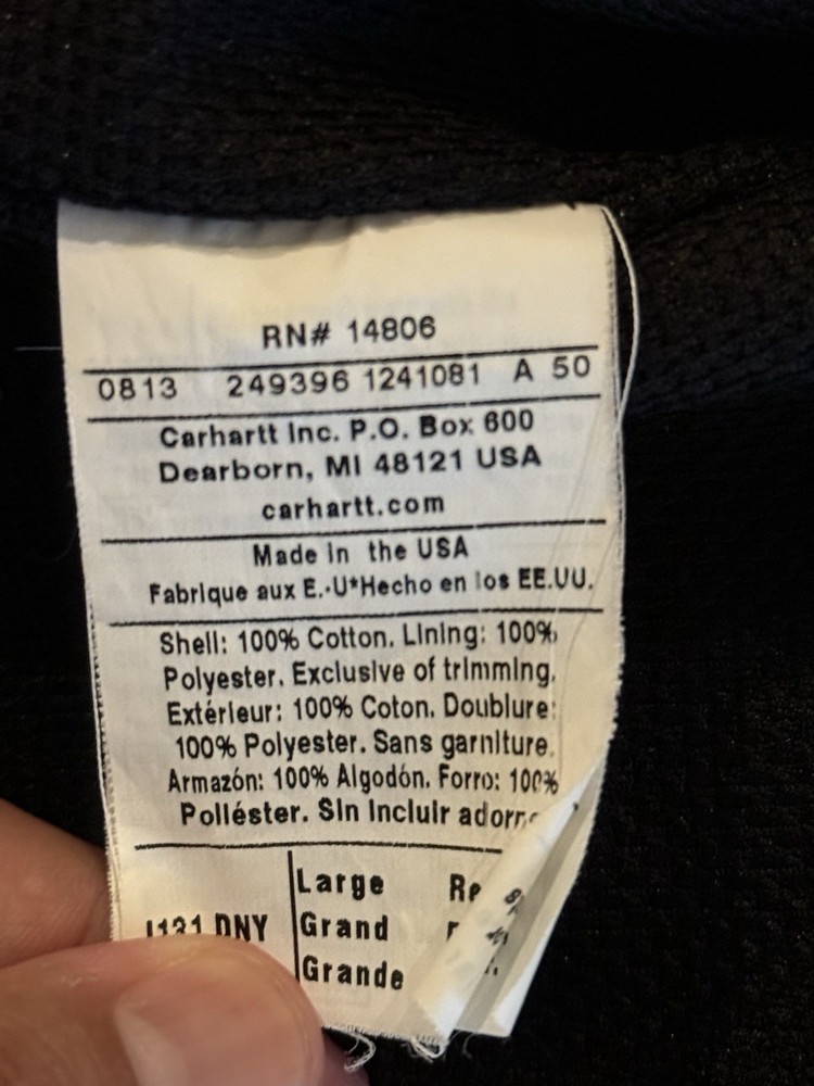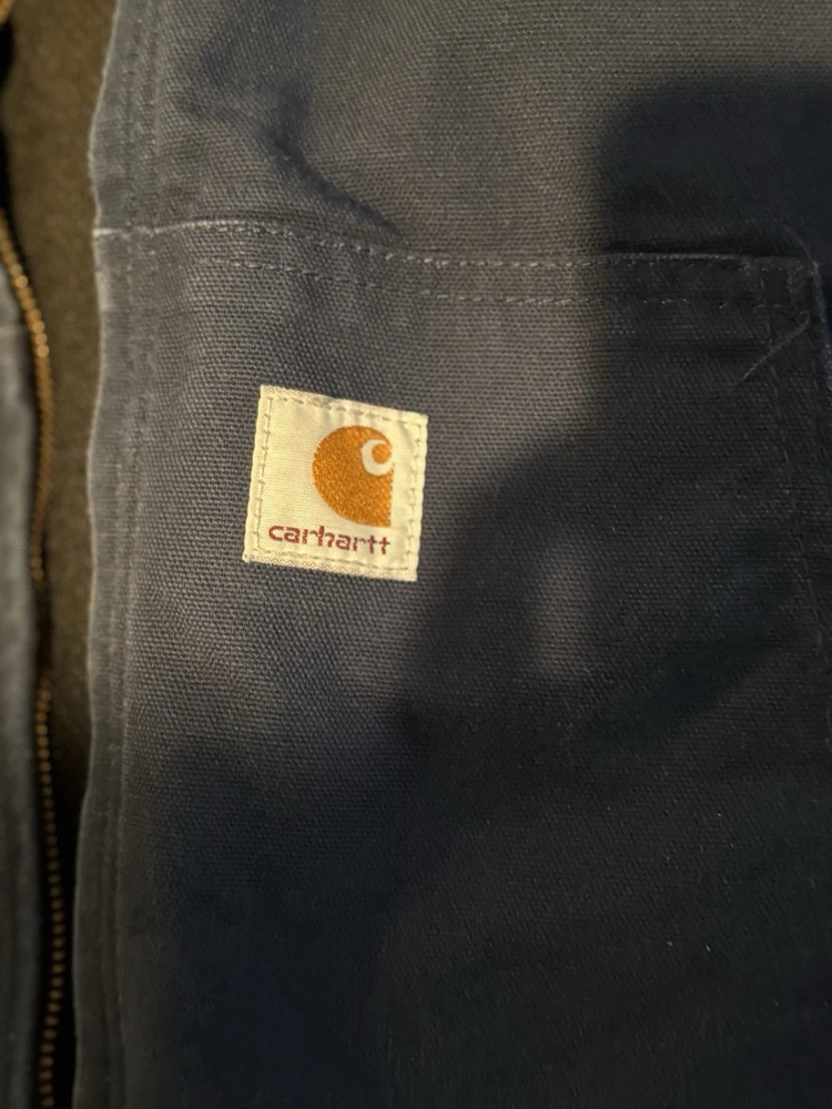 The Carhartt Jacket Men Size L in Navy Blue is a vintage USA-made bomber jacket featuring a full zip closure, making it perfect for travel, casual wear, and work. Made of durable cotton canvas with a polyester lining and insulation, this mid-length jacket is ideal for winter, fall, and spring seasons. The jacket bears the Carhartt logo and can be personalized with an embroidered company name, adding a unique touch to this classic piece of men's clothing.