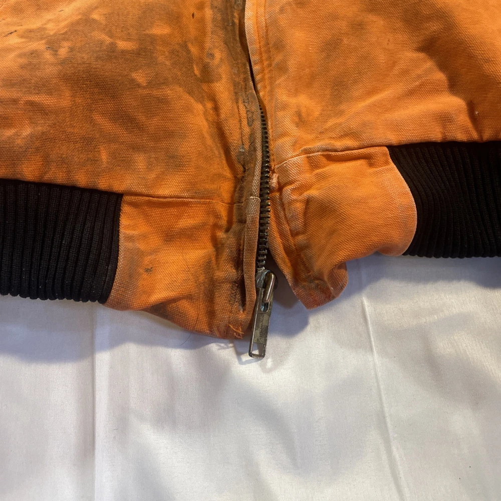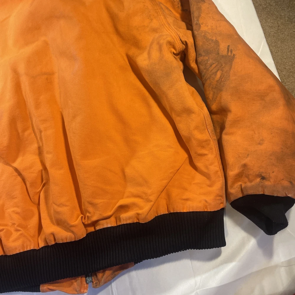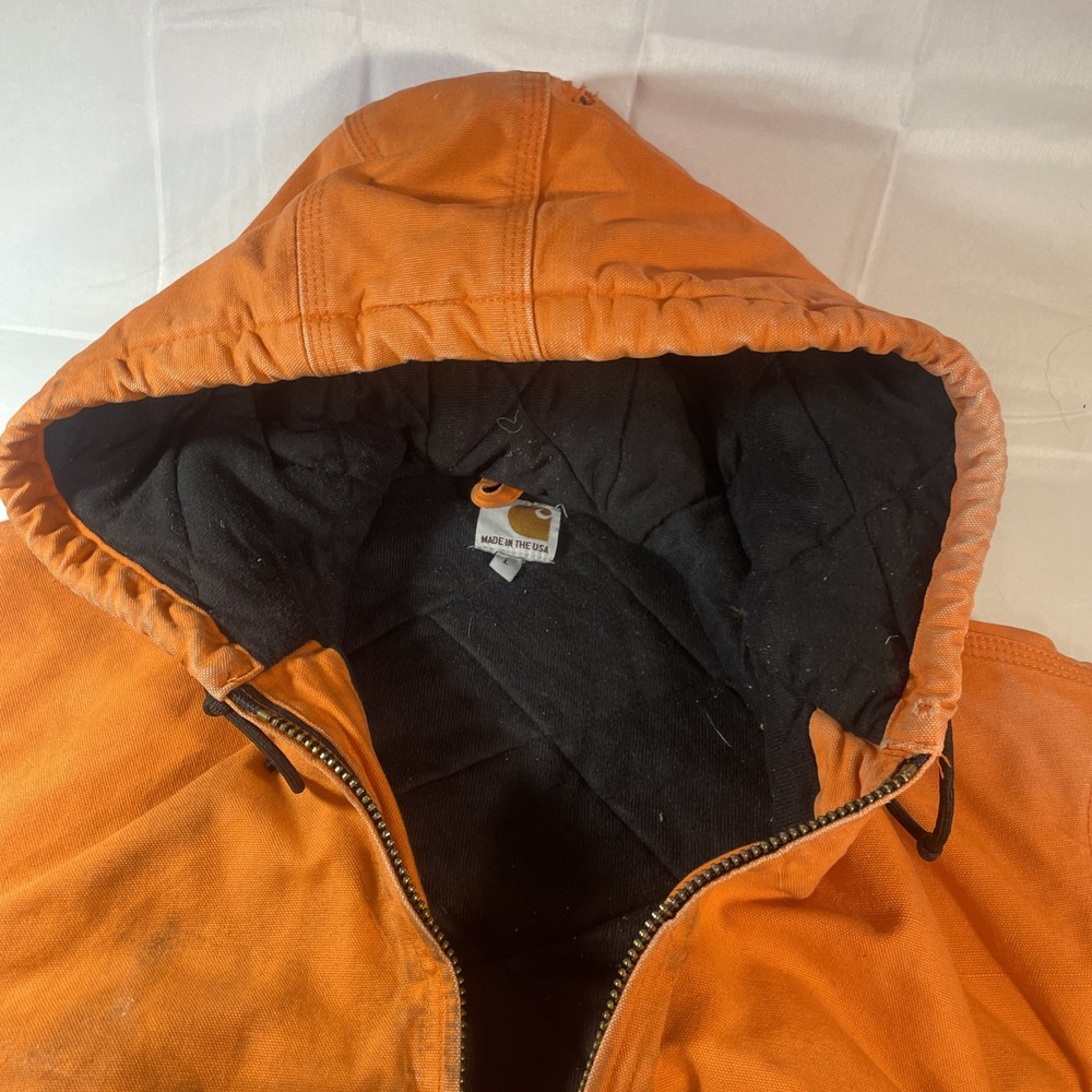 The Carhartt Men's J140 BLZ Size L Tall Orange Quilt Lined Duck Canvas Hooded Coat is a jacket suitable for casual and workwear occasions. Made with cotton canvas outer shell material and polyester lining, this jacket is insulated for added warmth. This jacket is used in fair condition, giving the exterior a classic, vintage, distressed look. The interior is in great shape. Check pictures and make your own judgment.