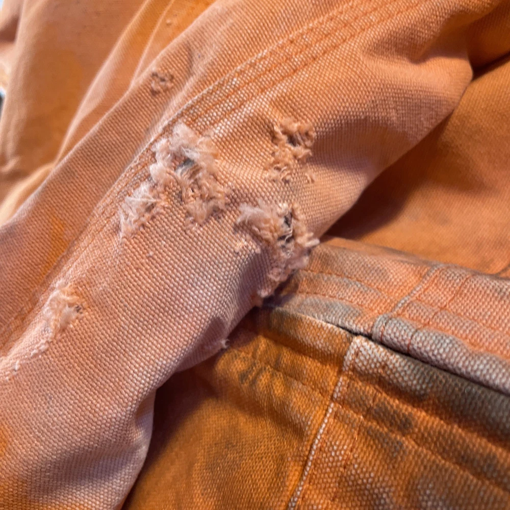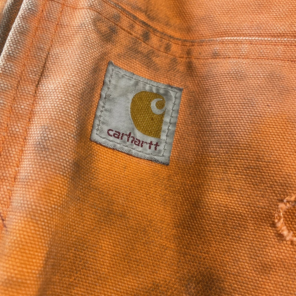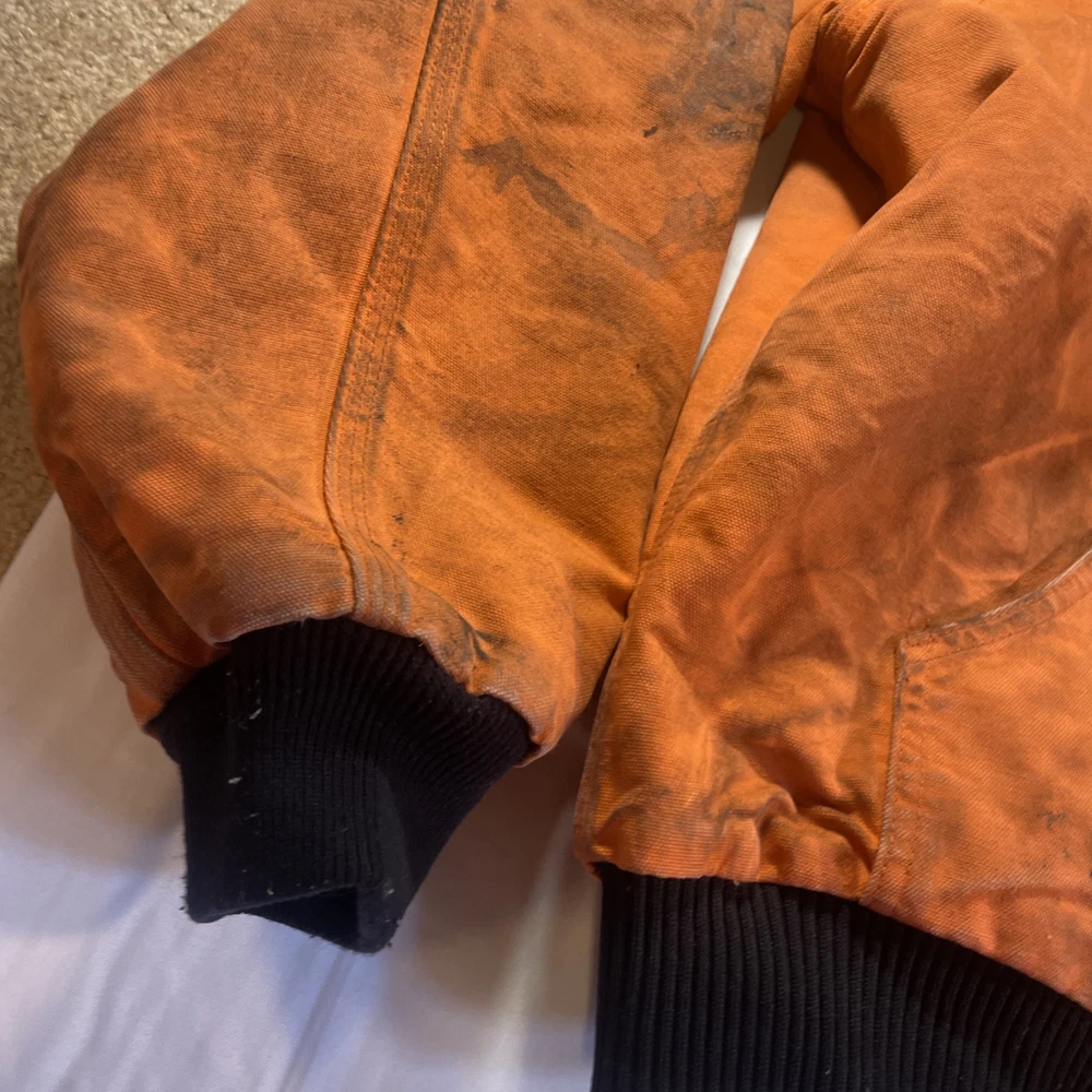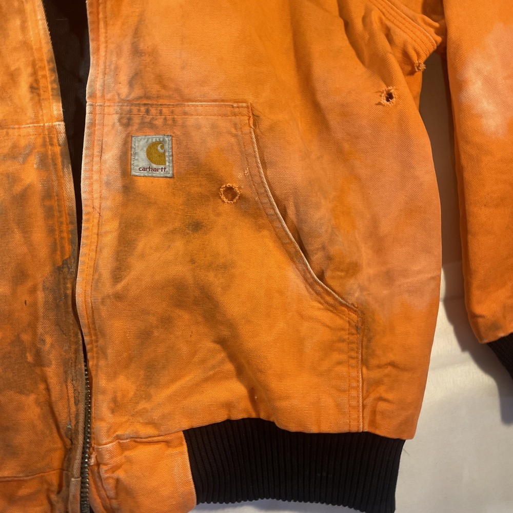The Carhartt Men's J140 BLZ Size L Tall Orange Quilt Lined Duck Canvas Hooded Coat is a jacket suitable for casual and workwear occasions. Made with cotton canvas outer shell material and polyester lining, this jacket is insulated for added warmth. This jacket is used in fair condition, giving the exterior a classic, vintage, distressed look. The interior is in great shape. Check pictures and make your own judgment.