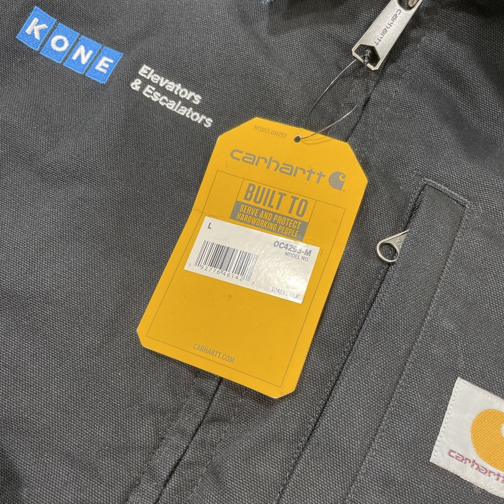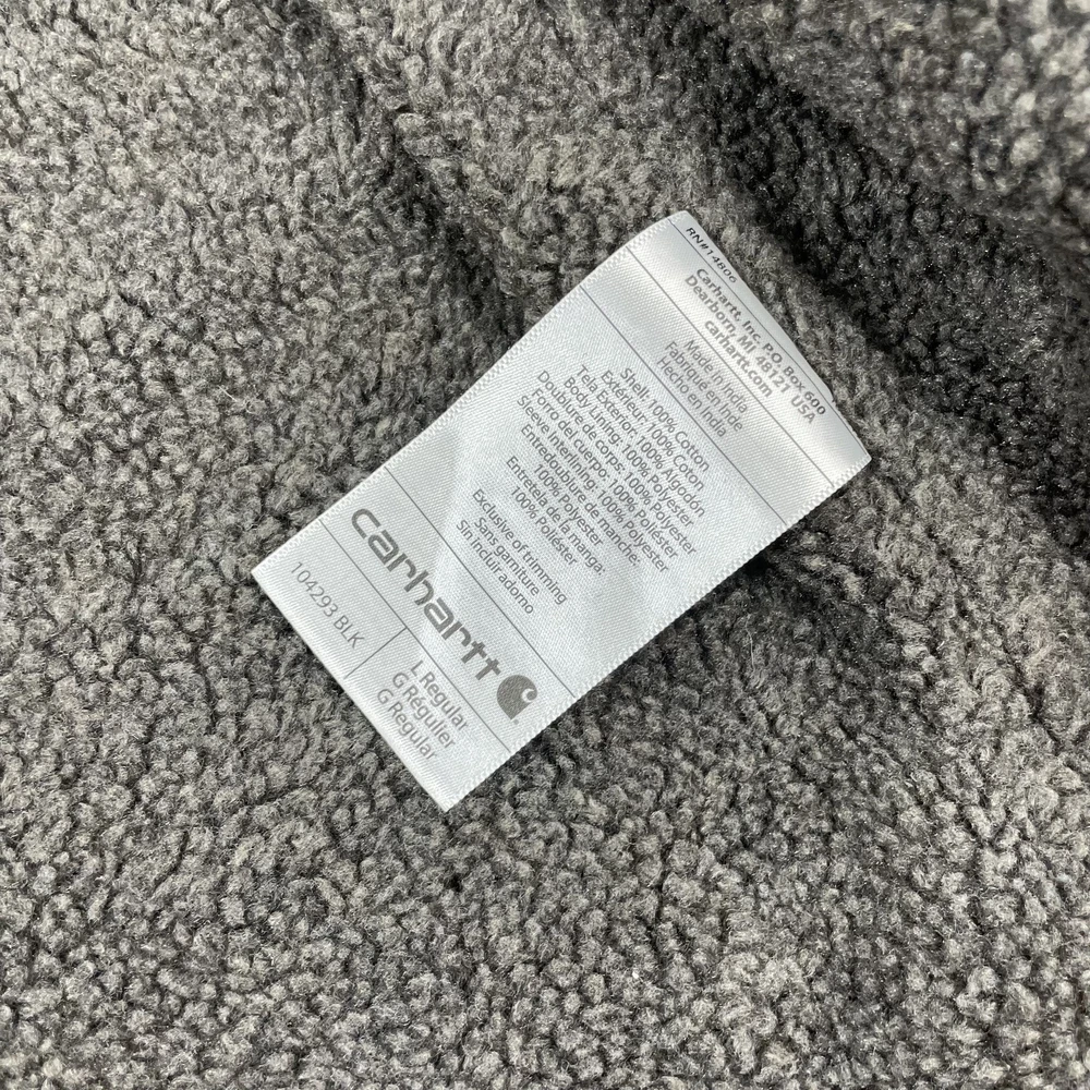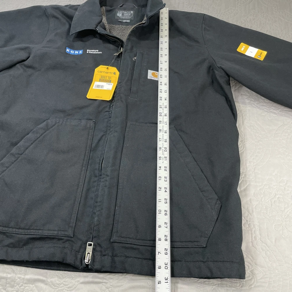 Carhartt Coat Mens Large Black Canvas Sherpa Lined Workwear Jacket Loose Fit Condition: Brand New with Tags — no visible flaws Shell: 100% cotton canvas, body lining: sherpa polyester fleece, sleeve lining: 100% quilted polyester Features full front zipper closure with Carhartt branded zipper pull Two large front pockets and one zip chest pocket Embroidery on chest: KONE Elevators & Escalators Carhartt signature logo patch on left chest pocket Heavyweight, durable canvas for reliable outdoor or worksite use Model code: OC4293-M; Tag size: Large (Mens) Loose Fit - designed for layering and ease of movement Color: Black exterior, gray sherpa fleece interior lining Approximate measurements (see photos): - Pit to pit: 26 in - Back length: 31 in - Sleeve length: 36 in Made in India