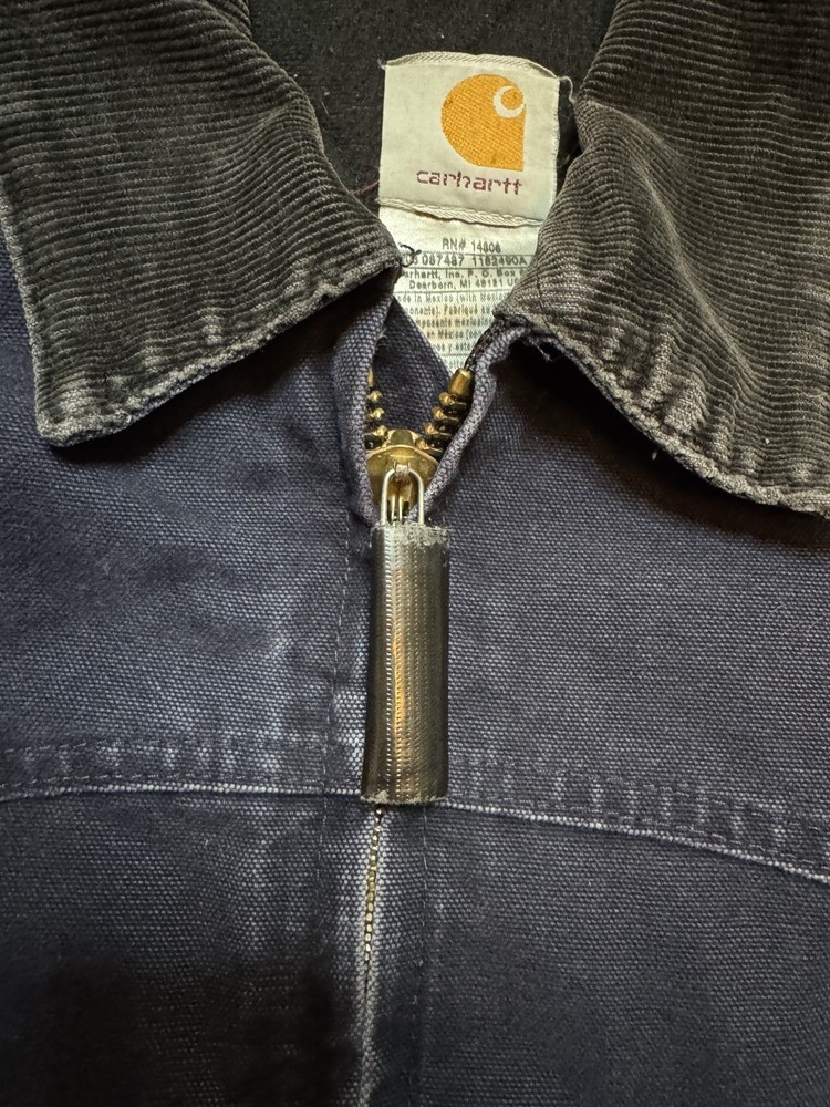 This Carhartt jacket has such a cool vintage vibe with its distressed navy blue finish and faded look. The two repair patches add character, and the replaced zipper works smoothly. Despite the repairs, it’s in great shape—super sturdy and full of rugged charm. Perfect for anyone who loves a well-worn, durable jacket with a story!