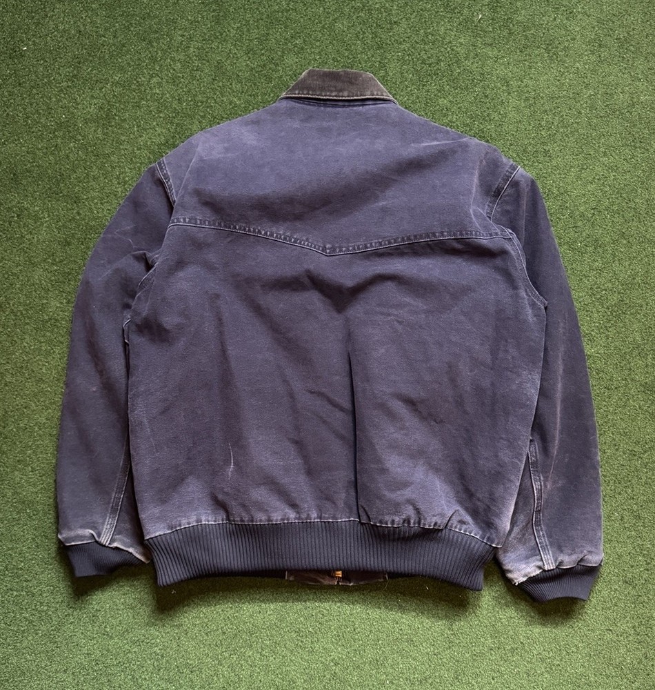 Nicely Distressed and Faded navy blue Santa fe Carhartt Jacket. Two big repair patches on the front and pictured. Replaced zipper. Great condition apart from those two repairs.