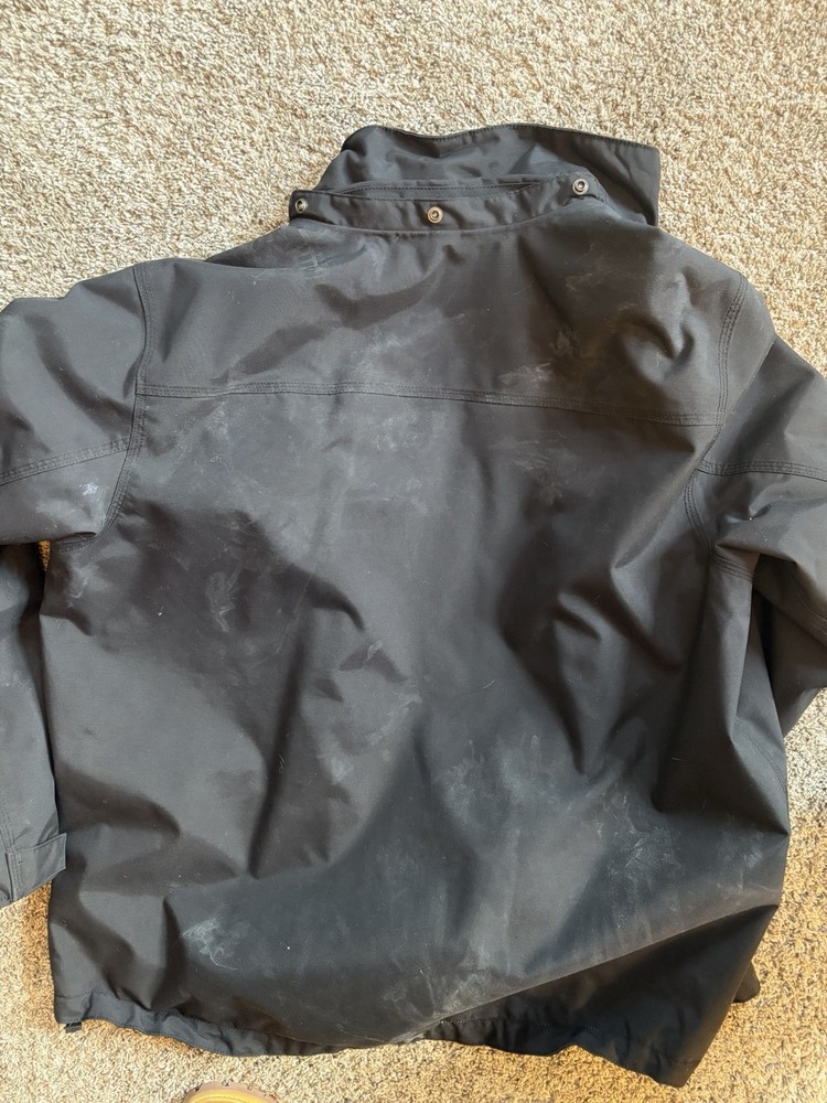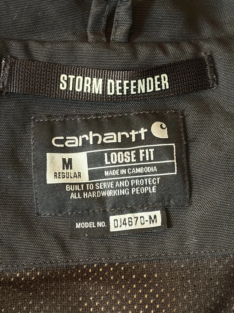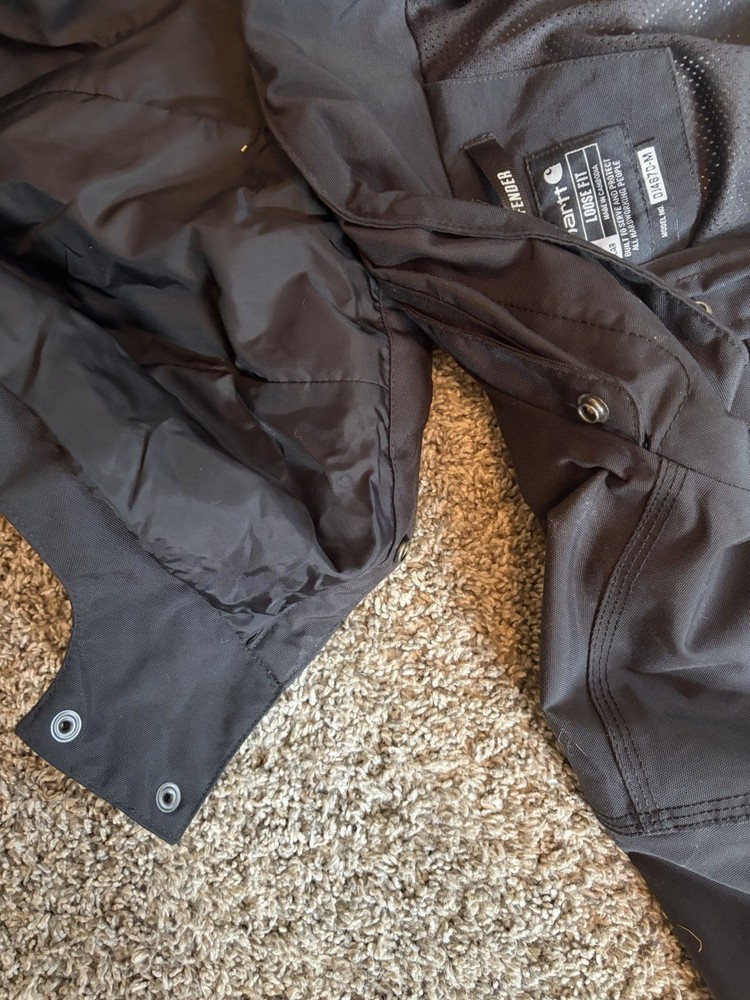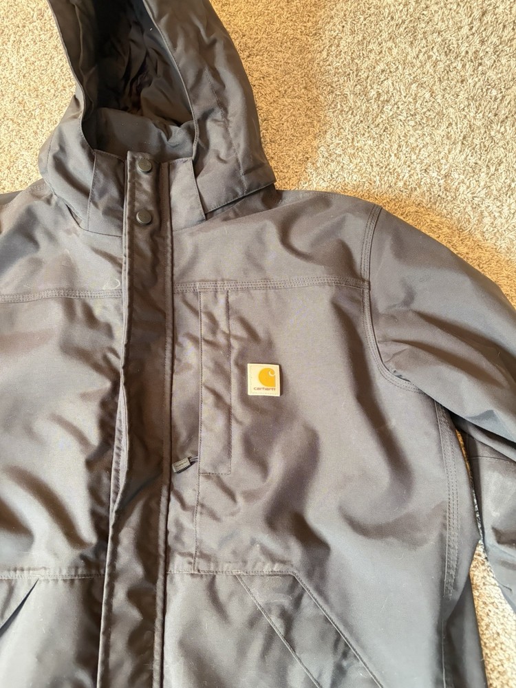 Men's Carhartt Shoreline Jacket w/ Removable Hood, 2 Way Zipper, Zippered Pockets and Button Closure Netting inside to help prevent sweat Mens Size Medium (but with a loose fit) Nylon Shell Waterproof Up To "Steady Rain" ☔️ Works Great as an outer Shell or as a Layer, depending on your needs. I've used to a fair amount of times working landscaping and snow removal and it has never failed me, although I should have purchase myself the Larger Size which is why I'm selling this one. It's broken in well, but has many hours of life and work left in it and I want to see it go to good use.
