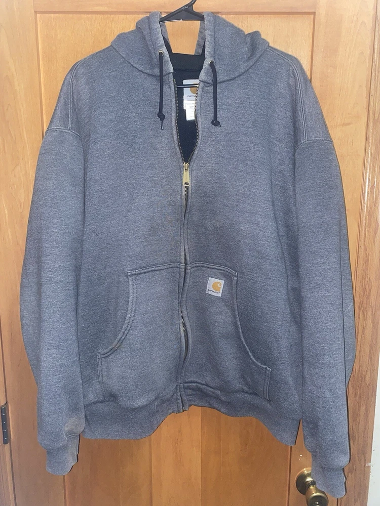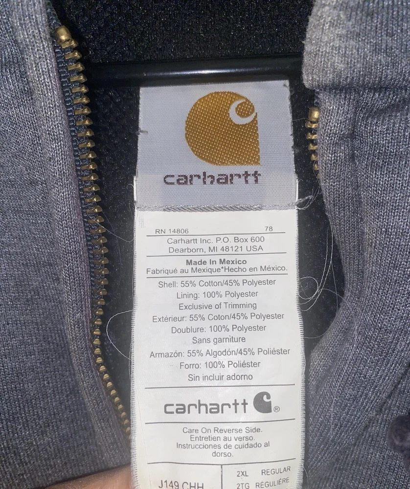 Size Type: Regular Vintage: No gtin13: Does not apply Style: Full Zip Fit: Regular Department: Men Color: Gray Features: Thermal Material: Cotton, Polyester Season: Winter, Fall, Spring Product Line: Carhartt Pattern: Solid Closure: Zip Accents: Logo, Zipper UPC: Does not apply Size: 2XL Performance/Activity: Walking, Gym & Training Sleeve Length: Long Sleeve Country/Region of Manufacture: Unknown Type: Sweatshirt Theme: Outdoor, Classic, 90s Brand: Carhartt Fabric Type: Fleece Character: None