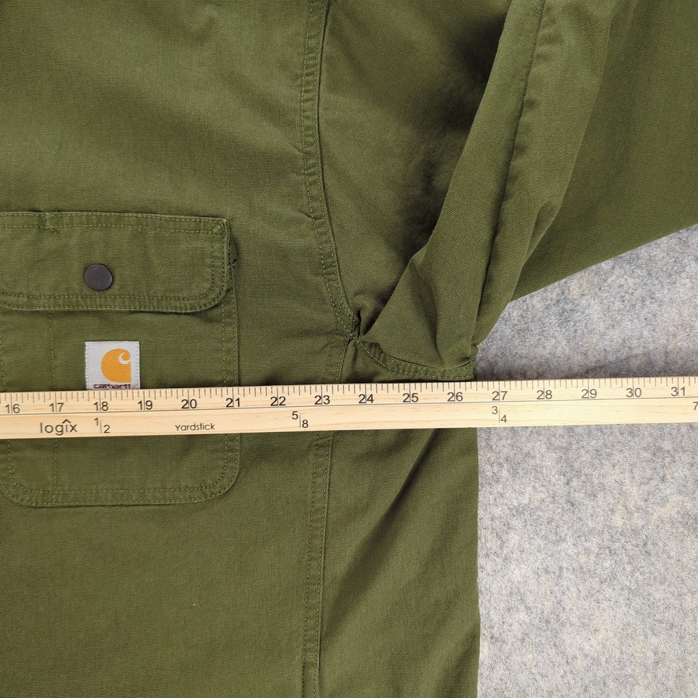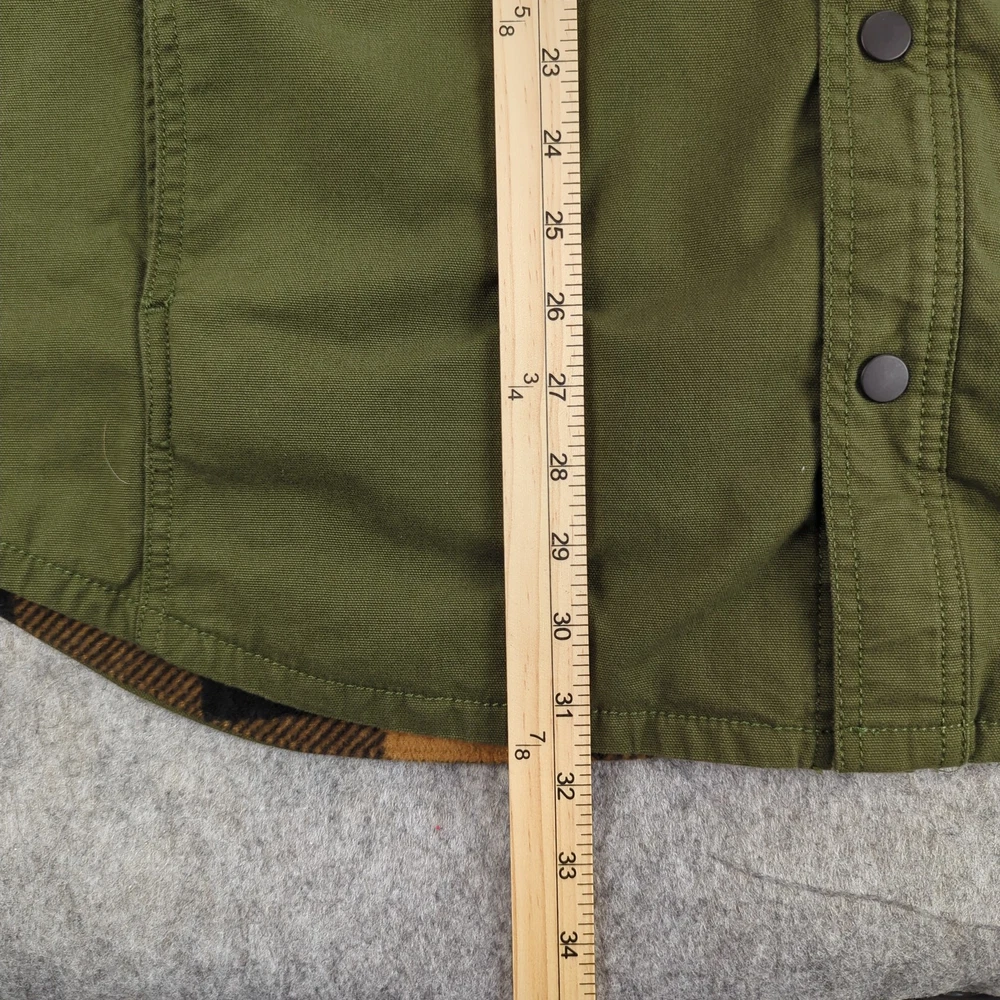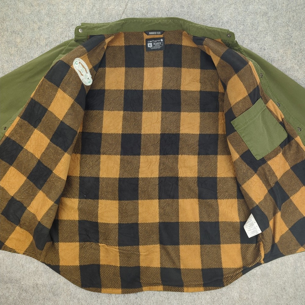 Carhartt Shirt Jacket Mens XL Green Rugged Flex Flannel Lined Workwear Condition: Gently worn, no visible flaws or stains. Light general wear only. All snaps, pockets, and stitching intact. Shell: 98% cotton, 2% elastane for rugged comfort and stretch Body/sleeve lining: 100% polyester soft brown and black buffalo plaid flannel Model: TJ5419-M (per interior label) Relaxed fit with roomy chest and body, designed for layering Snap front closure with two snap flap chest pockets and Carhartt logo patch Embroidered "ICBS Industrial Conveyor Belt Systems" patch on left chest Olive green exterior with contrast black and orange plaid lining Side-entry hand pockets, interior chest pocket for organization Machine washable. Tag says: Machine wash warm with like colors, tumble dry low, do not use fabric softeners. Care instructions and full material breakdown on attached tag Tag size: XL (Mens) Made in India Production: Fall 2022 season