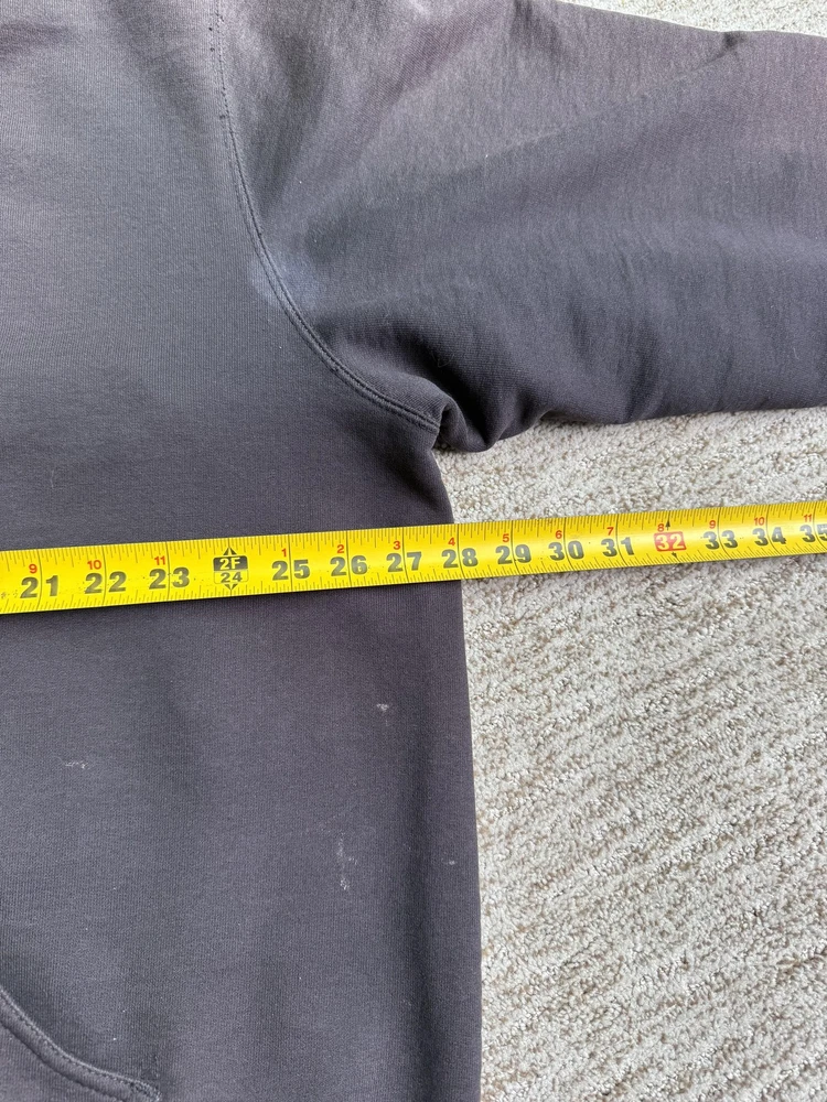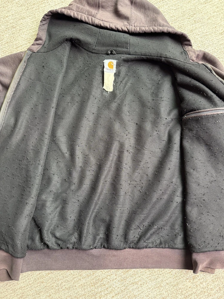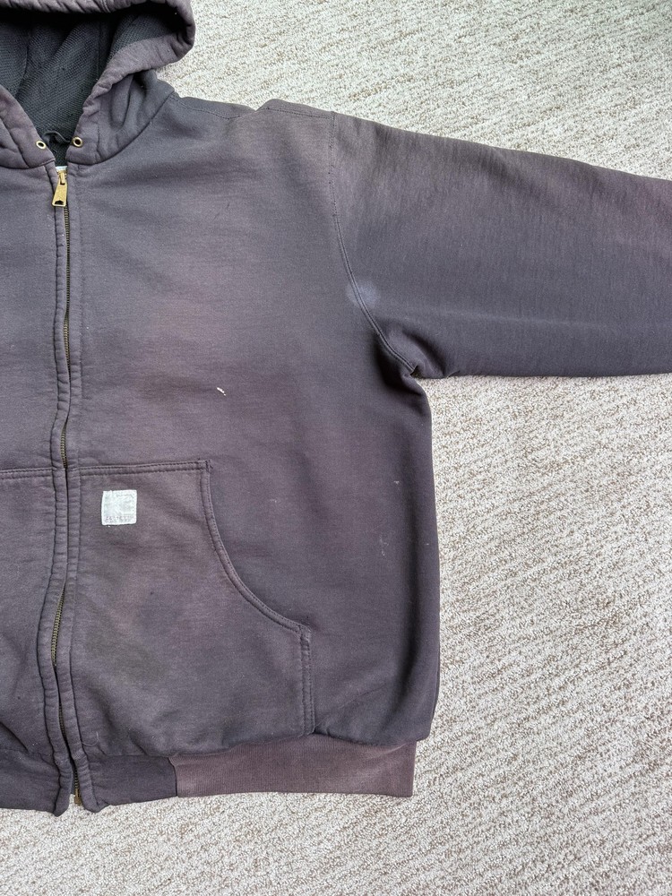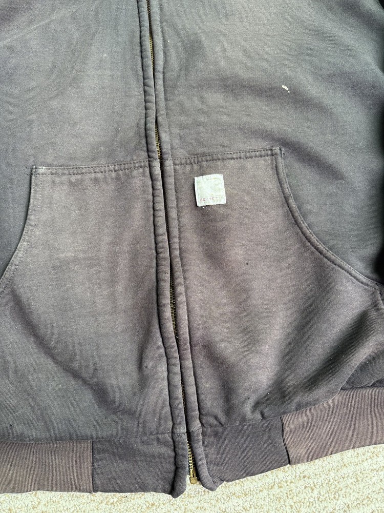 Carhartt Hoodie Mens XL Black Full Zip Workwear Heavyweight Distressed Condition: Fair used condition with heavy wear and distressing throughout. Visible fading across the exterior. Several small white paint or bleach marks and scattered stains/spots to front, pocket, and sleeves. Noticeable pilling and lint on the inner mesh lining. Significant wear at both sleeve cuffs including fraying and a small hole. Interior mesh shows a hole near the zipper seam on one side. Please see photos for all details and closeups of wear and flaws. 80% cotton / 20% polyester (based on typical Carhartt fleece blend, tag is heavily faded and hard to fully read) Carhartt patch logo on front pocket Heavyweight hooded sweatshirt style with brass Carhartt-branded zipper Two front hand-warmer pockets Ribbed/cuffed sleeves and waistband Color: Black (faded) Tag size: 2XL (Mens) – see photos for measurement references Approximate flat measurements (for fit reference): - Chest (pit to pit): 28" - Length (top of shoulder to bottom hem): 28" - Sleeve length (shoulder seam to cuff): 25" Made in the USA (per tag details and Carhartt era/label style) Ideal for grunge, workwear, raw/heritage style, or everyday use in cold weather