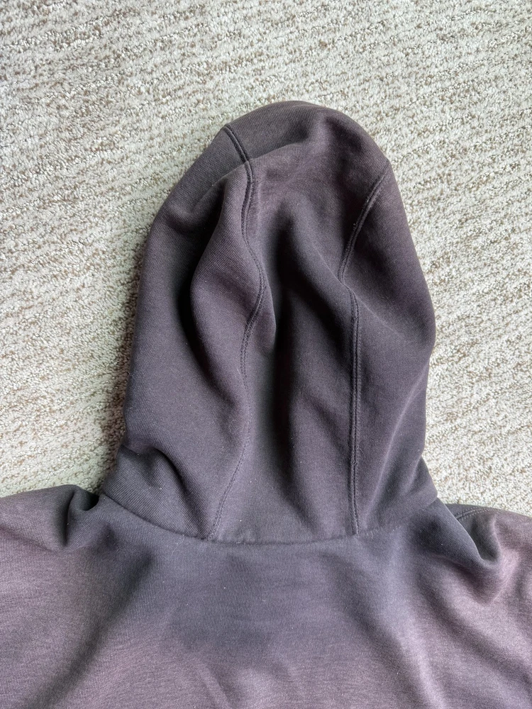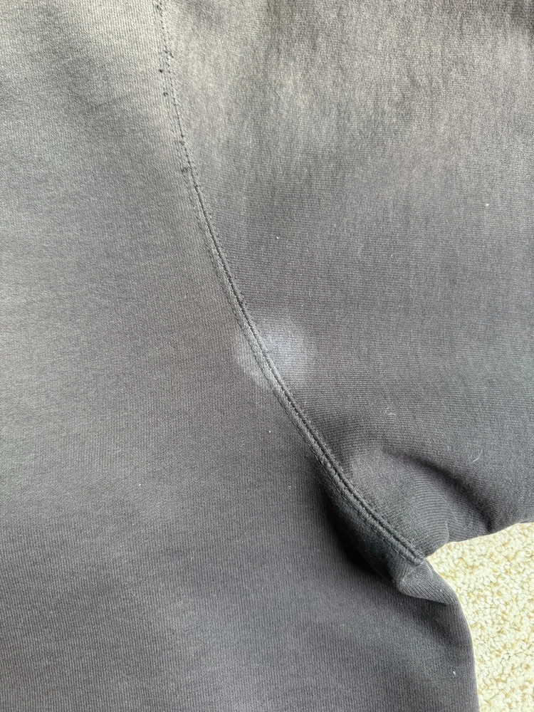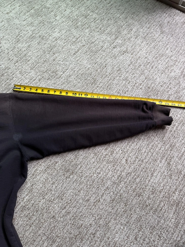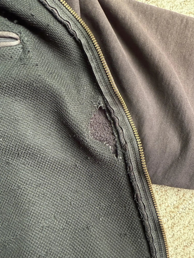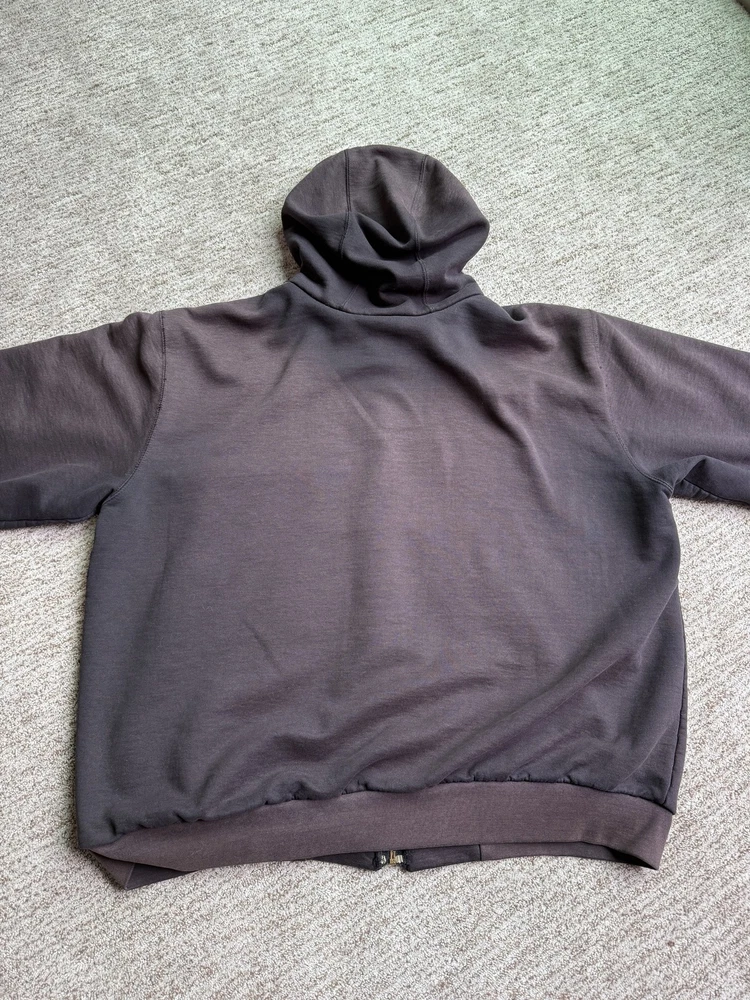 Carhartt Hoodie Mens XL Black Full Zip Workwear Heavyweight Distressed Condition: Fair used condition with heavy wear and distressing throughout. Visible fading across the exterior. Several small white paint or bleach marks and scattered stains/spots to front, pocket, and sleeves. Noticeable pilling and lint on the inner mesh lining. Significant wear at both sleeve cuffs including fraying and a small hole. Interior mesh shows a hole near the zipper seam on one side. Please see photos for all details and closeups of wear and flaws. 80% cotton / 20% polyester (based on typical Carhartt fleece blend, tag is heavily faded and hard to fully read) Carhartt patch logo on front pocket Heavyweight hooded sweatshirt style with brass Carhartt-branded zipper Two front hand-warmer pockets Ribbed/cuffed sleeves and waistband Color: Black (faded) Tag size: 2XL (Mens) – see photos for measurement references Approximate flat measurements (for fit reference): - Chest (pit to pit): 28" - Length (top of shoulder to bottom hem): 28" - Sleeve length (shoulder seam to cuff): 25" Made in the USA (per tag details and Carhartt era/label style) Ideal for grunge, workwear, raw/heritage style, or everyday use in cold weather