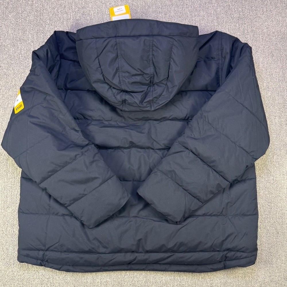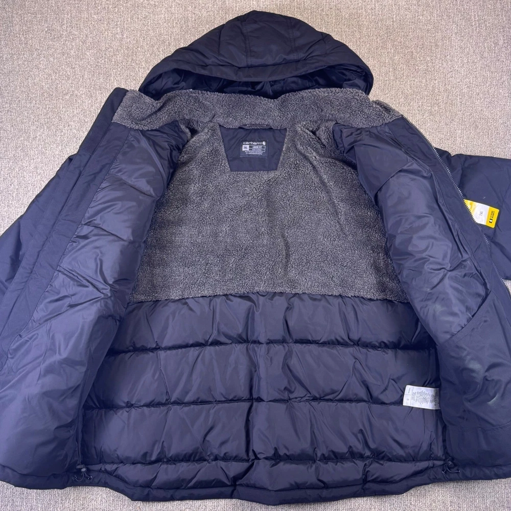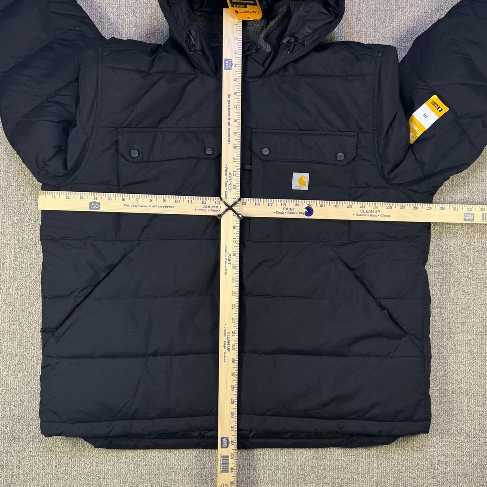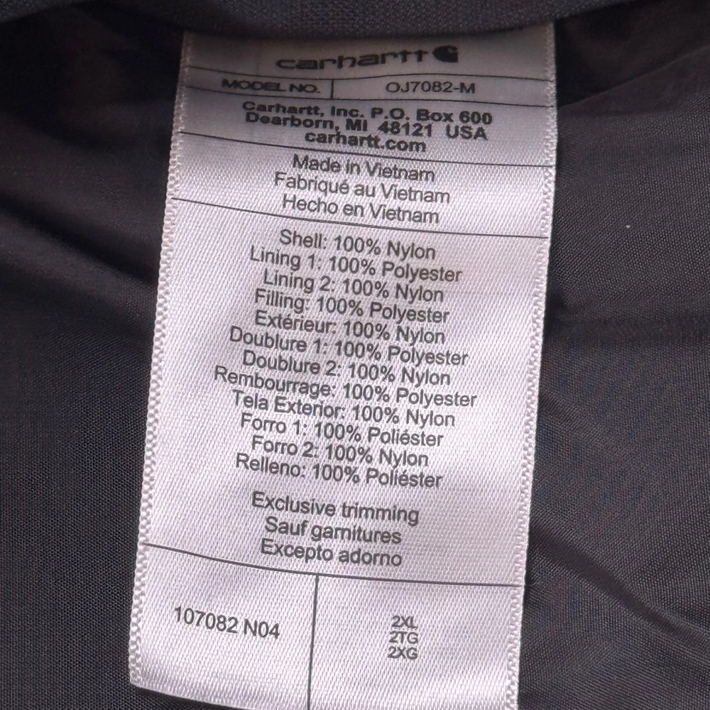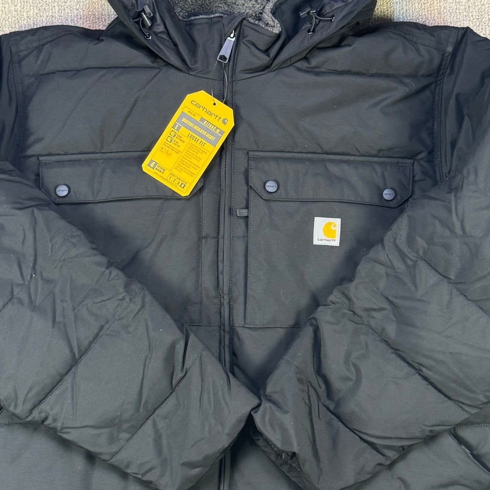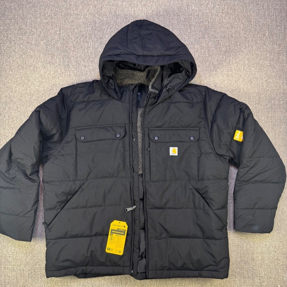 Outer Shell Material: Polyester Lining Material: Polyester Size Type: Regular Pattern: Solid Theme: cold weather, outdoor, durable, streetwear, gorpcore Fit: Relaxed Country of Origin: Vietnam Chest Size: 58 in Jacket/Coat Length: Mid-Length Season: Fall, Winter Department: Men Collar Style: Stand-Up Vintage: No Features: Hooded, Padded, Lined, Zipped Pockets, Water Resistant Accents: Quilted, Logo, Zipper Personalize: No Type: Jacket Handmade: No Size: 2XL Insulation Material: Polyester Fabric Type: Fleece Occasion: Workwear, Casual Closure: Zip, Snap Brand: Carhartt Color: Black Style: Puffer Jacket