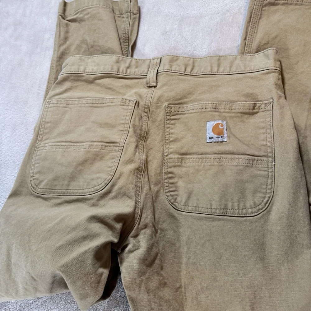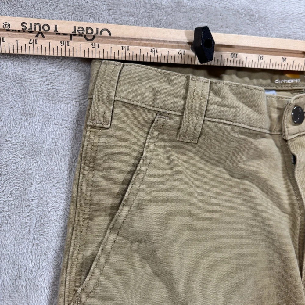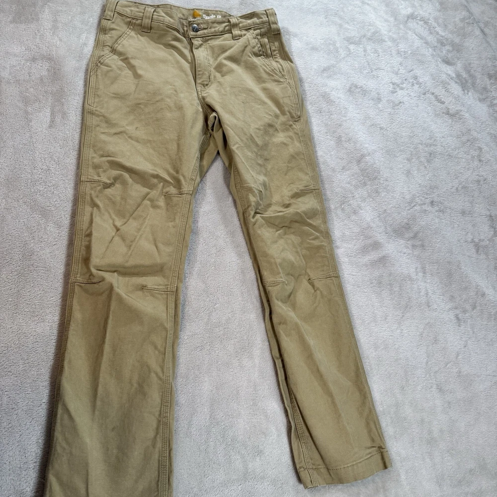 Experience durability and comfort with these Carhartt pants in a classic khaki beige color. Designed for men, these work pants feature a straight fit with a mid-rise waist, flat front, and button/zip closure. Made from a sturdy canvas material with added stretch, these pants are perfect for casual or workwear occasions and easy to care for with machine washing. With plenty of pockets for your essentials, these pants also include accents such as the Carhartt logo and are suitable for all seasons. Whether you're working outdoors or indoors, these pants will keep you comfortable and stylish all day long. Don't miss out on this reliable and versatile addition to your wardrobe!