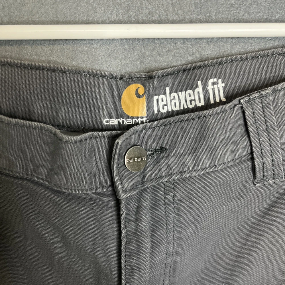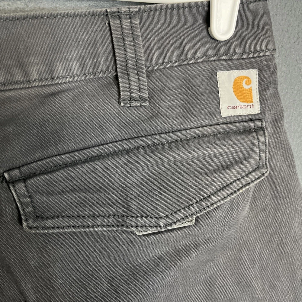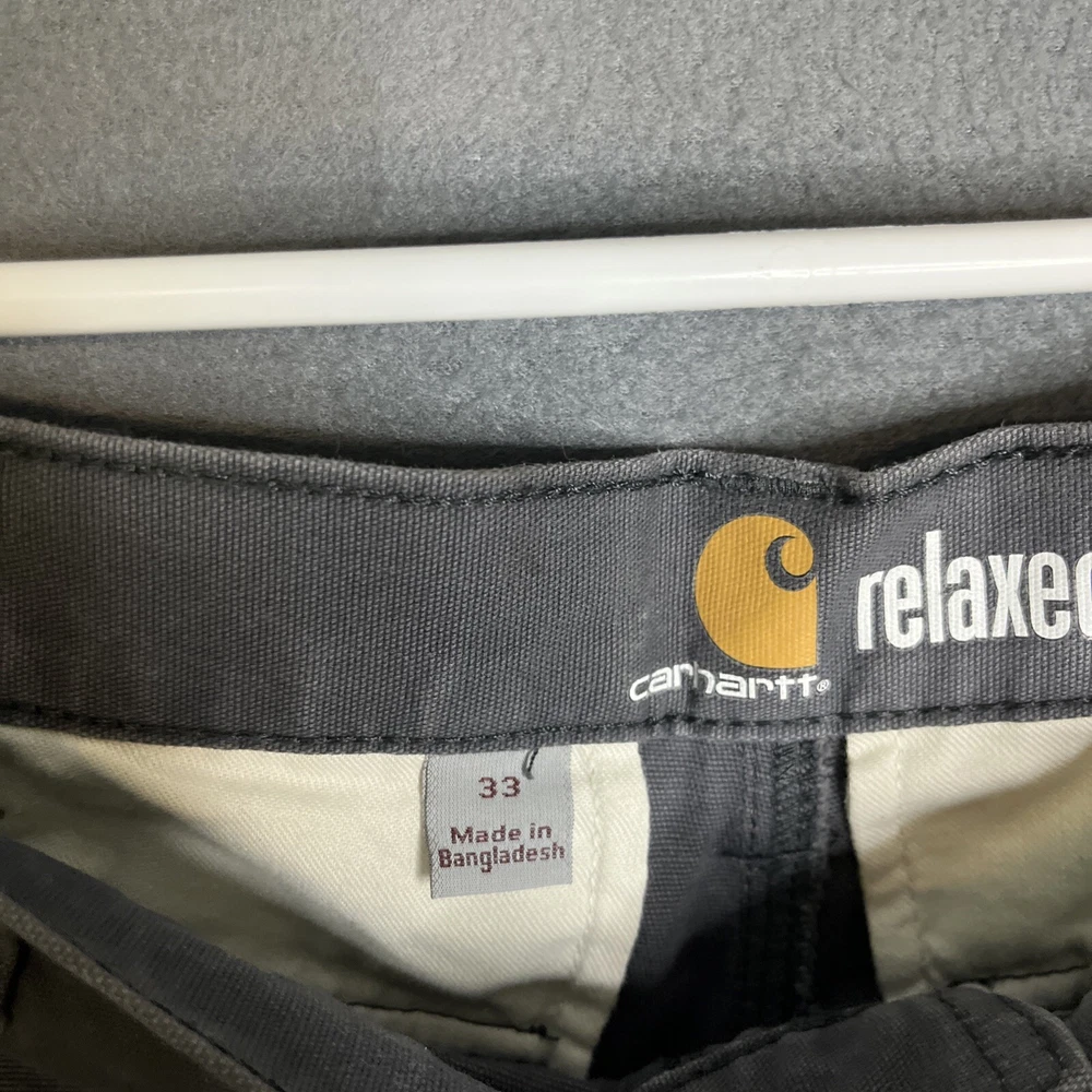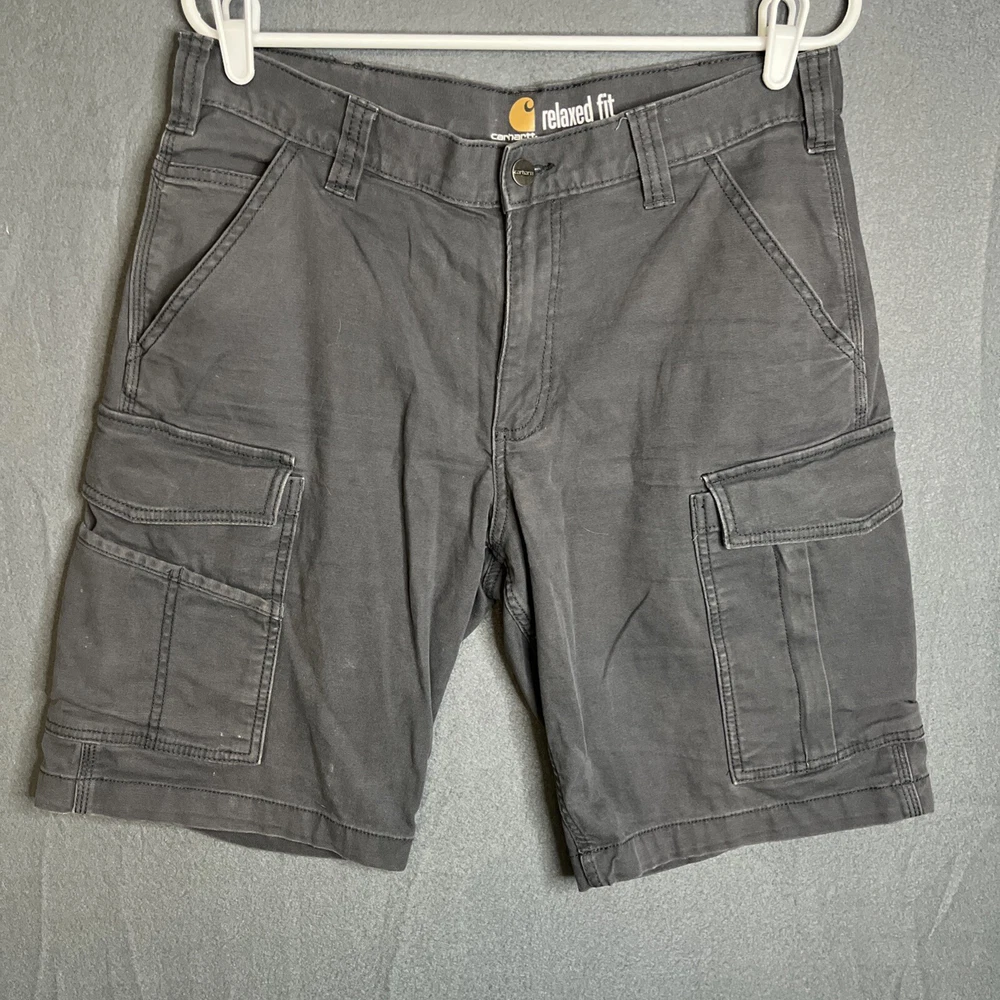 Garment Care: Machine Washable Vintage: No Occasion: Casual, Workwear Material: Cotton, Cotton Blend, Spandex Theme: Outdoor Style: Cargo Color: Gray Pocket Type: Cargo Pocket Department: Men Inseam: 10 in Accents: Logo, Zipper, Button Features: Pockets Waist Size: 33 in Country/Region of Manufacture: Bangladesh Size Type: Regular Brand: Carhartt Size: 33 Handmade: No Pattern: Solid Fabric Wash: Medium Fit: Relaxed Personalize: No Rise: Mid (10-12 in) Closure: Zip Front Type: Flat Front Season: Fall, Spring, Summer Fabric Type: Canvas