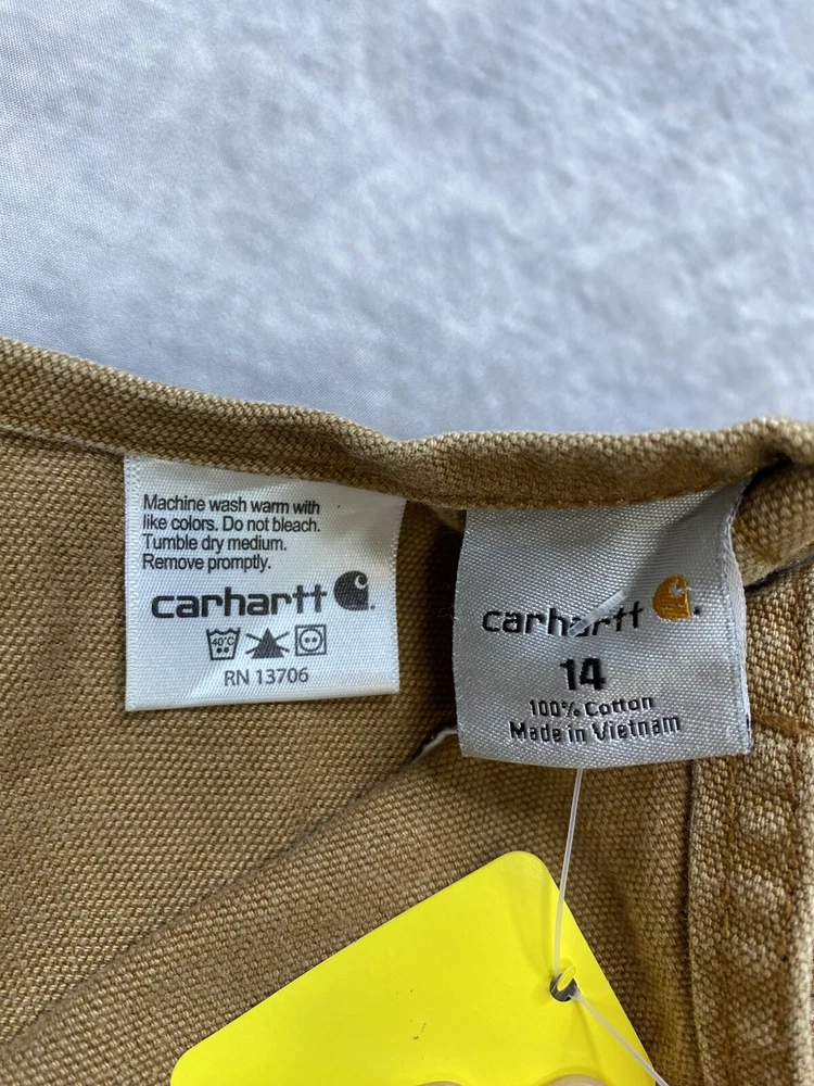 Features: Pockets Vintage: No Size: 14 Fabric Type: Canvas Inseam: 24 in Department: Boys Closure: Button, Buckle Country/Region of Manufacture: Vietnam Performance/Activity: Walking, Hiking Character: Boy Waist Size: 33 in Material: Canvas Occasion: Casual, Activewear Style: Overalls Type: Pants MPN: RN 13706 Color: Brown Brand: Carhartt