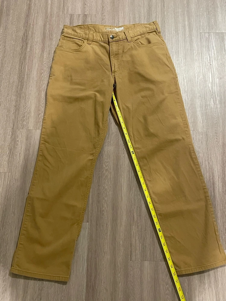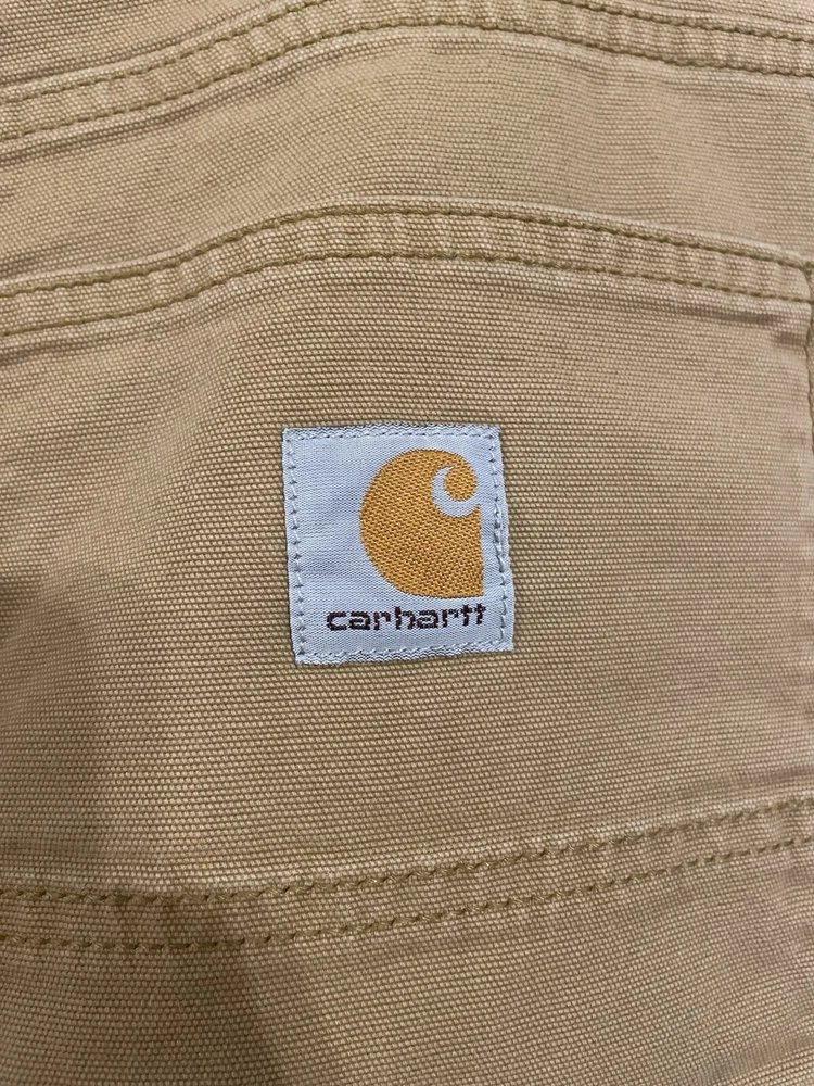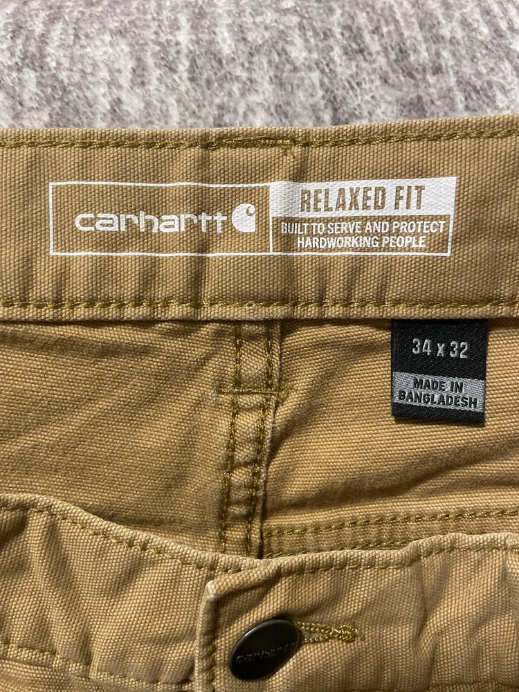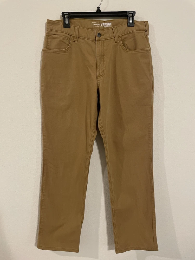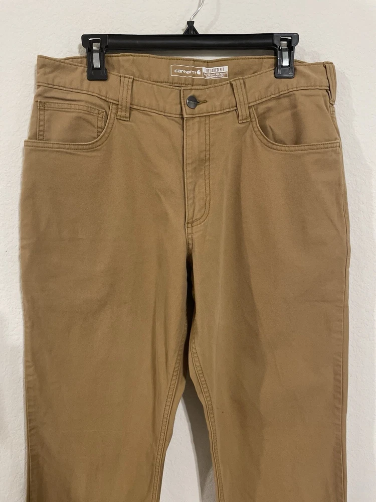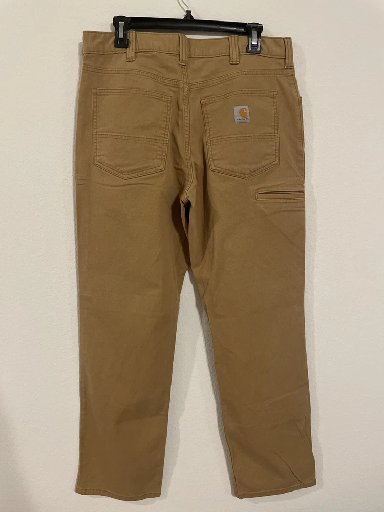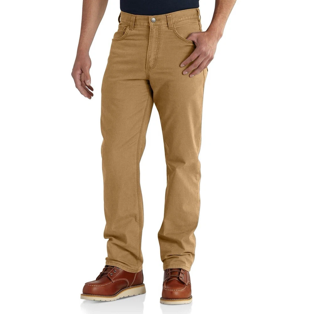 The Carhartt Rugged Flex Rigby Dungaree Work Pants are designed for men in size 34W x 32L. These tan pants feature a relaxed fit with a straight leg style and a mid-rise waist. Made from a blend of cotton and spandex, they offer stretch for comfort and flexibility during workwear activities. The pants have a flat front with a zip closure and button accents, along with cargo and 5-pocket design for storage. Ideal for outdoor and utility work, they are machine washable and part of Carhartt's Rugged Dungaree product line.