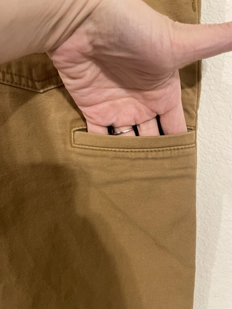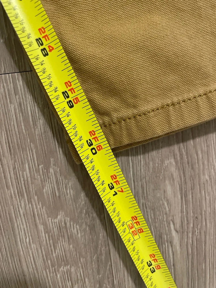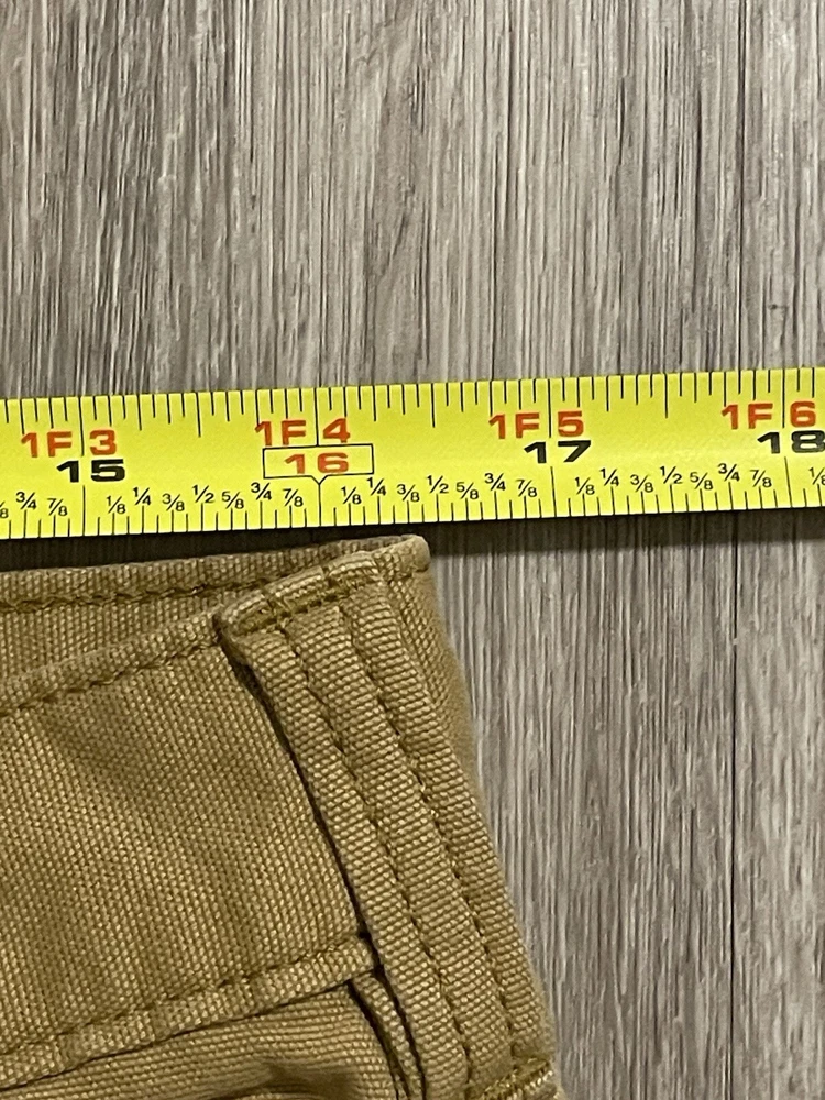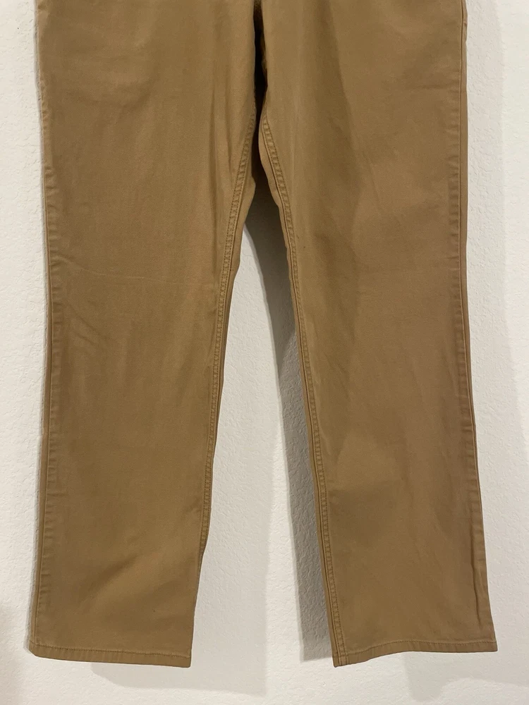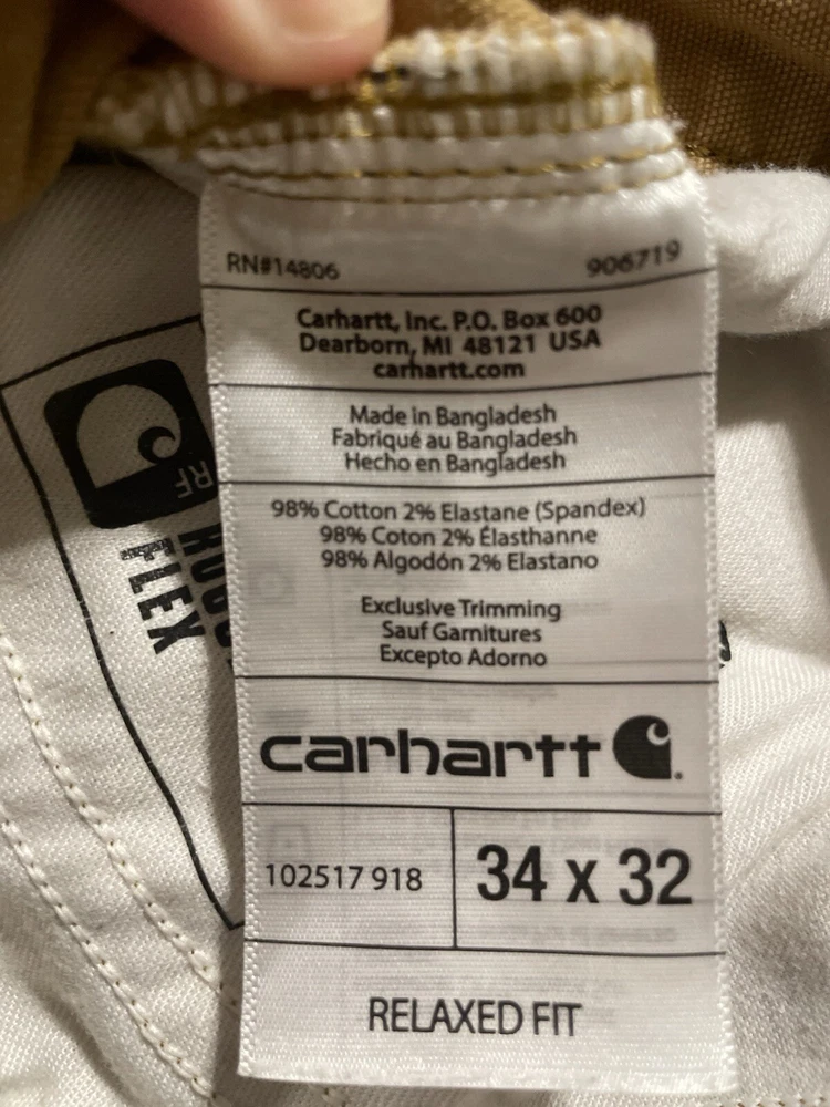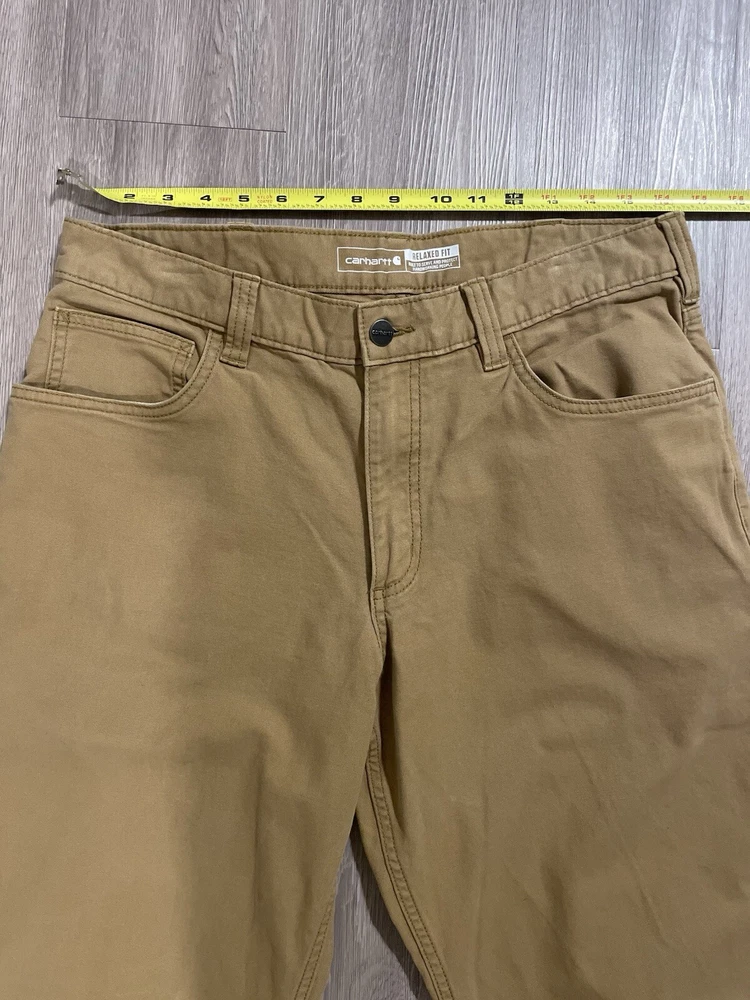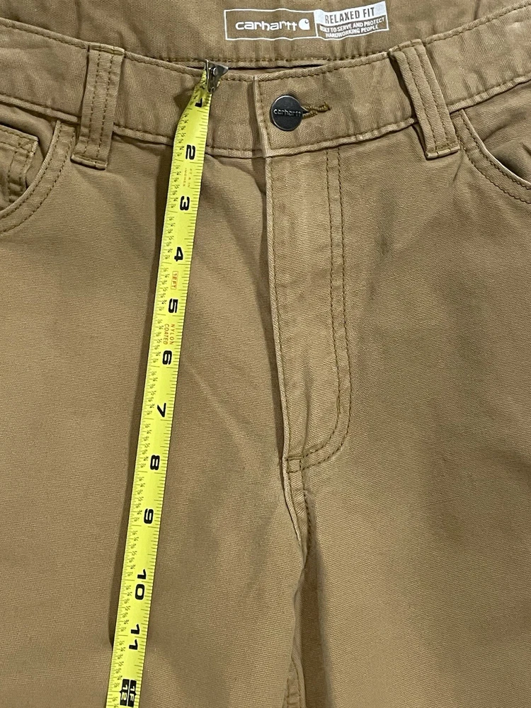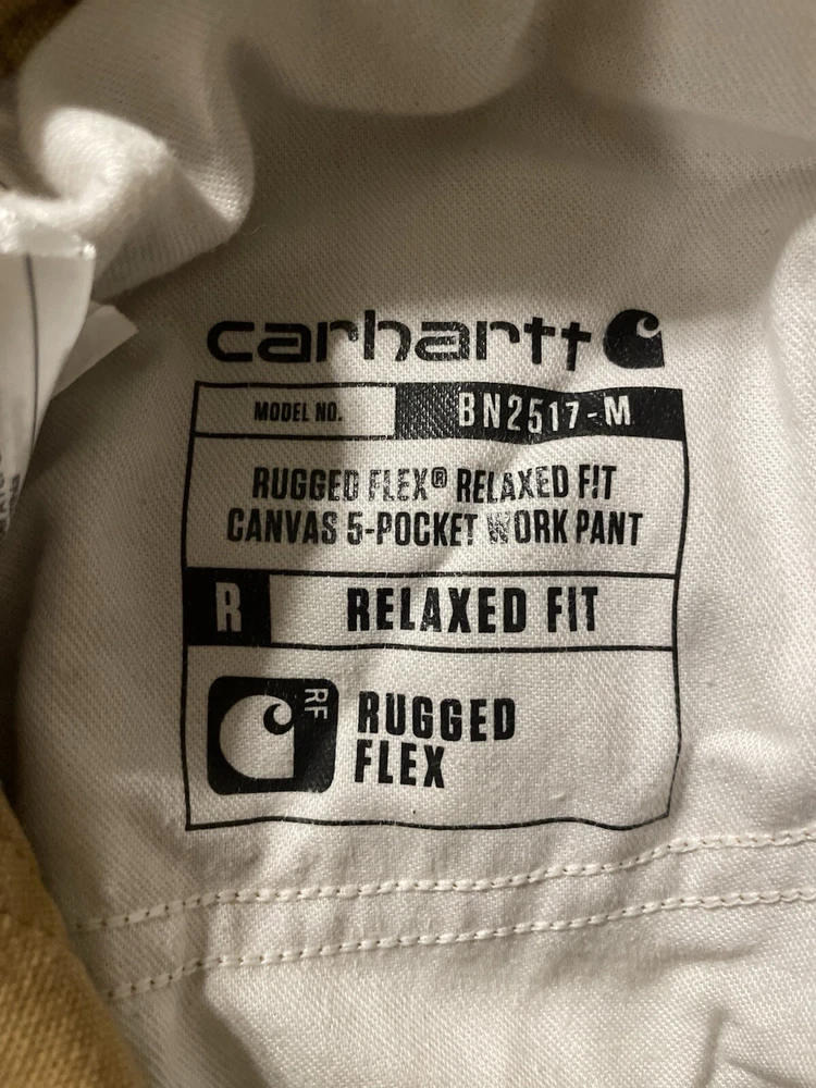 The Carhartt Rugged Flex Rigby Dungaree Work Pants are designed for men in size 34W x 32L. These tan pants feature a relaxed fit with a straight leg style and a mid-rise waist. Made from a blend of cotton and spandex, they offer stretch for comfort and flexibility during workwear activities. The pants have a flat front with a zip closure and button accents, along with cargo and 5-pocket design for storage. Ideal for outdoor and utility work, they are machine washable and part of Carhartt's Rugged Dungaree product line.