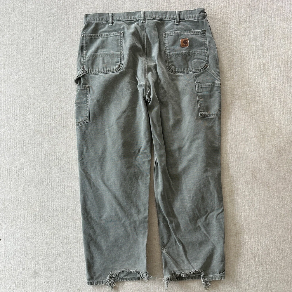 Carhartt Vintage Men's Distressed Faded Olive Green Grey Gray Double Knee Workwear Canvas Pants / Jeans Size: 40x32 B136 MDS 100% Cotton, Made in Mexico Vintage fading and distressing, please see photos for all details and measurements!