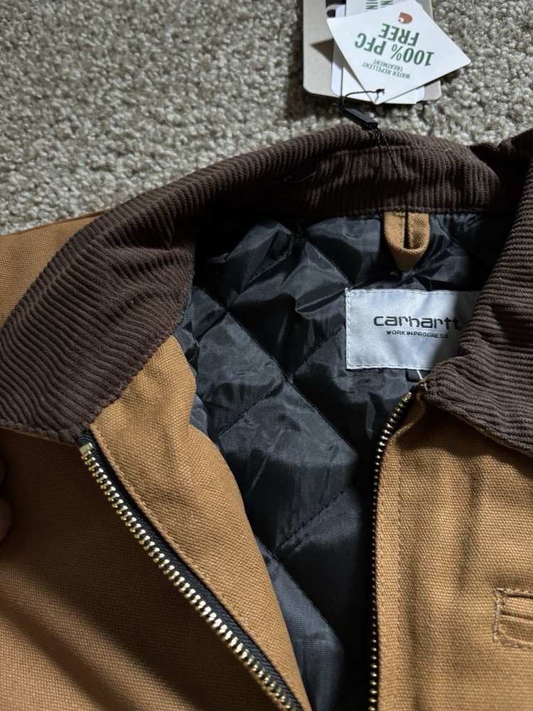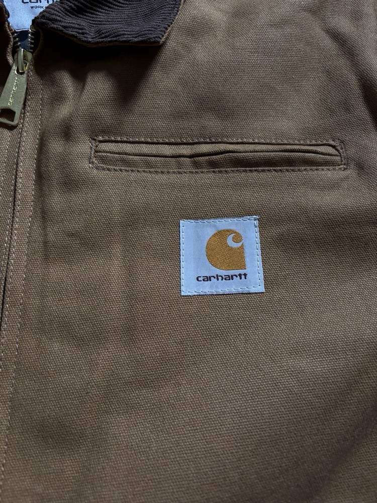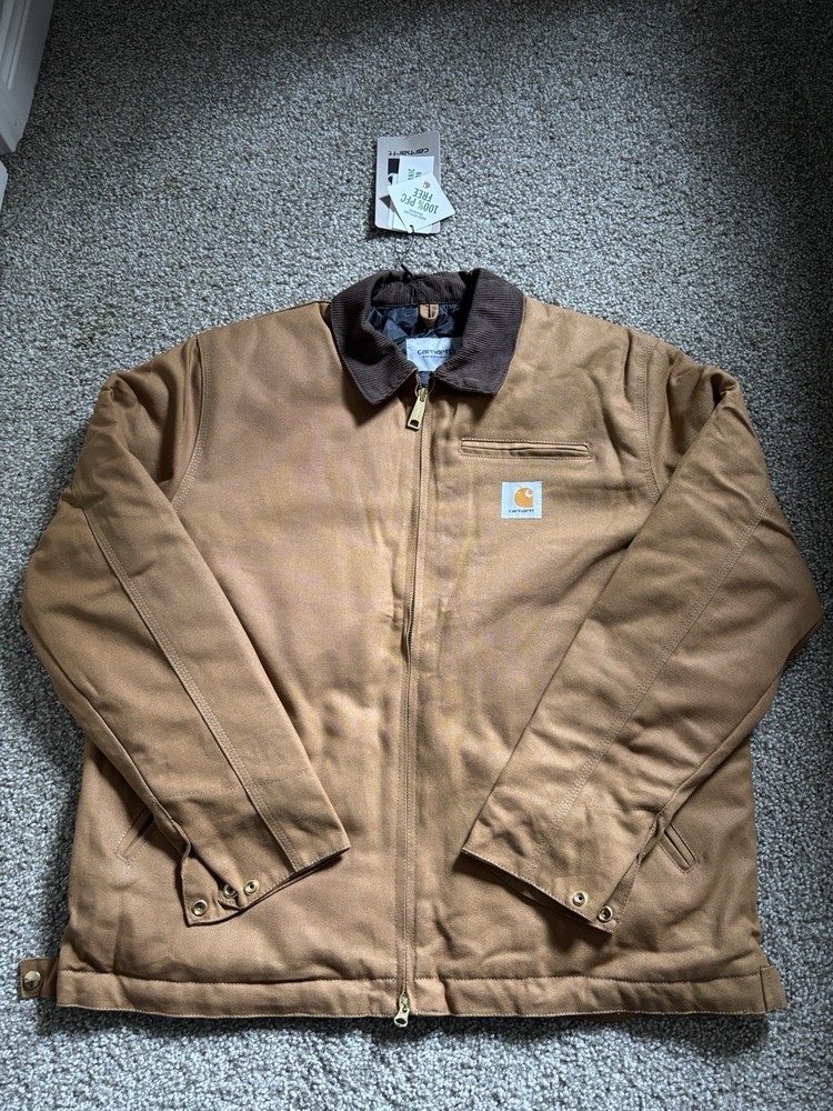 Brand new with tags 100% authentic Carhartt WIP Size Large (Men’s) Carhartt WIP Detroit Jacket in classic Hamilton Brown featuring a quilted insulated interior lining for colder weather. Built from heavyweight cotton canvas with the signature corduroy collar and structured Work In Progress fit. Details: • Heavyweight cotton canvas shell • Quilted insulated lining (warm / winter ready) • Corduroy collar • Gold-tone full zip closure • Zip chest pocket • Dual hand pockets • Signature Carhartt WIP square label • Modern tailored WIP silhouette This is the warmer Detroit model — ideal for fall and winter while keeping the timeless workwear look. Ships next business day. Message with any questions