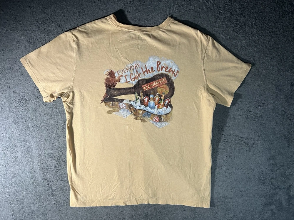 Get ready to rock the Caribbean vibes with this stylish Everyday I Got The Brews graphic tee in tan color. This Y2K-inspired shirt features a solid pattern with a crew neckline and short sleeves, perfect for the tropical paradise or beach day out. The shirt is made of comfortable cotton knit fabric, which is machine washable for easy care. The shirt's design is adorned with a parrot character and the Caribbean logo, giving it a unique touch. This regular-fit shirt is available in size L, suitable for men who love nature, beach, and nautical themes. This shirt is perfect for all seasons, whether it's summer, fall, or spring. Add this vintage-style tee to your collection and show off your love for the Caribbean and beer.