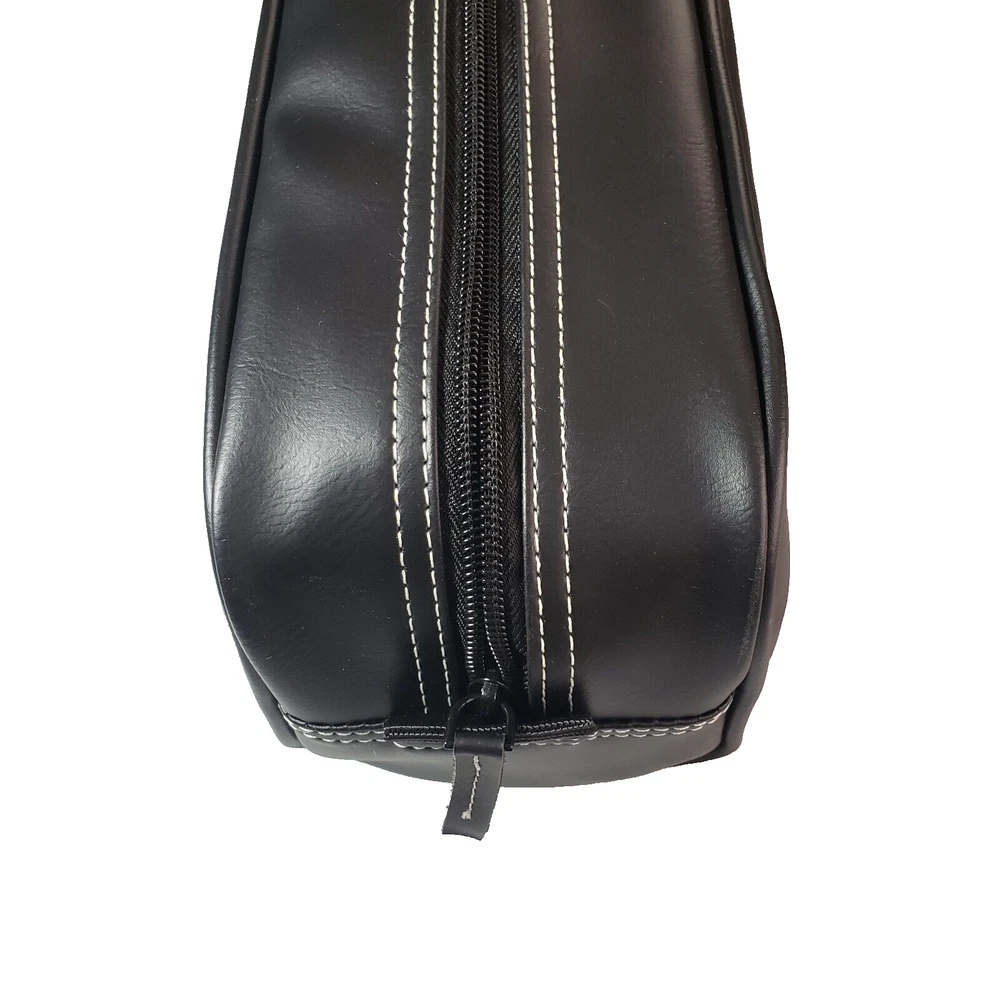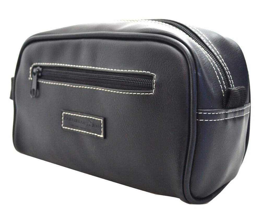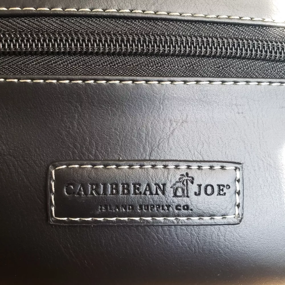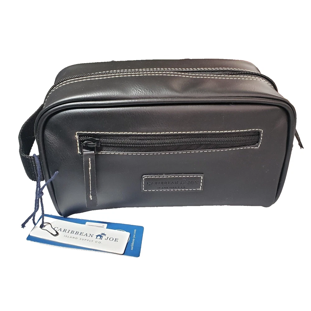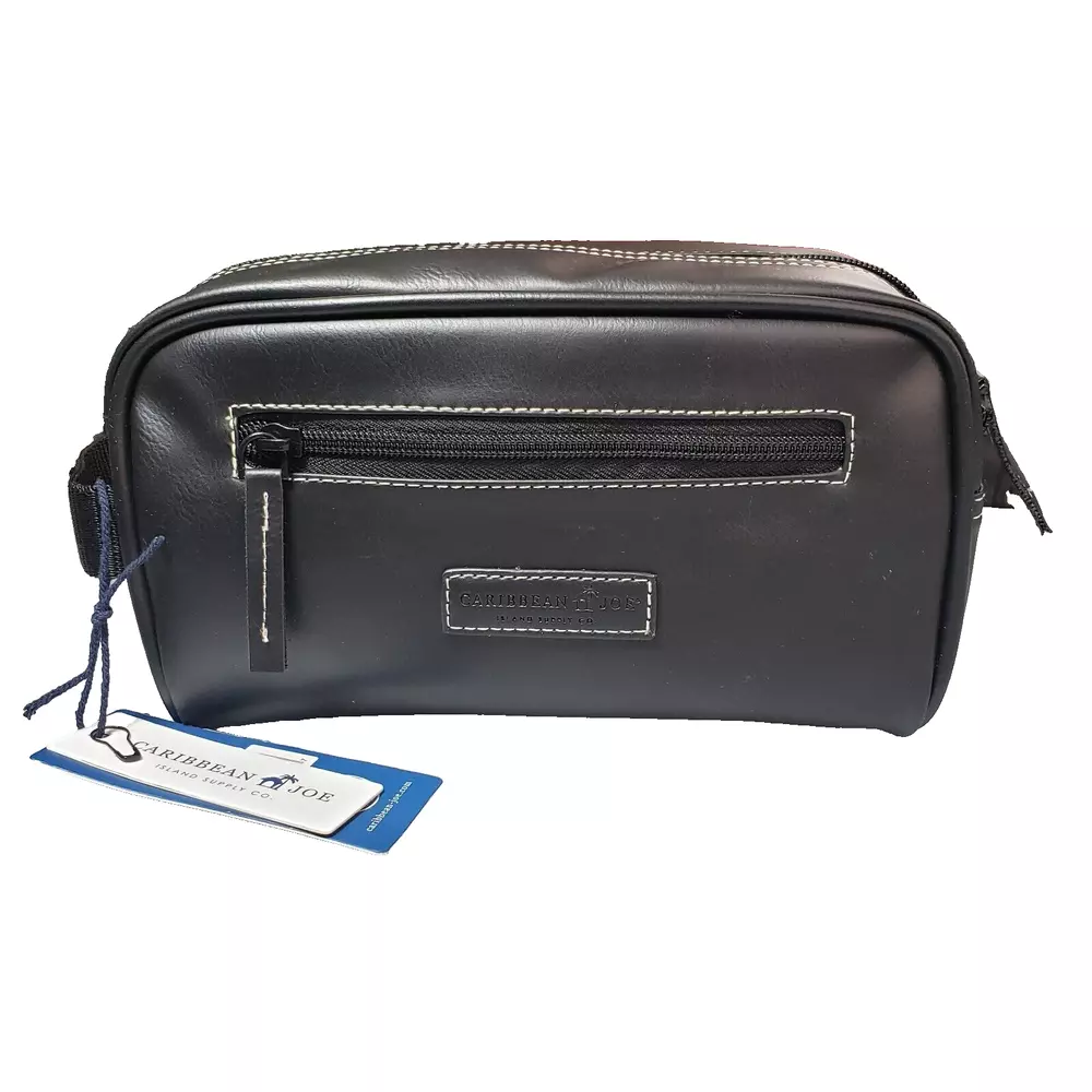 This Caribbean Joe unisex shaving kit is perfect for the traveling man or woman. Front and Main Zip closure and a top handle. The bag has an inside zipper compartment for convenient storage and is made of faux leather and man-made materials The polyester lining ensures a soft touch, and the faux leather material adds a touch of luxury. Measures approx. 8 3/4 inches long, 6 inches high and 4 1/4 wide. Beautiful Black Color Top Zipper main compartment Caribbean Joe logo on front of bag. Retail tag MSRP $35.00