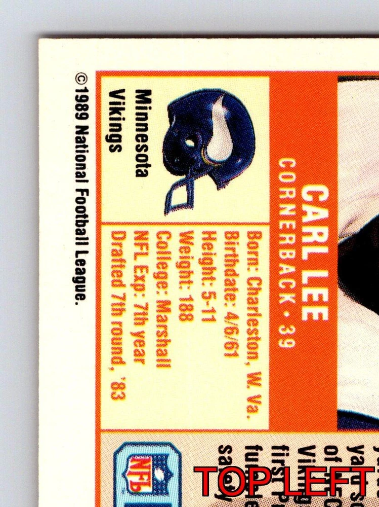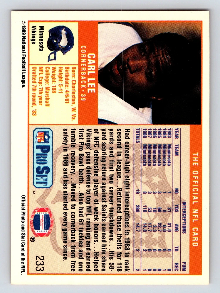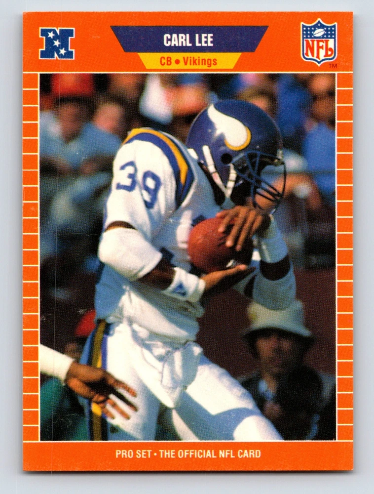 Item Description Title: Carl Lee Cornerback Minnesota Vikings NFL Pro Set 1989 Card 233 Memorabilia Description: This sports trading card features Carl Lee; a skilled cornerback known for his exceptional performance with the Minnesota Vikings. As part of the 1989 NFL Pro Set; this card exemplifies the classic design and detailed photography associated with this series. Carl Lee; wearing his Vikings uniform; is shown in action; reflecting his agility and defensive prowess in the game. Born in Charleston; West Virginia; and drafted in the 7th round in 1983; Lee quickly made a name for himself on the field. By 1986; he had reached impressive heights; ranking among the top defenders with significant interceptions and contributions to the Vikings' playoff berths. This card provides collectors and football enthusiasts a glimpse into Lee's impactful NFL career and his vital role in the Vikings' defensive line during the late 1980s. MRSP: $2.99 Sport: Football Player/Athlete: Carl Lee Season: 1989 Manufacturer: Pro Set Parallel/Variety: Unknown Set: Pro Set 1989 Team: Minnesota Vikings League: National Football League (NFL) Card Number: 233 Counter: 108 Folder: FOOTBALL1224A02
