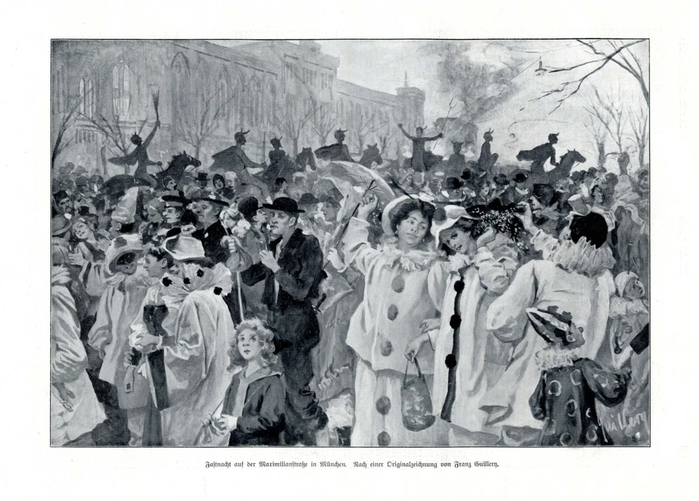 (CJ) (O19) Deutsch / English 0 Großer Kunstdruck aus dem Jahr 1910 Der Kunstdruck wurde einem Journal, einem Buch oder einer Zeitung entnommen und lässt sich daher genau datieren. Auf Wunsch nenne ich dem Käufer gerne, wo und wann dieser Kunstdruck veröffentlicht war. Es handelt sich um keine moderne Kopie, sondern um einen seltenen, 1910 gedruckten und veröffentlichten Kunstdruck, ein Original der Zeit. 0 " Fastnacht auf der Maximilianstraße in München " 0 Large German 1910 art print This early and hard to find art print has been carefully removed from an old German magazine, book or newspaper and is guaranteed to be an original piece. It is no photocopy or reprint but a 1910 printed and published art print, a wonderful historical collectible. The translation of the German title (to the best of my ability): 0 " Carnival on Maximilianstrasse in Munich " 0 Kunstdruck nach einer Zeichnung von / Art print after a drawing by Franz Guillery, * 1862 in Köln / Cologne, † 1934 in München-Pasing / Munich-Pasing 0 Größe / Size: Mit weißem Rand wie unten abgebildet 27 cm x 39 cm / With white margins like shown below 10.6" x 15.3" inches . 0 Zustand / Condition: Druck der Rückseite schimmert im weißen Rand leicht durch, sonst nur minimale Gebrauchsspuren. Die Rückseite ist bedruckt, hat aber inhaltlich nichts mit der Vorderseite zu tun. Das Original ist schärfer als von meinem Scanner wiedergegeben, die Schrift ist klar und deutlich zu lesen. A bit of reverse print visible in the white margin, otherwise only slight signs of handling. The reverse side is printed but has nothing to do with the content of the front. The original is better than reproduced by my scanner, the writing is very good to read. 0 Versand / Shipping: Der Kunstdruck wird knicksicher und feuchtigkeitsabweisend verpackt. Versand erfolgt auf Grund der Größe gerollt. Carefully packaged for save shipping in a mailing tube. 0 Zoll / Tax: