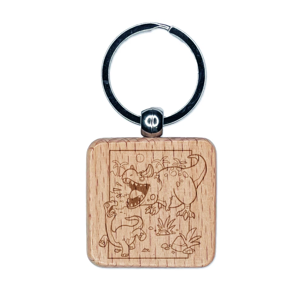 Carnotaurus Horned Dinosaur Roaring Engraved Wood Square Keychain Tag Charm