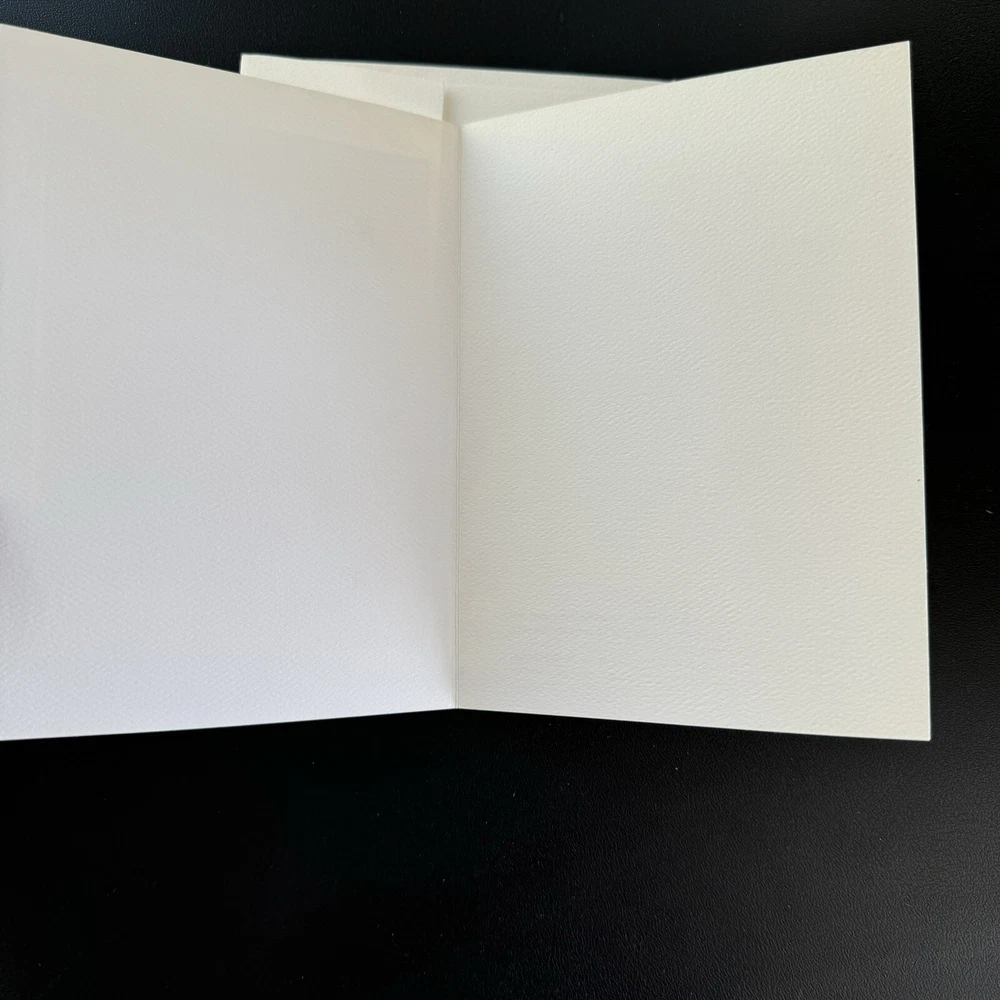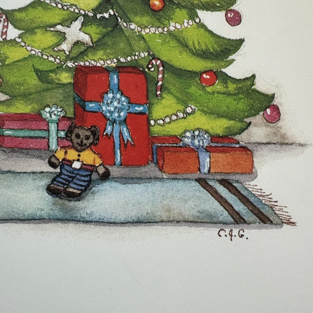 Southwest style watercolor Christmas card with tree, cat, teddy bear and presents. California artist Carol Jean Green. Blank inside. Comes with envelope.