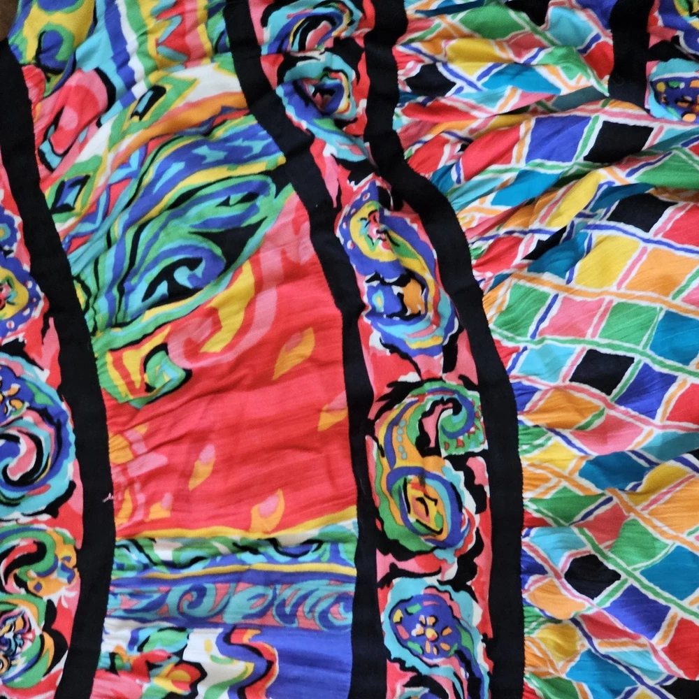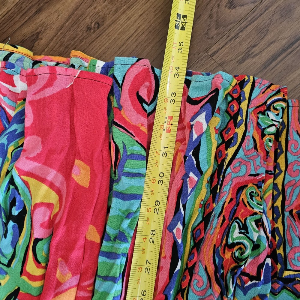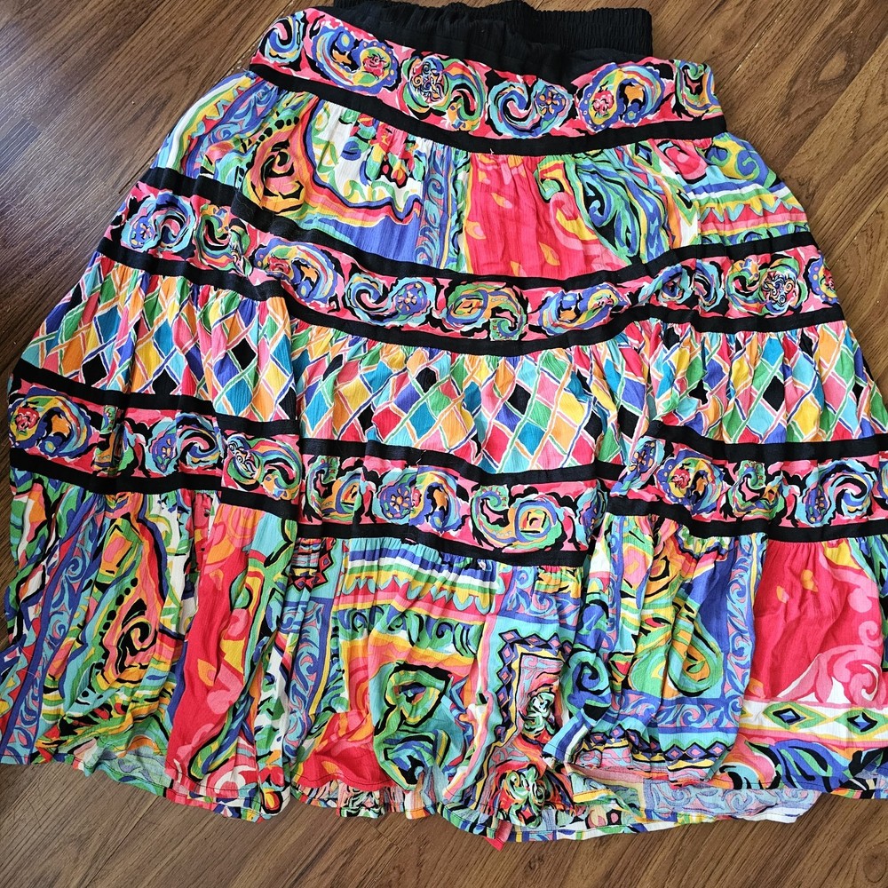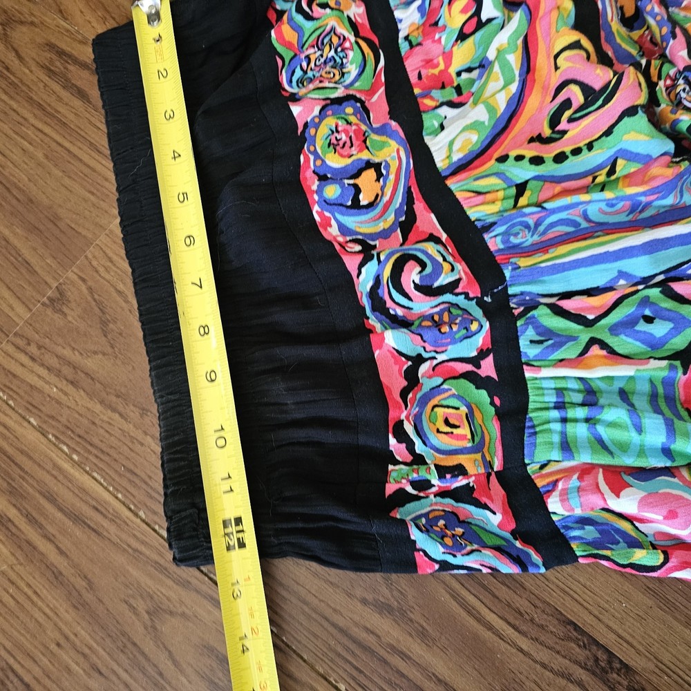 The Carole Little Maxi Broom Long Skirt in colorful boho eclectic gypsy festival style is a vibrant and versatile piece perfect for various occasions. This abstract patterned skirt in a multicolor rayon material with a knit fabric type features a pull-on closure and an elastic waist for comfort. With a vintage charm and a mid-rise fit, this long maxi skirt is ideal for travel, parties, casual outings, and all seasons, making it a must-have for women looking to add a touch of bohemian flair to their wardrobe.