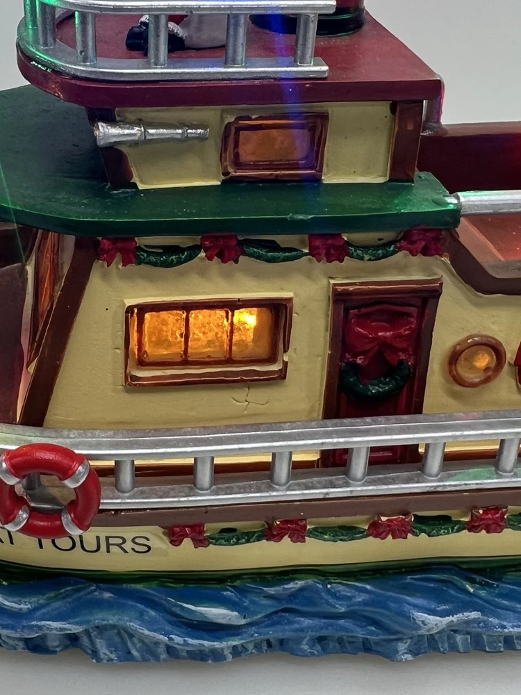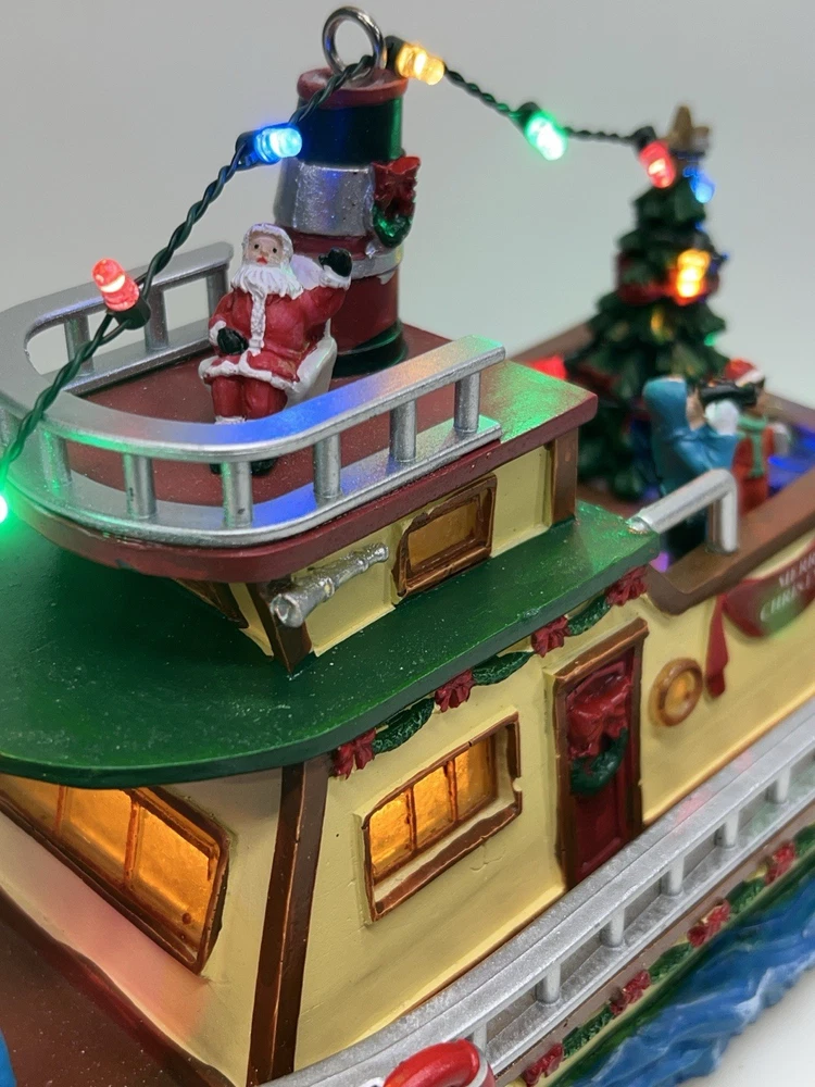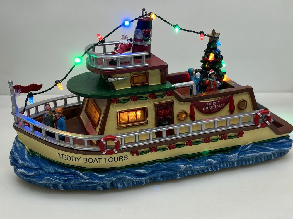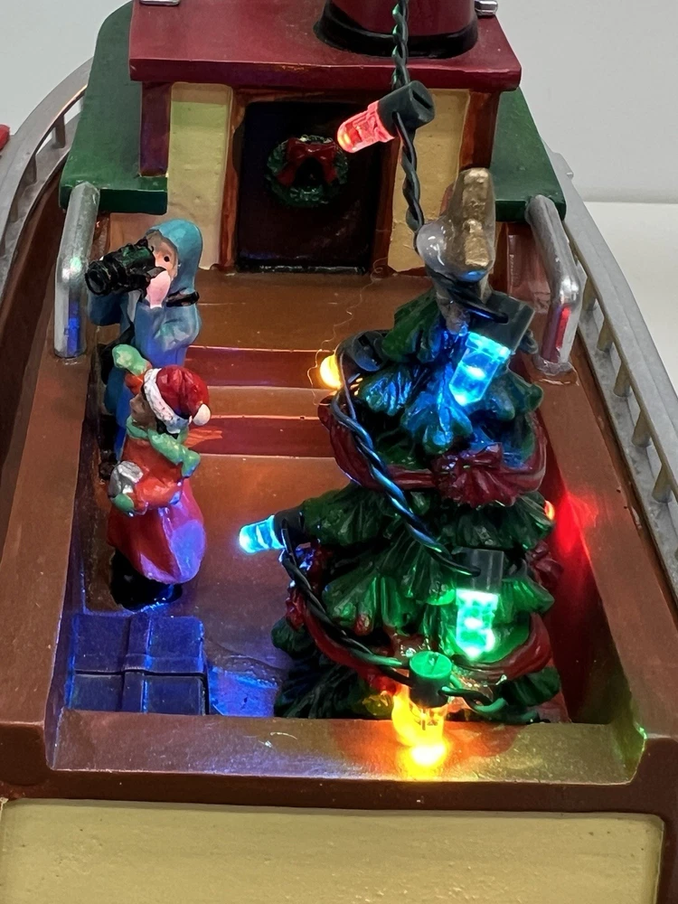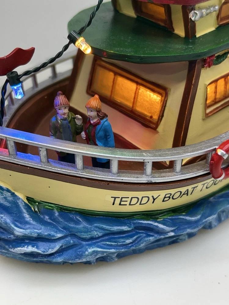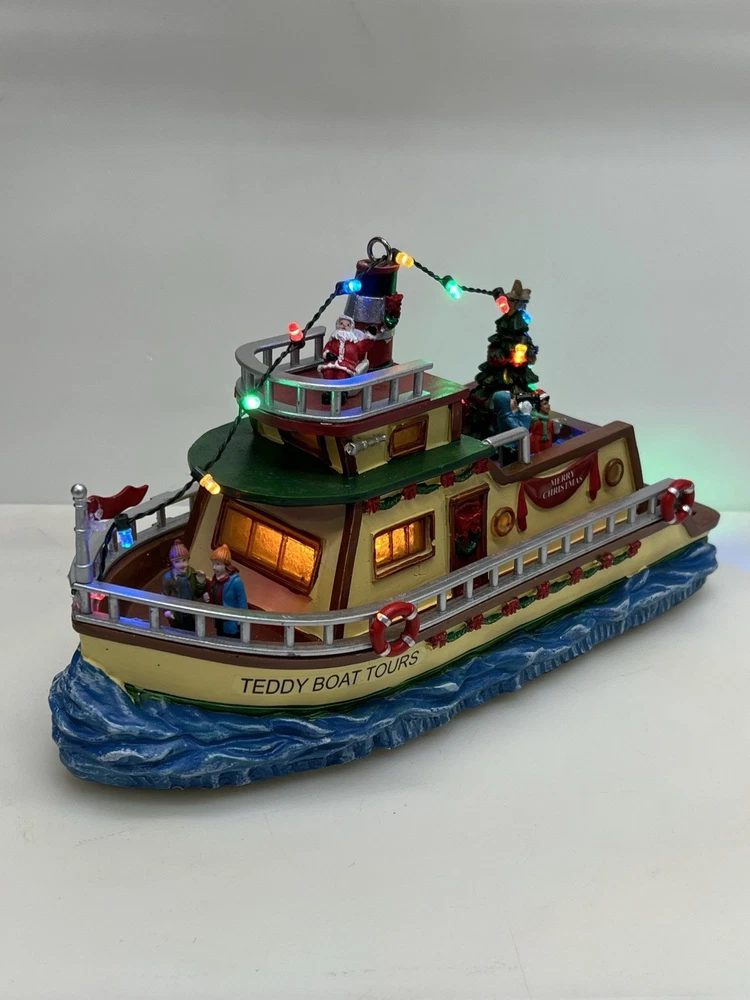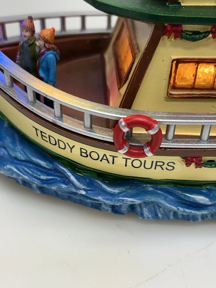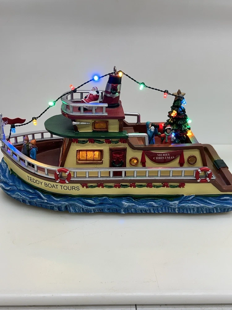 The Carole Towne Collection Teddy Boat Tours with Santa Music LED Lights is a charming addition to any Christmas village display. Hand-painted with LED lights and musical features, this medium-sized boat-shaped decoration from the 21st century is perfect for teens, boys, adults, girls, and kids alike. The American-style piece showcases Santa and tourists on a boat tour, making it a unique and delightful collectible for holiday enthusiasts. Made of resin, electronics, and plastic, this boxed item is sure to bring a touch of festive cheer to any room during the Christmas season. Incredible detail and colors, like new condition. Requires 3 AA batteries included Very whimsical piece with led lights and music