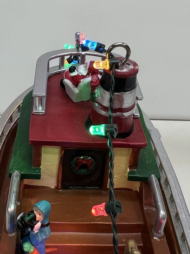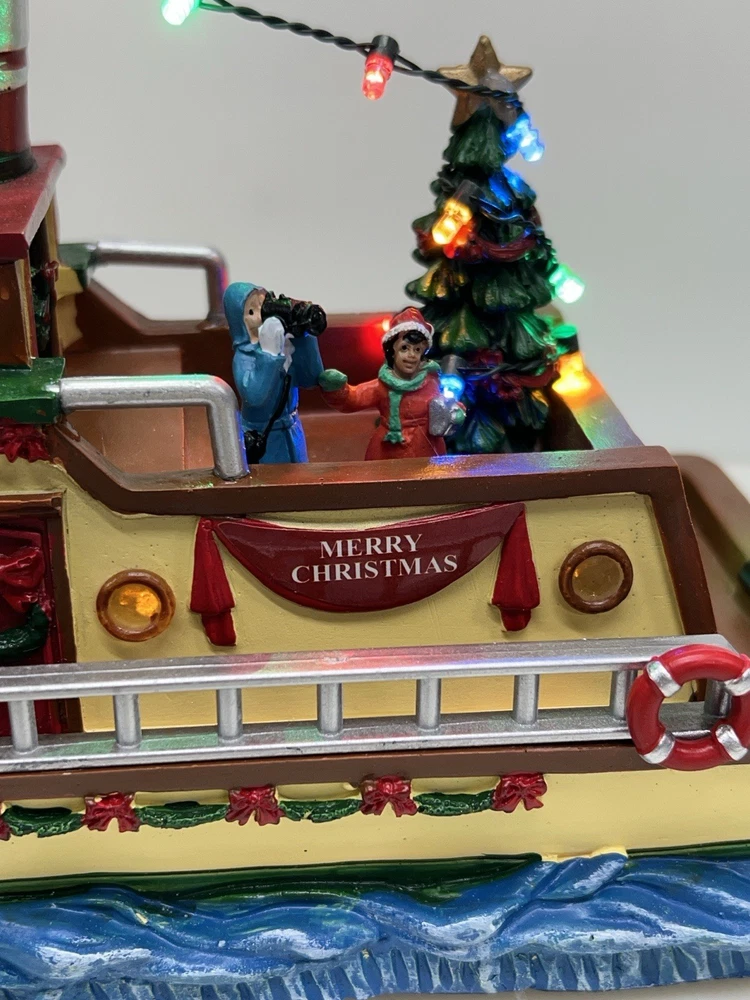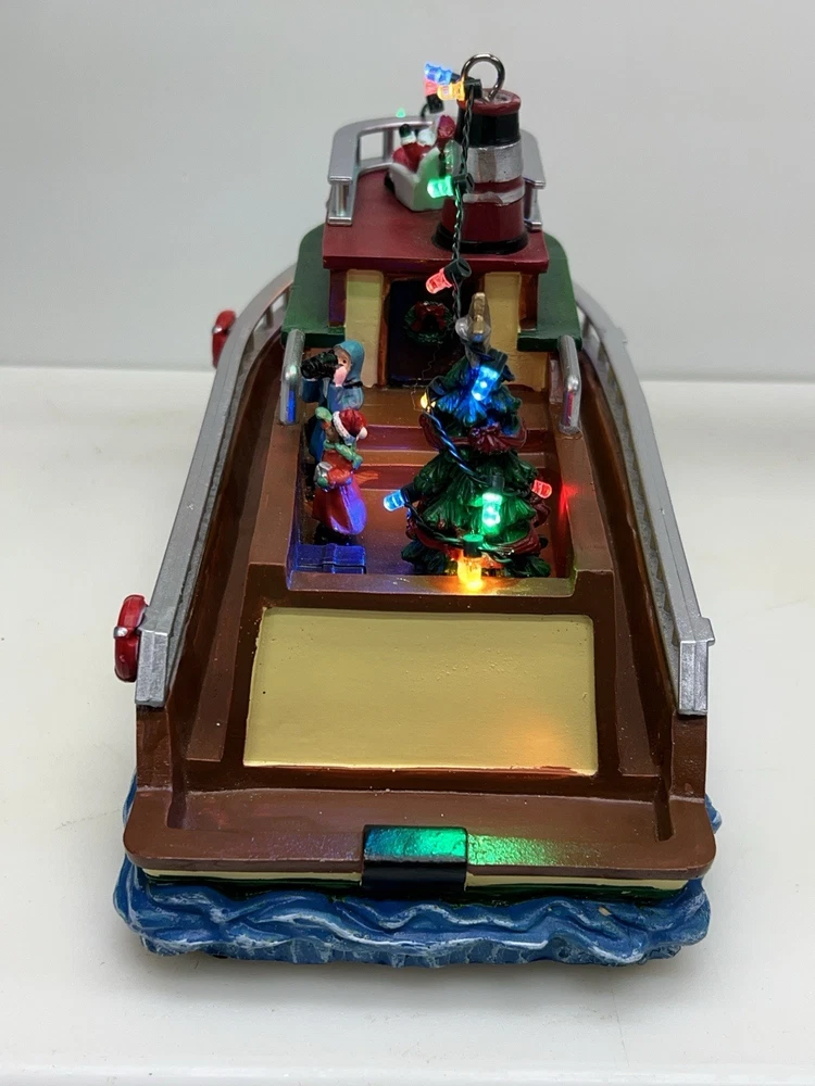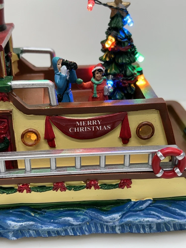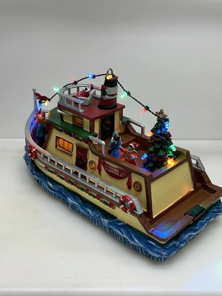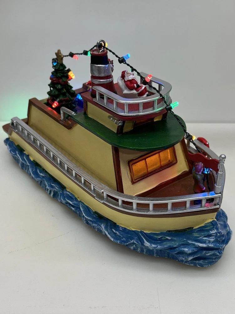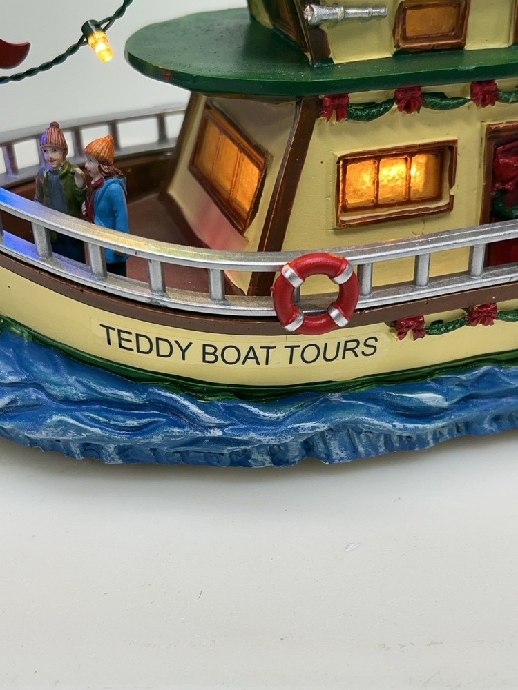 The Carole Towne Collection Teddy Boat Tours with Santa Music LED Lights is a charming addition to any Christmas village display. Hand-painted with LED lights and musical features, this medium-sized boat-shaped decoration from the 21st century is perfect for teens, boys, adults, girls, and kids alike. The American-style piece showcases Santa and tourists on a boat tour, making it a unique and delightful collectible for holiday enthusiasts. Made of resin, electronics, and plastic, this boxed item is sure to bring a touch of festive cheer to any room during the Christmas season. Incredible detail and colors, like new condition. Requires 3 AA batteries included Very whimsical piece with led lights and music