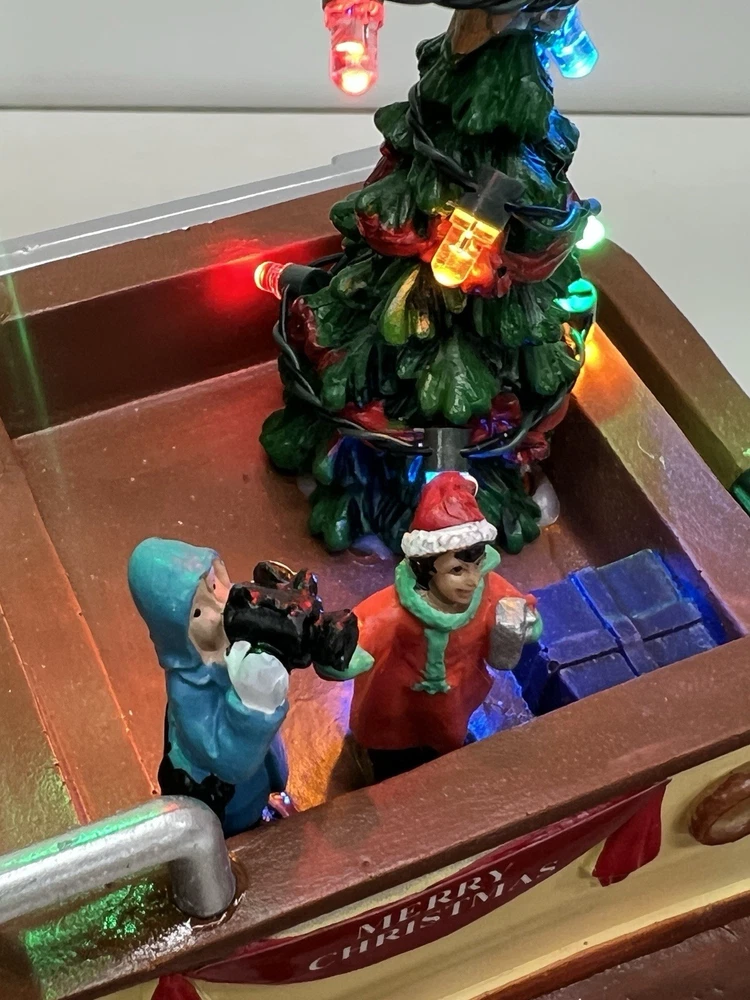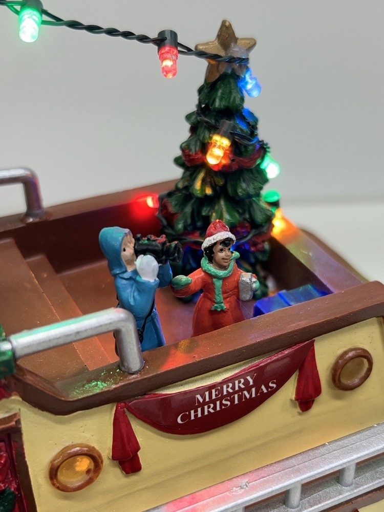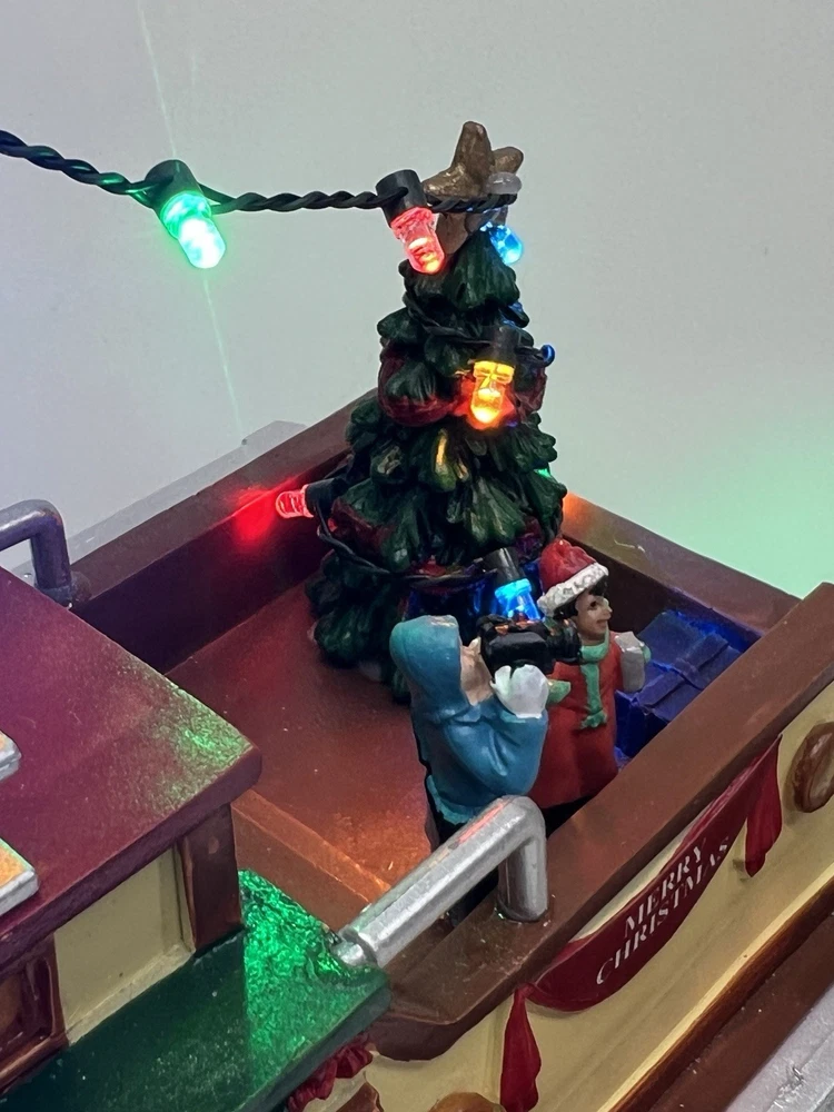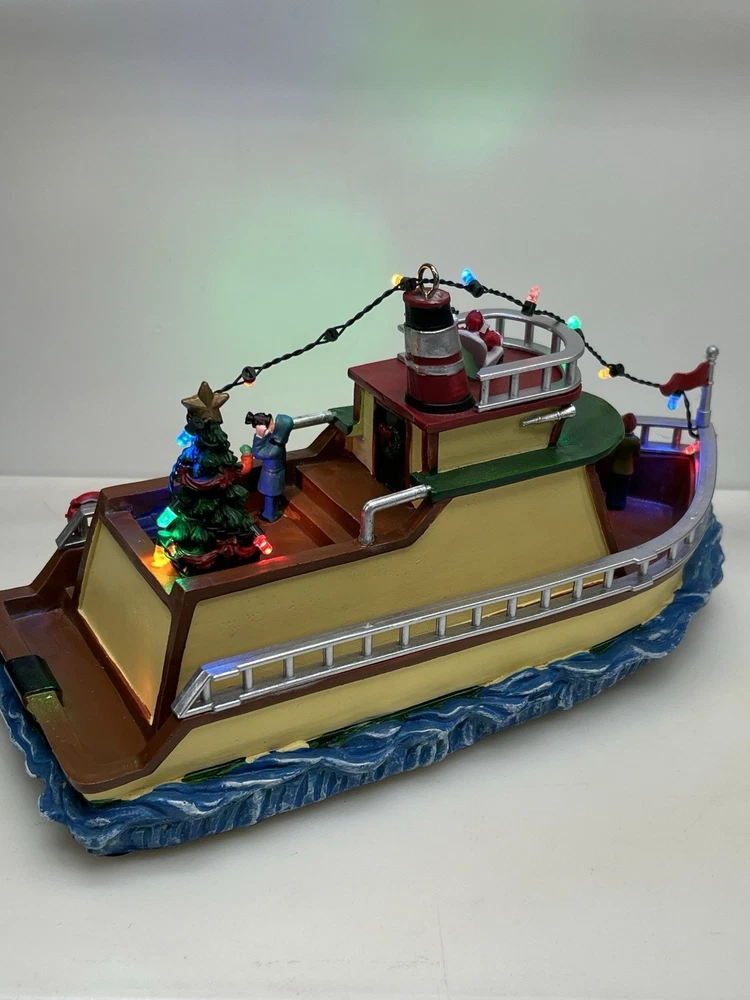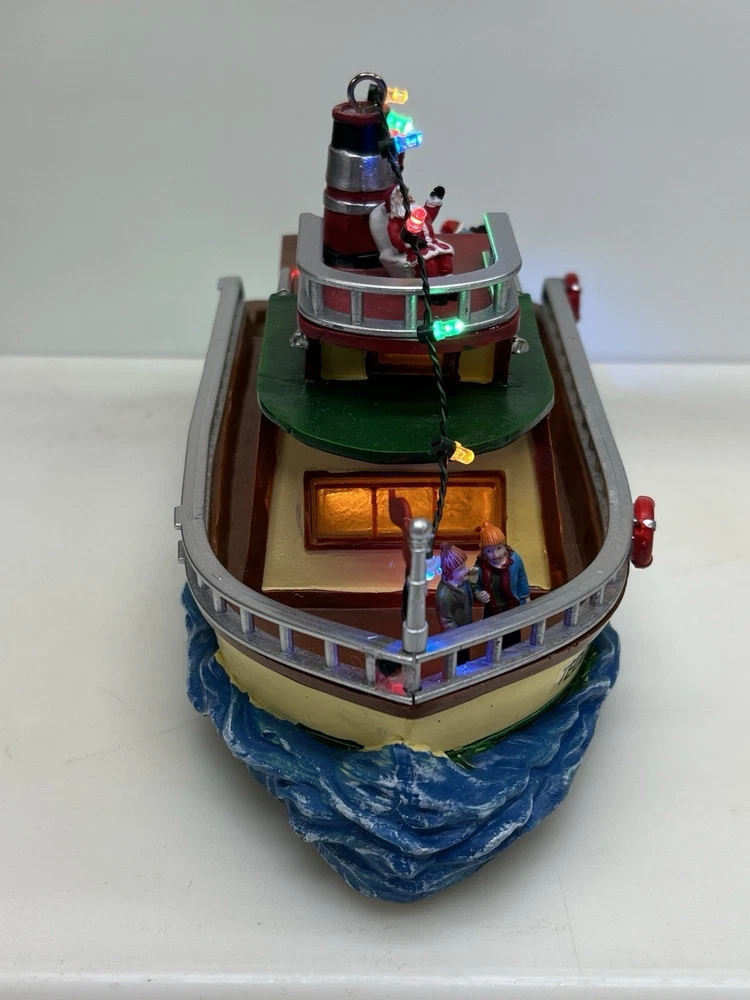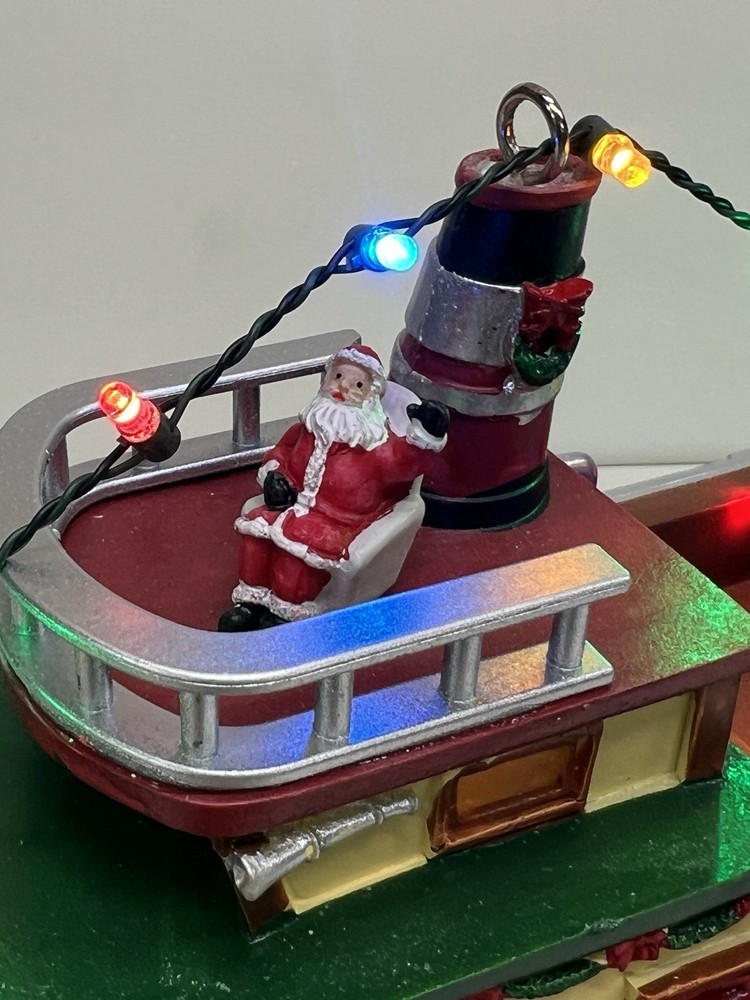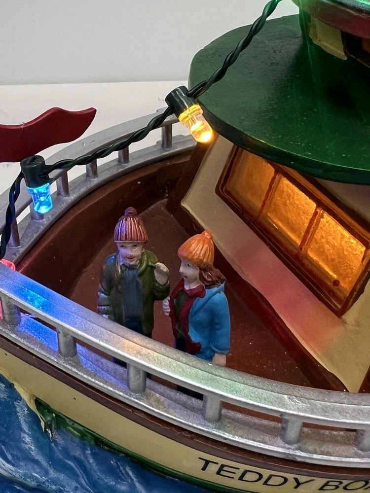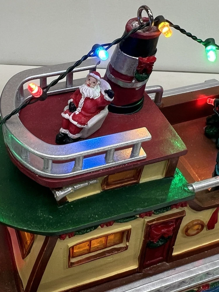 The Carole Towne Collection Teddy Boat Tours with Santa Music LED Lights is a charming addition to any Christmas village display. Hand-painted with LED lights and musical features, this medium-sized boat-shaped decoration from the 21st century is perfect for teens, boys, adults, girls, and kids alike. The American-style piece showcases Santa and tourists on a boat tour, making it a unique and delightful collectible for holiday enthusiasts. Made of resin, electronics, and plastic, this boxed item is sure to bring a touch of festive cheer to any room during the Christmas season. Incredible detail and colors, like new condition. Requires 3 AA batteries included Very whimsical piece with led lights and music