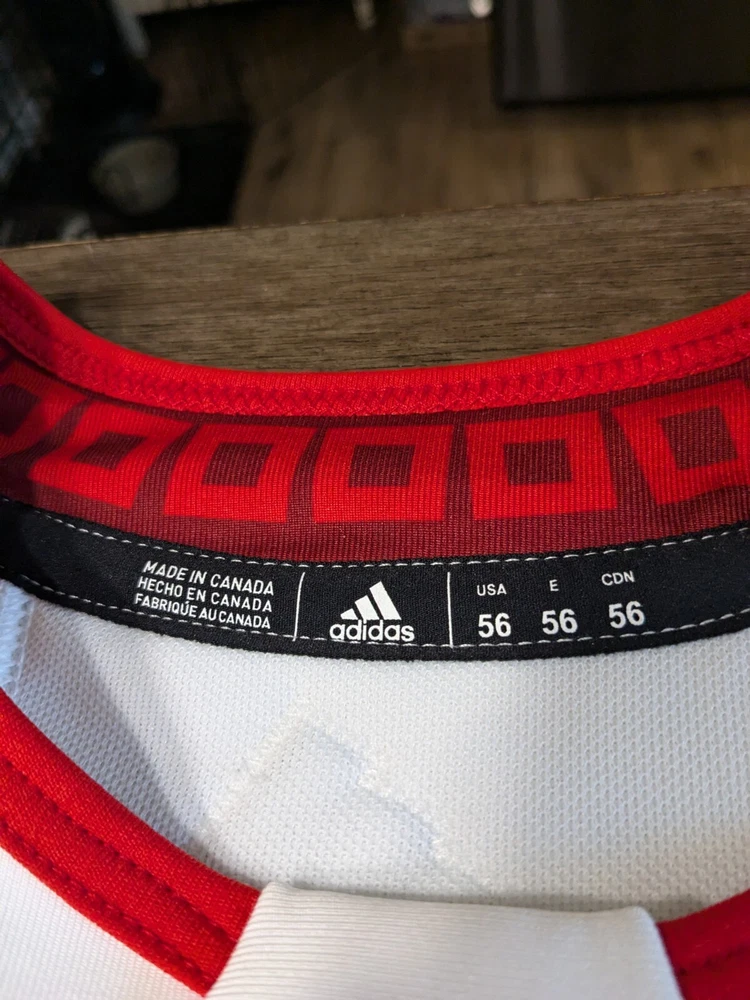 Show your support for the Carolina Hurricanes with this Adidas MiC On Ice Road Jersey. This jersey is perfect for any hockey fan and features the team's official logo. It is made with high-quality materials to ensure durability and comfort. This jersey is officially licensed by the National Hockey League (NHL) and is perfect for regular season games. It is designed for men and comes in size 56. The jersey is white in color and made in Canada. Get ready to cheer on your favorite team with this Carolina Hurricanes Adidas MiC On Ice Road Jersey.