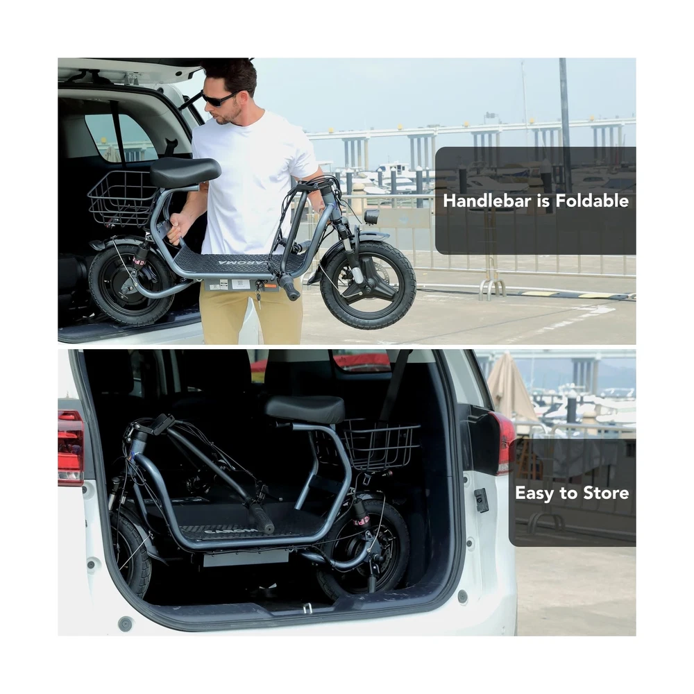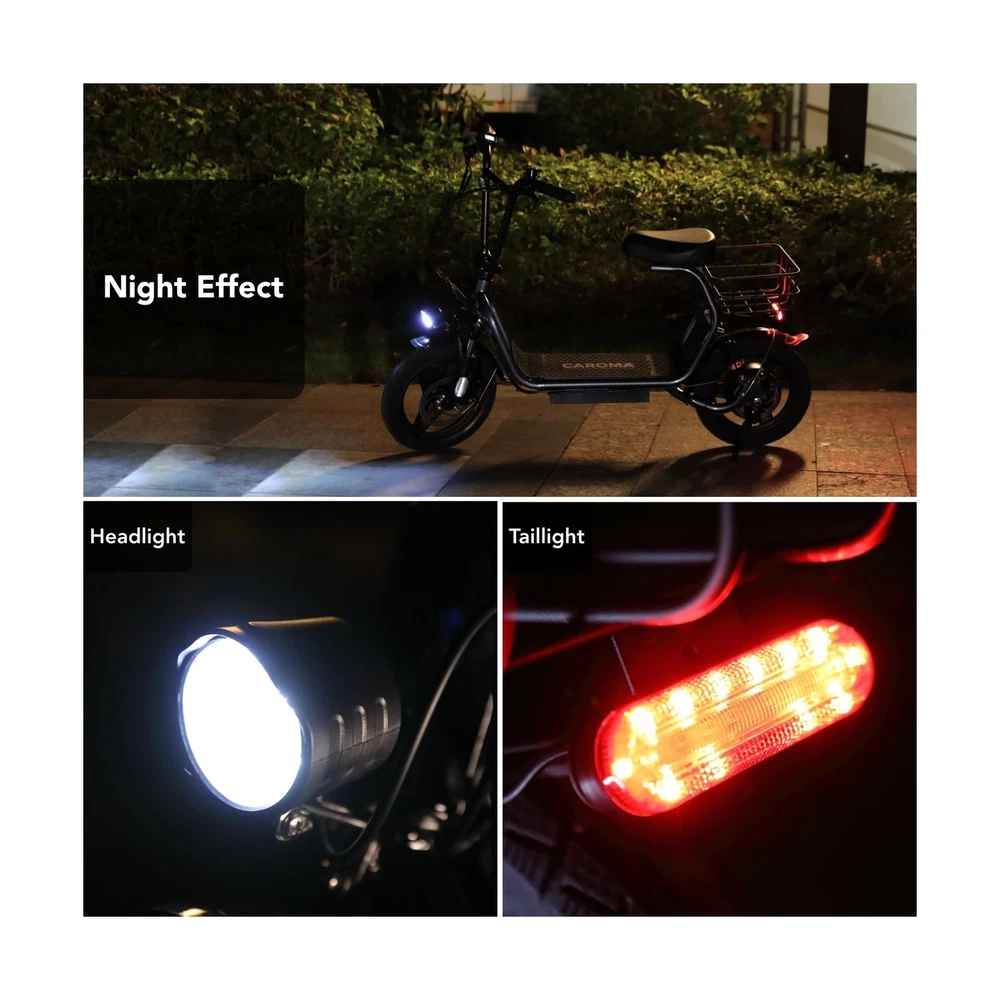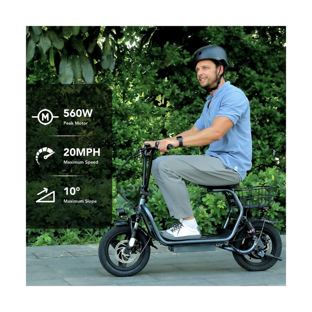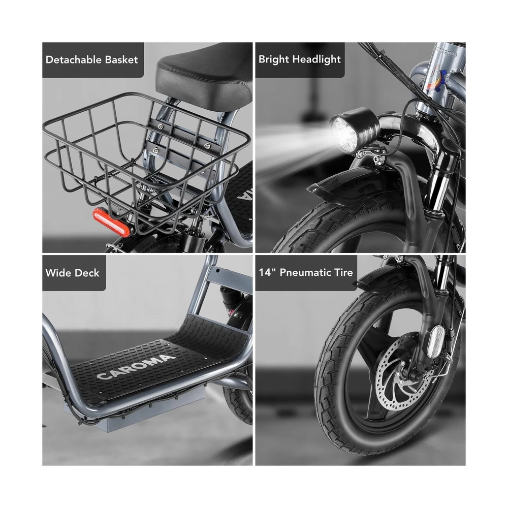 Caroma Peak 1200W Electric Scooter with Seat, 14" Fat Tire Electric Scooter Adults, 500Wh Battery up to 30 Miles&20MPH, Foldable Adult Electric Scooter for Commuting with Basket&Shock Absorbing Description Features: 560W Electric Scooter & 36V Battery350W powerful motor(peak to 560W) electric scooter has 15-mile range and max speed of 20 mph with 10% hill climbing capability. The large capacity 36V lithium battery with regenerative braking has a long range which is ideal for anyone who wants to commute short distance for school or office. Multiple Suspension and 14" Fat TiresThe e scooter comes with multiple shock absorptions (front, rear suspension, and seat shock) that significantly reduce shock, making your ride more comfortable and stable. The 14" large pneumatic tires have excellent grip, high elasticity, and wear resistance. Meanwhile, this adult scooter comes with a large, soft seat and an extra-wide non-slip deck to make long rides a breeze. Foldable & Safe Electric Scooter AdultsThis motorized scooter has folding design for increased portability and safety features like responsive and effective dual drum braking systems, bell, headlight and red tail-light, making it a portable electric scooter for commuting. It also has durable one-piece wheel hubs and a high-strength steel frame with a good weight capacity. The compact folded size makes it easy to store in car trunks and other tight spaces. (NOTE: Max load 300lbs) Smart Electric Scooter with Seat The Caroma P4 is an electric commuter scooter designed for adults. It has a basket above the rear wheels and can carry up to 30 pounds, making it ideal for quick errands and shopping. This electric scooter also features an LCD display that clearly shows the real-time power level of the ride. Meanwhile, the handle-mounted throttle allows you to control your riding speed easily and precisely. Easy Assembly & After Sales GuaranteeThe adult scooter comes mostly assembled with instructions and installation tools. We provide warranty for the e scooter. Caroma electric scooter has passed UL2272 certification, ensuring it meets stringent safety standards. Product Details: Brand: Caroma Color: Grey-Shock Absorption Age Range (Description): Adult Special Feature: Digital Display, Seat, Dual Braking System, Basket, Foldable Weight Limit: 300 Pounds Number of Wheels: 2 Model Name: P4 Electric Scooter Wheel Material: Rubber Frame Material: Aluminum Item Weight: 29.5 Kilograms Brand: Caroma Color: Grey-Shock Absorption Age Range (Description): Adult Special Feature: Digital Display, Seat, Dual Braking System, Basket, Foldable Weight Limit: 300 Pounds Number of Wheels: 2 Model Name: P4 Electric Scooter Wheel Material: Rubber Frame Material: Aluminum Item Weight: 29.5 Kilograms Handlebar Type: Fixed Handle Height: 51.2 Inches Wheel Size: 14 Inches Wheel Type: Pneumatic Suspension Type: Dual Suspension Grip Type: Ergonomic Brake Style: Front Braking, Rear Braking Warranty Type: Extended Charging Time: 4 Hours Recommended Uses For Product: Commuting Maximum Distance Range: 15 Miles Manufacturer: Guangzhou Plenty Bicycle Co.,Ltd Item Package Dimensions L x W x H: 50.79 x 26.38 x 9.06 inches Package Weight: 65 Pounds Brand Name: Caroma Warranty Description: 12 Months Warranty Material: Iron Suggested Users: unisex-adult Number of Items: 1 Part Number: P1 Electric Scooter Style: 560W 15Miles Classic Grey with seat Included Components: 1 x User Manual, 1 x Power Adaper, 1 x Electric Scooter, 1 x Toolkit Size: 129*23*67CM Date First Available: December 27, 2023 Delivery We Do Not Ship Outside of the Continental US. Return Policy All items qualify for returns within 30 days of receipt. Buyer is responsible for return shipping on any item that is not damaged. Feedback We take our reputation seriously, we buy and sell online, so we understand the value of trust. If you are unsatisfied with your order, please contact us and we will work with you to resolve it to your satisfaction.