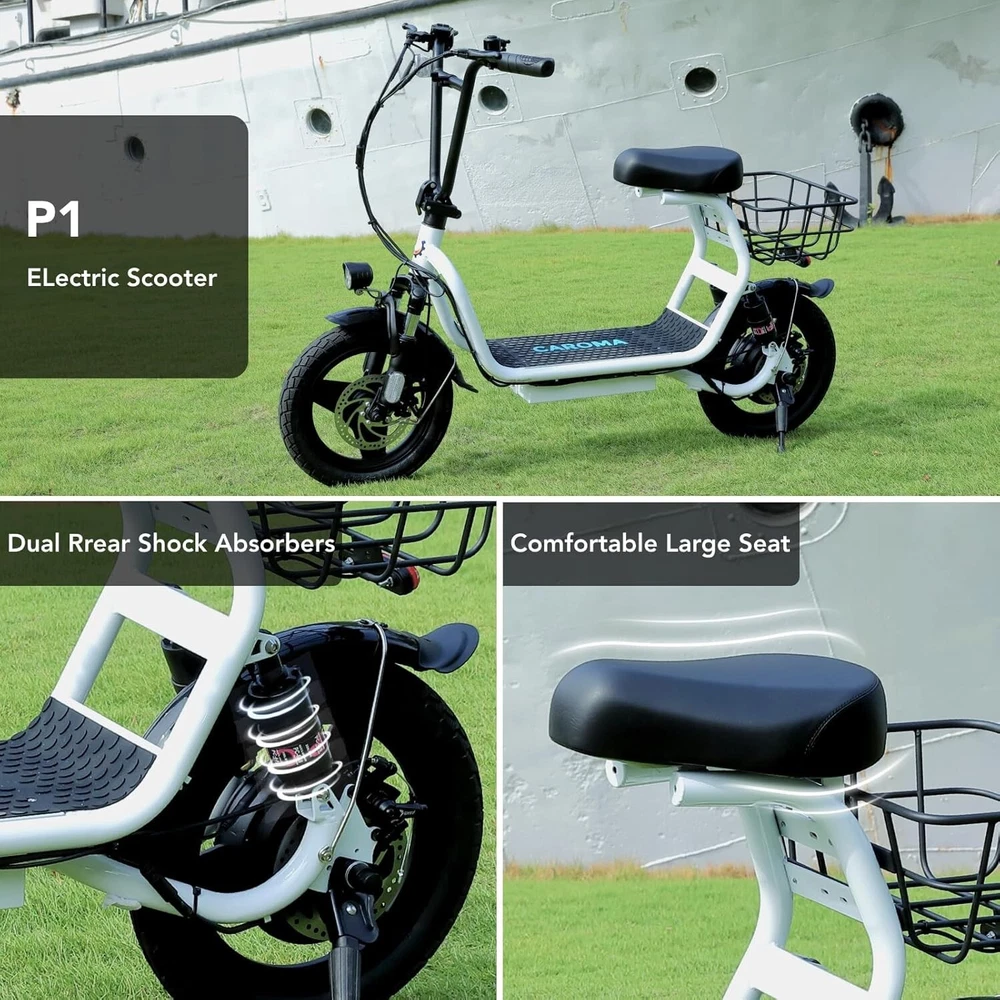 Description About this item 【819W Electric Scooter & 48V Battery】Caroma adult electric scooter comes with a 500W powerful motor(peak to 819W) that delivers max speeds of up to 20 mph and a 15% hill grade climbing ability. The large capacity 48V lithium battery with regenerative braking gives you a range of up to 25 miles, which is ideal for anyone who wants to commute short distance for school or office and give the adults an active lifestyle. 【Multiple Suspension and 14" Fat Tires】The e scooter comes with multiple shock absorptions (front, rear suspension, and seat shock) that significantly reduce shock, making your ride more comfortable and stable. The 14" large pneumatic tires have excellent grip, high elasticity, and wear resistance. Meanwhile, this adult scooter comes with a large, soft seat and an extra-wide non-slip deck to make long rides a breeze. 【Foldable & Safe Electric Scooter Adults】This motorized scooter has folding design for increased portability and safety features like responsive and effective dual drum braking systems, bell, headlight and red tail-light, making it a portable electric scooter for commuting. It also has durable one-piece wheel hubs and a high-strength steel frame with a good weight capacity. The compact folded size makes it easy to store in car trunks and other tight spaces. (NOTE: Max load 300lbs) 【Smart Electric Scooter with Seat】 The Caroma P1 is an electric commuter scooter designed for adults. It has a basket above the rear wheels and can carry up to 30 pounds, making it ideal for quick errands and shopping. This electric scooter also features an LCD display that clearly shows the real-time power level of the ride. Meanwhile, the handle-mounted throttle allows you to control your riding speed easily and precisely. 【Easy Assembly & After Sales Guarantee】The adult scooter comes mostly assembled with instructions and installation tools. We provide a 12-month warranty for the e scooter. Caroma electric scooter is UL certified. If you encounter any problems with the scooter, don't hesitate to contact us and we will offer you 100% satisfactory after-sales service. Payment 1 . We accept PayPal only. 2 . Payment should be completed within 4 (Four) days of auction closing. Or unpaid dispute will be filed for closing auction. 3 . Sales Tax of 9% will be applied for orders shipped within the state of California 4 . We will leave a positive feedback immediately after payment is received. We appreciate a positive feedback as much as you do. If for some reason there is any issue with the purchase, please contact us prior to leaving feedback, and we will be glad to work with you to have it resolved. Shipping 1 . We Ship to United States ONLY. 2 . Ship from two warehouses and only to eBay ADDRESS. Package handling only takes 1 business day at our warehouse, so please make sure entering correct payment and shipping information before checking out. Once your payment is completed, pls leave ebay note if the changes are needed before we send the product. 3 . Truck company: 3-8 business days. | USPS: 2-6 business days. | UPS/FEDEX: 3-5 business days. 4 . Lccal pick up is available. Warranty and Guarantee 1 . All of our items come with a 30-day return policy. We ensure all our items are new and in excellent condition prior to shipping. In the event that you receive the item that is not to the standards above, please contact us via e-Bay messages. All returns must be in new original condition as received and should be shipped with delivery confirmation 2 . We ONLY accept the return for original package. Please make sure that item has NO man-made sabotage. Used items will not be accepted for return. 3 . We reserve the right to refuse any returns for objective reasons. 4 . All NON-seller mistake returns for refund are subject to 20% re-stocking fee and buyer should pay for the round-trip shipping fee. (E.g. you bought wrong model or wrong color). Feadback 1 .Any problem after receiving our goods,please contact us before leaving Neutral/Negative feedback.We promise to help you solve it asap,and make you feel satisfactory absolutely. 2 . Please DO NOT leave negative feedback without asking for help. Please do not leave negative or neutral feedback if you haven't received item in 30 days, because we have mentioned the shipping time repeatedly.