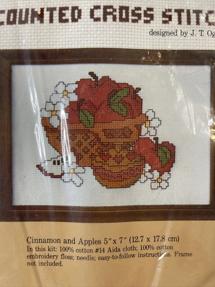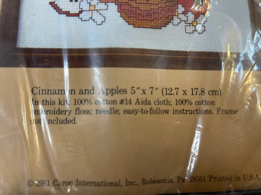 Caron Counted Cross Stitch Kit. Apples & Cinnamon in Basket 5”x7” No Frame. There is a hole in the plastic in the front of package-see pictures- no harm to the item inside noted.
