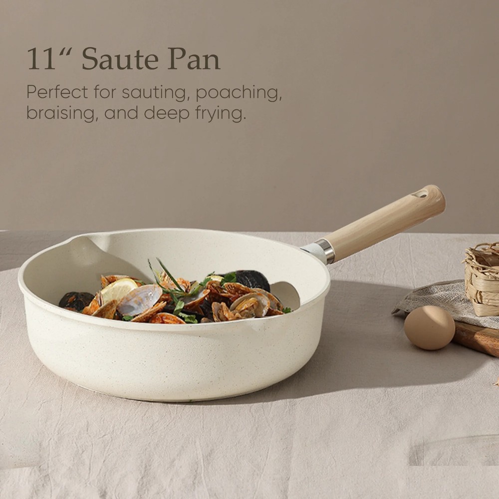 Why Carote? Enjoy the Best Quality. Carote is committed to offering you the best quality at the fairest and most honest price, with 25 years of experience in the nonstick cookware industry. We sell directly from our factory. A typical M13C model allows us to offer the lowest cost with higher quality products. We always adhere to the principle of customer first, pay attention to the customer's shopping experience, and provide excellent service to ensure each customer receives the best value for their money. STURDY BODY - Made of heavy-duty cast aluminum, this nonstick pan resists warping and wobbling while heating quickly and evenly. SUPER NONSTICK: This sauté pan features a premium nonstick coating in creamy white with speckles and a sleek granite look, making cooking and cleanup a breeze. Food slides off easily, and less oil or butter is needed, promoting healthier cooking. EASY TO CLEAN - The non-stick surface and soft-touch Bakelite handle make cleaning a breeze, saving you time and effort in the kitchen. COMFORTABLE HANDLE - Sturdy round handle with safe flame guard ring for comfortable and safe cooking COMPATIBLE WITH ALL STOVETOPS - The stainless steel induction base is suitable for gas, induction, electric, and ceramic stovetops. VISIBLE COOKING - The clear tempered glass lid allows easy monitoring of cooking progress LARGE CAPACITY -5.0 QUART, 11 inch/28 cm diameter, perfect for preparing meals for family and friends gathering. Features Nonstick, Induction Compatible Brand Carote Cleaning, Care & Maintenance Just gently wipe it with a paper towel or rinse it with water Assembled Product Dimensions (L x W x H) 19.09 x 11.42 x 3.35 Inches