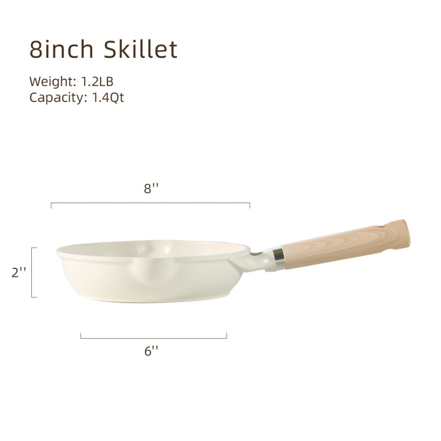STURDY BODY - Made of heavy-duty cast aluminum, this nonstick frying pan resists warping and wobbling while heating quickly and evenly. SUPER NONSTICK -This skillet features a premium non-stick coating in cream white with speckles and a stylish granite look, making cooking and cleanup effortless. Food slides off easily, and less oil or butter is needed, promoting healthier cooking. EASE TO CLEAN - The nonstick surface and bakelite handle with soft touch makes cleanup a breeze, saving time and effort in the kitchen. COMFORTABLE HANDLE - Sturdy round handle with secure flame guard ring for comfortable and safe cooking COMPATIBLE FOR ALL STOVES -Stainless steel induction base is suitable for gas,inducton,electric,ceramic stoves. 8 INCH,20CM in diameter