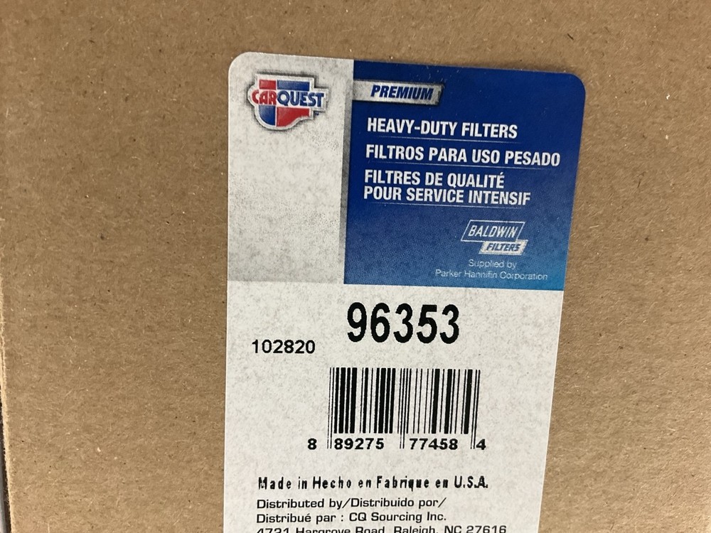 Brand new oil filter. Carquest, part number 96353-2. High Efficiency Lube Spin-on Fits: Caterpillar Engines, Equipment Replaces: Caterpillar 1R1807 Thread: 1 1/8 -16 O.D.: 4 1/4 (108.0) Height: 10 1/16 (255.6) I.Gskt: [1] Included Related To: 85791, 85791XE, 96475 (Long Versions) 96345, 85791XD (Standard Versions) Application Guide: Manufacturer Manufacturer Part # AC DELCO PF857L BIG A 92791XE COMPAIR 9.82465E+12 JOHN DEERE GG17031266 LENZ CP103210B LINDE 3562227706 MUSTANG 17031266 VMC LF7739 Free Shipping is for continental USA only. If you live in Alaska, Hawaii, or PR please contact us for a shipping quote before bidding. Packaging appearance and condition may vary. Examples include torn and distressed packaging and packaging that has been opened to verify contents. Items may contain shelf wear or imperfections due to the age of the product. Fitment: Applications are provided through literature and research and are correct to the best of our knowledge. Listed applications should be used as a guide and may fit additional vehicles. Please verify the part that you are ordering fits your application prior to purchase. Please contact us if you have any questions before purchasing. Shipping: Free Domestic Standard Shipping! Expedited shipping is available at an additional cost. Free shipping applies to continental US, Hawaii, Alaska, Puerto Rico and US territories. International shipping is available. Contact us before purchasing and we will determine the best rate. Items are shipped the next business day after receiving full payment. Returns: We gladly accept returns 30 days after purchase. Items must be returned in the condition that they were sent for a full refund.