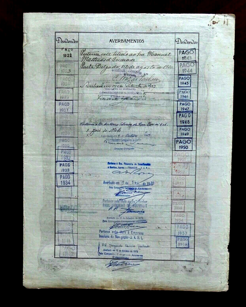 One share certificate(uma acçâo) of "CARREGADORES AÇOREANOS COMPANHIA DE NAVEGAÇAO SA" at Ponta Delgada of the Açores Portuguese atlantic islands. 1920 Etremely ilustrated ,great multicolor document in a good condition .Condition (opinion): Good +/ Very Good (G+/VG) . Rust marks or stains , tears .See scan.Dividends and owners appears at the back side.100 escudos insulanos .One handwritten signature.Printer:Devanbez Grs,Paris. Use this picture for reference only, serial number may be different. Old or historical document for exhibition, archive, documentation, collecting, study or decoration purposes only . See below for related information from the web. Please read carefully the sale terms ,shipping conditions and information below. The buyer accepts those terms, conditions and cost described. The buyer must notify to us of the delay in the arrival of his purchase when he meets 3 weeks ( to Europe) to 4 weeks (rest of the World) this guarantee expires two months after the shipment of his purchase if we have not previously received notice of the delay . --------------------------------------------------------------------------------------- Banknote Grading UNC AU EF VF F VG G Fair Poor Uncirculated About Uncirculated Extremely Fine Very Fine Fine Very Good Good Fair Poor Edges no counting marks light counting folds OR... light counting folds corners are not fully rounded much handling on edges rounded edges Folds no folds ...OR one light fold through center max. three light folds or one strong crease several horizontal and vertical folds many folds and creases Paper color paper is clean with bright colors paper may have minimal dirt or some color smudging, but still crisp paper is not excessively dirty, but may have some softness paper may be dirty, discolored or stained very dirty, discolored and with some writing very dirty, discolorated, with writing and some obscured portions very dirty, discolored, with writing and obscured portions Tears no tears no tears into the border minor tears in the border, but out of design tears into the design Holes no holes no center hole, but staple hole usual center hole and staple hole Integrity no pieces missing no large pieces missing piece missing piece missing or tape holding pieces together ------------------------------------------------- See below related information from the web. História[editar | editar código-fonte] Foi fundada em 1920 por iniciativa de Francisco Luís Tavares, para realizar transportes marítimos de passageiros e de cargas. Com sede em Ponta Delgada, na ilha de São Miguel teve um importante papel dinamizador do comércio marítimo entre o arquipélago dos Açores e os portos do norte da Europa e da costa leste dos Estados Unidos da América. A 5 de Maio de 1944 foi feita Comendadora da Ordem de Benemerência.1 Com os lucros obtidos durante a Segunda Guerra Mundial, por iniciativa do Director-delegado,Francisco Luís Tavares (v. fotografia), promoveu a construção do Teatro Micaelense. Operou até 1972, tendo sido absorvida pela Empresa Insulana de Navegação. Terminamos aqui esta fase de recordações dos grandes Armadores nacionais, da nossa história recent" width="389" height="221" border="0"> COMPANHIA DE NAVEGAÇÃO “ CARREGADORES AÇOREANOS “ Constituição. Primeiros anos No período pós-1ª guerra mundial e face à situação caótica de falta de transporte marítimo que tinha abalado o crédito das firmas açorianas que se dedicavam ao comércio do ananás, fundava-se em Ponta Delgada, a 15 de Março de 1920, a sociedade anónima, Companhia de Navegação “Carregadores Açoreanos”, com um capital social de 2.150.000$00, 34 % subscrito pela Sociedade Corretora Lda., 14 % pelo Banco Micaelense, 12 % pela firma Bensaúde & Cª e o restante por trinta e três outros accionistas micaelenses. De acordo com o primeiro director executivo desta nova casa armadora, Cristiano Frazão Pacheco, os fins a que a Companhia de Navegação "Carregadores Açoreanos” se propunha, eram “.... a exploração do comércio marítimo para o estrangeiro, sem linhas determinadas, tendo como base, logo que as culturas e exportação se normalizem, a carga de ananases para Londres e Hamburgo e de importação para esta ilha (S. Miguel) e outras do arquipélago. Caso o Capital subscrito o permita, assim como o custo dos navios, a Companhia, além desta linha regular, poderá ter navios destacados para outro tráfego. Todos os navios serão registados como pertencentes à praça de Ponta Delgada, sede da Companhia “ . Contudo as duas primeiras unidades da frota a serem adquiridas eram vocacionadas para a pesca de alto-mar: Primeiro foi a compra do lugre “Susana”, adquirido em Inglaterra em Julho de 1920 para a pesca nos bancos da Terra Nova e que naufragou logo na primeira viagem à chegada aos Açores. Seguiu-se uma traineira a vapor, vinda de França em Janeiro de 1921, baptizada “Açor” (ex-“Cachalot”) destinada à pesca nos mares do arquipélago, vendida algum tempo depois, por resultados desvantajosos. Em finais de 1921 foi adquirido um pequeno cargueiro misto, “Villa Franca”, que durante dois anos estabeleceu a ligação para Londres e Hamburgo. Passados dois anos eram adquiridos o “Gonçalo Velho” e o “Santa Maria”. Este último viria a naufragar junto ao Cabo Villano em Setembro de 1923. Após um aumento de capital social a frota dos “Carregadores” começaria a ser restruturada em 1924 com a compra de alguns navios aos Transportes Marítimos do Estado, a saber: — o “Lagoa” (ex-Viana), o “Vila Franca” (II) (ex-“Espozende”) e posteriormente o “Fayal”. Com a venda do “Gonçalo Velho” e do “Fayal”e, a perda do “Lagoa”, encalhado ao largo de Esposende nos finais de 1928, era imperativo criar uma certa estabilidade na frota, a fim poder continuar a manter saídas regulares de Pta. Delgada para Londres e portos do Norte da Europa de doze em doze dias. Assim, em Ma