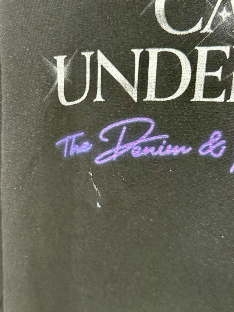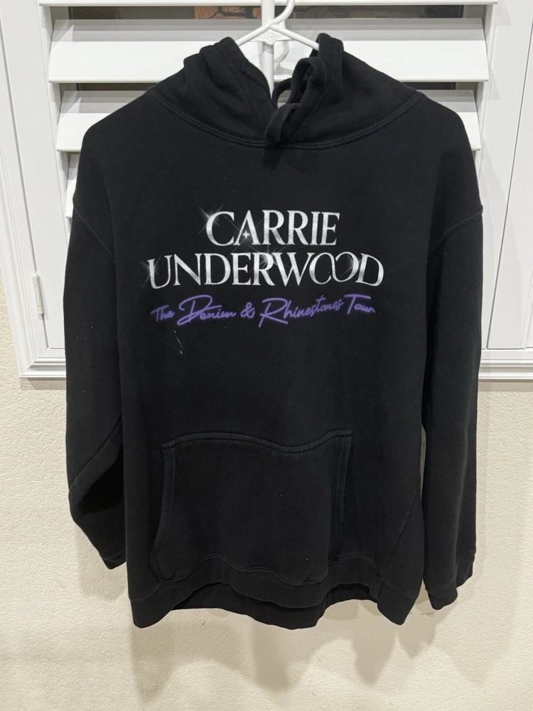 Carrie Underwood Official Denim & Rhinestones Tour Concert Hoodie Sweatshirt Large. In ok pre-owned condition. See pictures for small white paint mark on the front. Smoke Free Home. Pet Free Home.