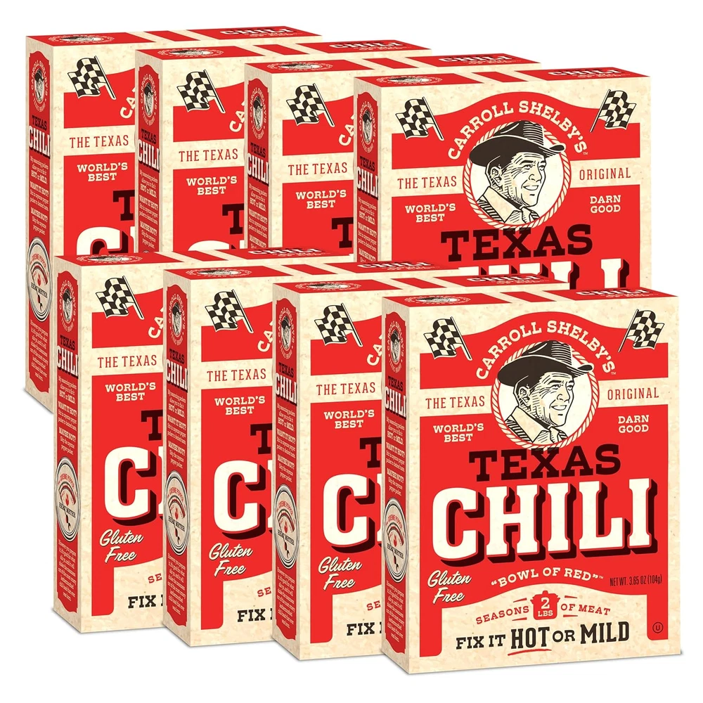 Hot or Mild Chili: This custom chili mix features individual seasoning packets of cayenne and Masa flour to make 2 pounds of meat mild or spicy! Six servings per container and gluten free Authentic Chili: Crafted with bold creativity by Carroll Shelby himself, this chili kit is just what you need to create authentic, Texas-style chili right at home Texas Chili Mixes: Our mixes are perfect for hearty chilis, burger toppings, tacos, salads and other favorites. Create great-tasting combinations for everyday meals, tailgate parties, backyard BBQs and more Carroll Shelby's Chili: All of our custom chili kits have sophisticated flavor and feature individual seasoning packets to customize to taste. Try it for Tomatillo, Poblano Salsa, Quick Chili Mole and more The Chili: In 1967, racecar legend Carroll Shelby transformed a Texas ghost town into the first-ever chili cook-off at Terlingua. What began as a non-stop party of fire-breathing chiliheads morphed into an annual world famous championship Carroll Shelby's custom chili kit features individual packets of spices, cayenne, and masa flour that let you season two pounds of meat just the way you like. Delicious on its own or atop burgers, tacos, or salads. Just add creativity and your own special fixin's.