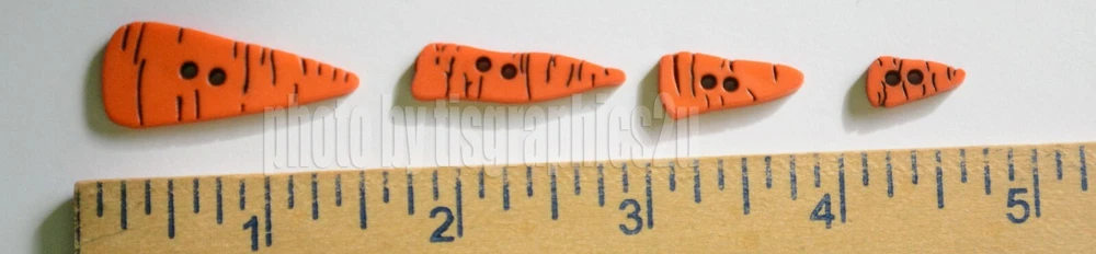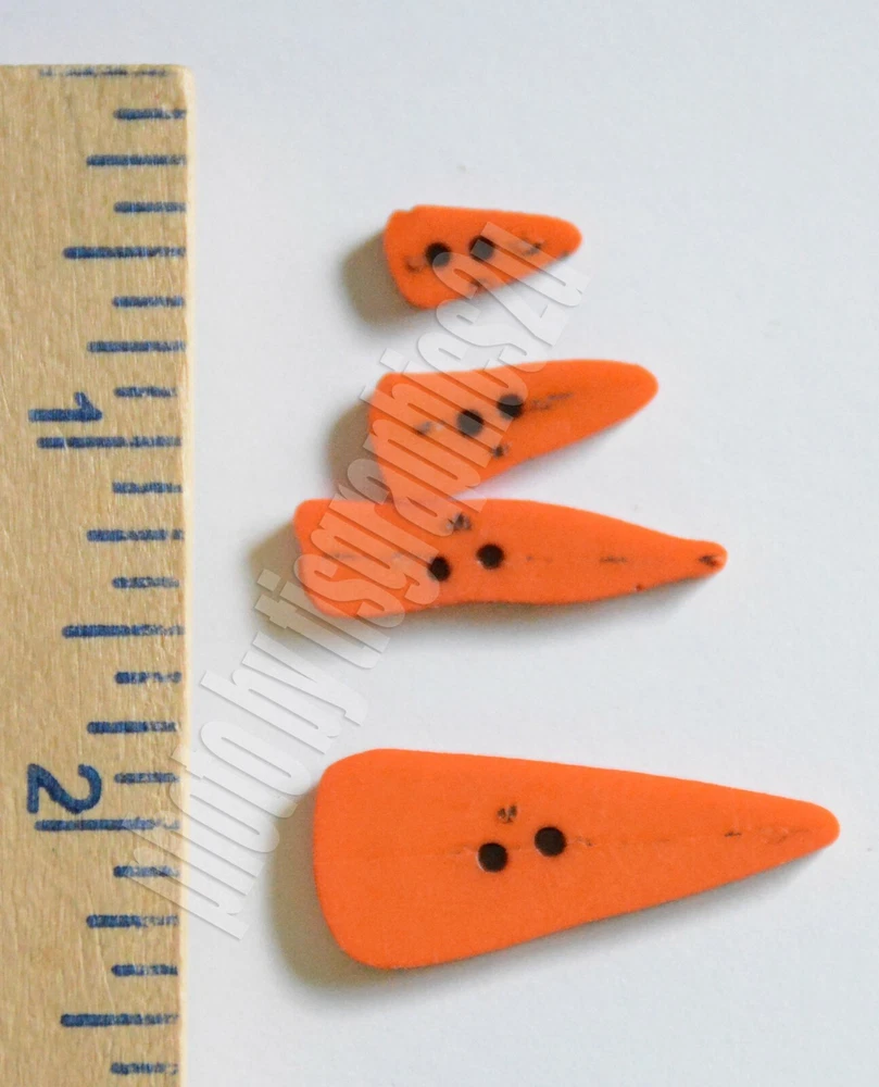 Carrot Noses / Holiday Collection Dress It Up Buttons by Jesse James Company Package contains carrot nose shaped button embellishments. Carrots come in 4 different sizes .... 1 3/8" long .... 1 1/8" long .... 3/4" long .... 1/2" long These are a 2 hole style flat-back button which work best when sewn on your project. Buttons are part of the Jesse James / Dress It Up Holiday collection of Button Embellishments. Great accents for scrap-booking, card making, crafts and even decoration. Notes to Buyers My items are from a pet and smoke-free home. Payment / Shipping Charges All buttons, appliques, cards and other small items ship with a flat rate shipping charge as long as you use eBay’s shopping cart and buy everything in the same transaction. If you pay for items separately, shipping on additional purchases will not be fully refunded due to the fees I’m charged on the extra transactions. Shipping I ship via USPS using tracking the same or next business day following notice of your cleared payment. Please note that delivery time is listed by eBay; but I’m at the mercy of USPS. If you need your order ASAP please consider upgrading to Priority Mail. If USPS does seem to stall your package, please notify me and I will file a claim with them to see if I can get it moving. Returns If you do find a defect or problem with your order, please notify me before filing a claim so I can resolve any issues. Please include a photo so I know how to handle the problem. Returned items must be received in the same condition as shipped – including smoke free.
