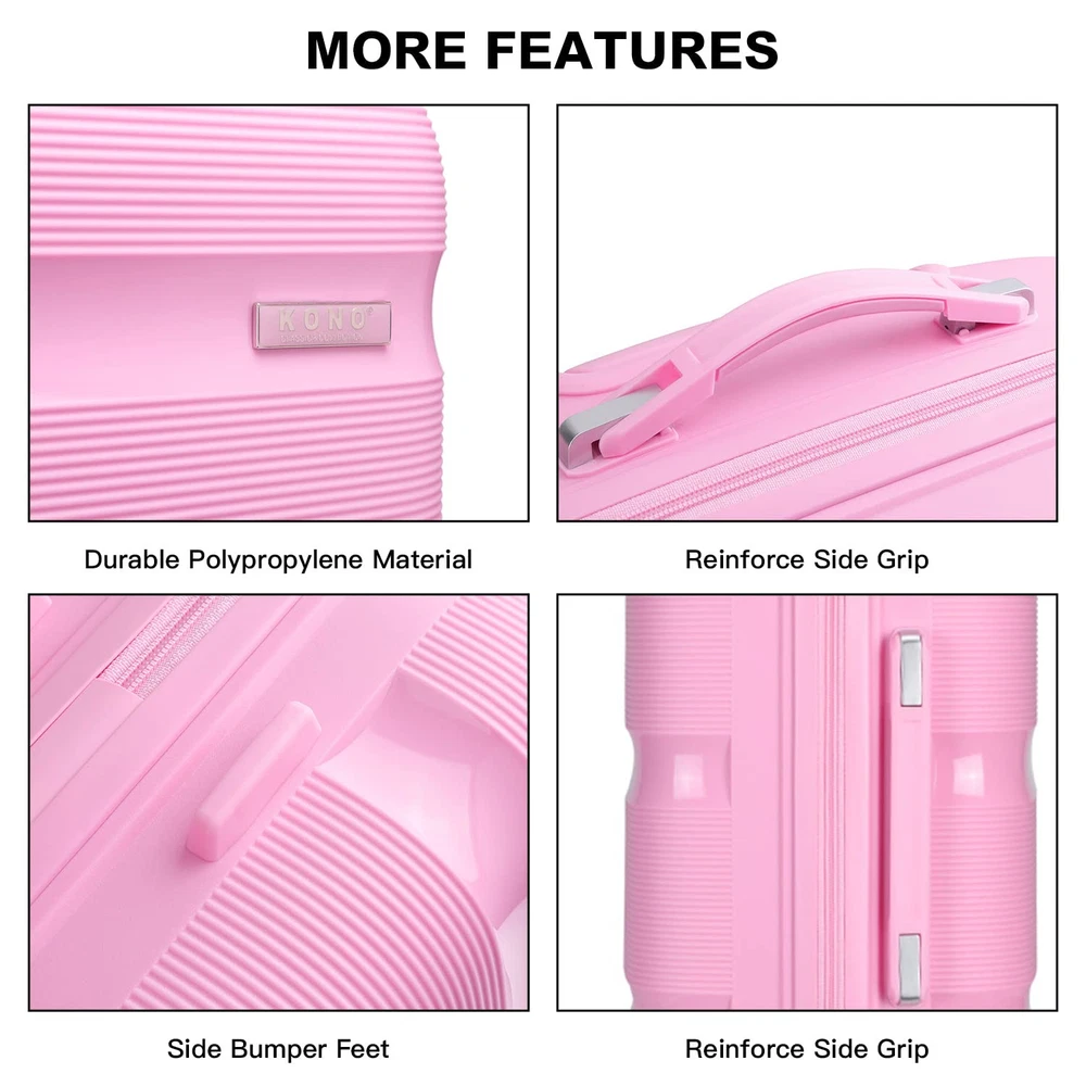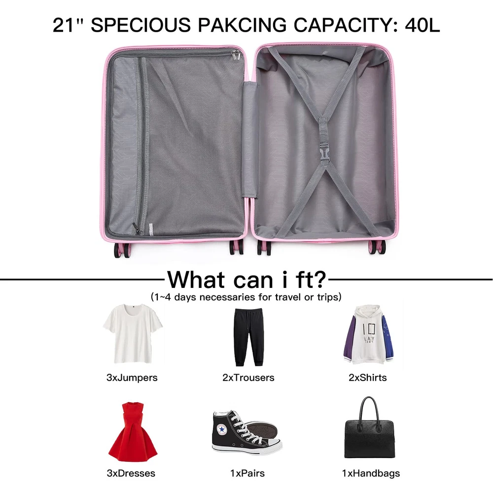 【21 INCH SPINNER LUGGAGE DIMENSIONS】Overall dimensions: 21.7" x 15.7" x 8.3" (including wheels and handles). Weight: 5.6 lbs. Packing Size: 19.3" x 14.2" x 8.3" Capacity: 40L. Perfect for 1-4 day trips! 【LIGHTWEIGHT YET HARD SHELL】The outer shell is made of 100% PP(polypropylene) material, which is eco-friendly & anti-scratch, lighter, stronger and durable enough to withstand the rigors of modern transportation and provide the best protection. PP luggage goes through strict quality control test, such as drop load test, handle lifting test, wheel rolling test, zipper test, etc. 【BUILT-IN TSA LOCK WITH SMOOTH YKK ZIPPER】TSA lock which acts to deter theft, ensuring that only you or a TSA agent have easy access to your belongings when traveling, making sure that your belongings arrive safely at your destination. And equipped with smooth YKK zippers, which uses 5 strands thread to protect the rubber teeth from deformation and lifting, 3 times stronger than normal zippers(ordinary zippers only use 2 strands thread) for easy access to your items. 【SILENT SPINNER WHEELS + TELESCOPIC HANDLE+SHORT HANDLE】Four multi-directional double spinner wheels are made of new soft TPE, ensuring smooth 360°rotation. The aluminum telescopic handle is more stable and lighter. The side easy grab handle can be really handy when lifting the suitcase with heavy weight. 【SPACIOUS PACKING INTERIOR + 5 YEAR LIMITED WARRANTY】Designed with 2 roomy fully lined compartments, divider with zippered mesh pocket, cross straps for increased packing organization, so you can pack your belongings neatly. What's more, carry-on luggage comes with a 5-year warranty against defects in materials and workmanship, just contact us if you don't like it or have quality problems.
