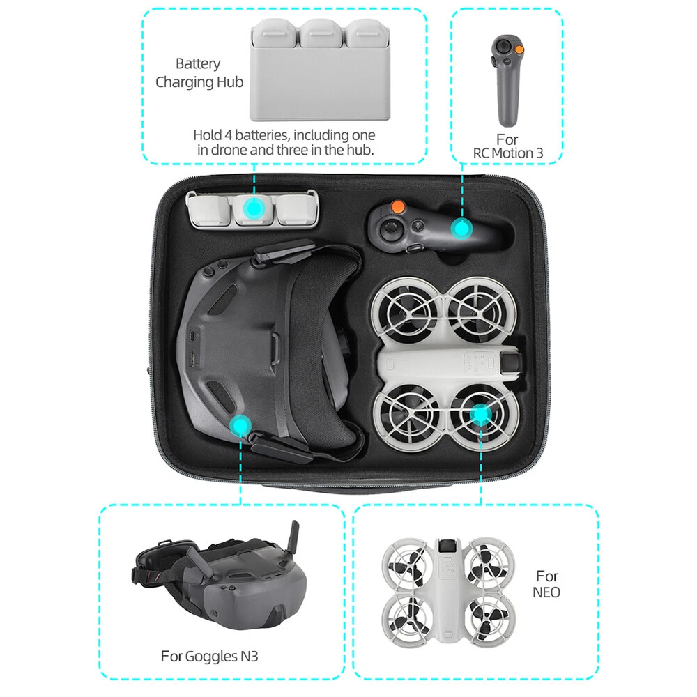 Store Home Promotion Hot Item Add to Fav Contact us Feedback New arrival travelstylespot^-^ Merry Christmas Home & Garden Crafts Clothing, Shoes, Accessories Baby Sporting Goods Jewellery & Watches Computers/Tablets & Networking Vehicle Parts & Accessories Health & Beauty Phones & Accessories Pet Supplies Industrial Toys, Hobbies Cameras Electronics Musical Instruments Video Games & Consoles Home Entertainment Home Appliances Business Collectables Dolls, Bears Prodcution Description : Carrying Case Portable Travel Storage Bag Protective Case Hard Shoulder Bag C ompatible with DJI Neo Drone Goggles N3 and Batteries Feature: 1. Perfect Compatibility Design: This carrying case is made for compatible with DJI NEO drone and its accessories, including the drone body, battery manager, 4 batteries (one in the drone and three in the case), RC motion 3, and Goggles N3. It ensures your equipment is safely and neatly organized. 2. Premium Interior Protection: Featuring high-quality interior molding, the protective case offers excellent shock, drop, and scratch resistance. It effectively protects your drone and accessories from accidental damage during travel or everyday storage. 3. Sturdy and Comfortable Material: The exterior is crafted from high-quality, wear-resistant fabric that feels comfortable to the touch and is highly sturdy. Whether for outdoor adventures or daily use, this travel case withstands various environmental challenges, providing lasting protection for your gear. 4. Shock-Absorbing Hard Shell: Designed with a hard shell exterior, the portable travel storage bag provides outstanding shock and pressure resistance, ensuring your drone remains unaffected by external impacts during transport, offering reliable security and peace of mind. 5. Efficient Storage and Access: Equipped with a zippered mesh pocket, this hard shoulder bag allows for convenient storage of small accessories like spare filters, propellers, screwdrivers, and charging cables. It helps keep your items organized and easily accessible, making it an ideal choice for both travel and daily storage. Specification: Origin: Mainland China Color: Black Material: Cloth Applicable models: compatible with DJI Neo Size: 330x275x114mm/12.99x10.83x4.49inch Note: Due to different monitor settings and lighting conditions, the actual color of the item may vary slightly from the pictures. Thanks for your understanding! Please allow a 1-2 cm difference in measurements due to manual measuring. Included 1 x Carrying Case 1 x Shoulder Strap Pictures PAYMENT DELIVERY WARRANTY PAYMENT We accept PayPal only. All major credit cards are accepted through secure payment processor PayPal. Payment must be received within 7 business days of auction closing. If you have bought multiple items from me, you can send me one payment for all the items instead of paying for them individually. When you click the Pay Now button, eBay will automatically determine if there are other items you have won or purchased from me and will combine them for your review. NOTE: Import duties, taxes and chargers are not included in the item price or shipping charges. These charges are the buyer's responsibility. Please check with your country's customs office to determine what these additional costs will be prior to bidding buying. DELIVERY 1. We Ship to Worldwide. 2. Items will be shipped within 2 business day on payment received. 3. Item are shipped from shenzhen using Airmail, reach most of the countries within 10 to 20. 4. Delivery time depends on destination and other factors, it may takes up to 20 business days. WARRANTY 12 months Warranty. Buy with confidence! If you are not satisfied when you receive your item, please return it within 14 days for a replacement or money back. Please contact me before you return it. If item is defective in 3 months, We will send you a replacement without extra charger, or offer refund after we receive the defective item. If item is defective after 3 months, you can still send it back to us. We will send you a new one after receiving the defective item. But you have to pay the extra shipping fee.