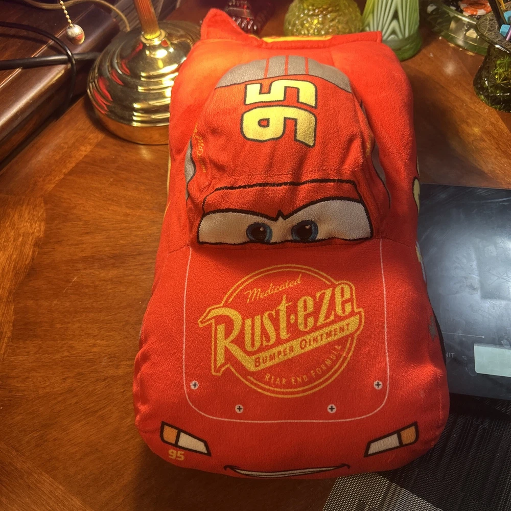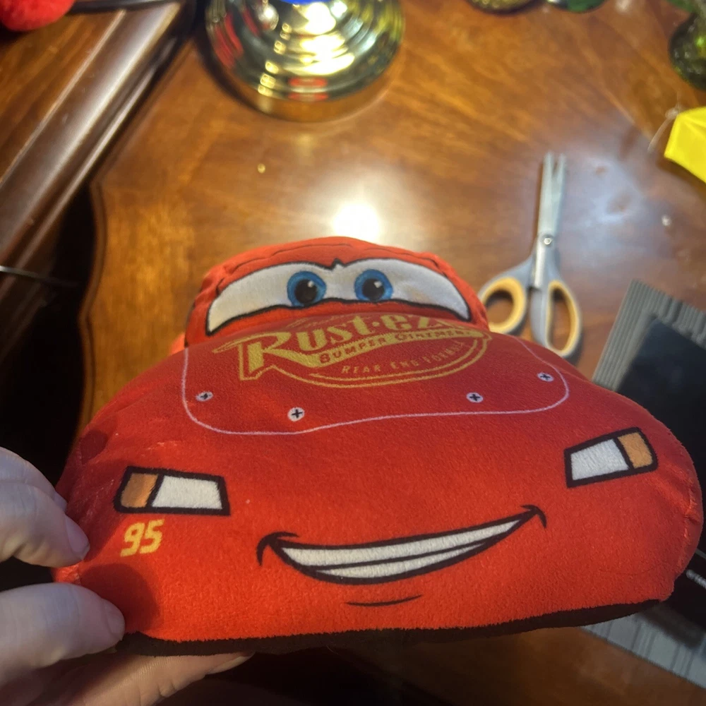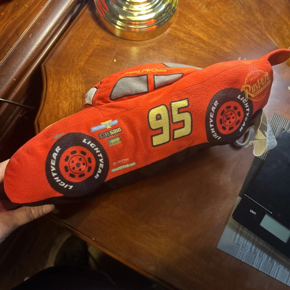 This Cars 3 Lightning McQueen plush pillow is a Disney Store Pixar Cars collectible featuring the beloved race car character from the Disney Pixar Cars franchise. Perfect for fans of the movies, this stuffed toy is both a decorative pillow and a cuddly companion. The plush material adds a soft touch, making it an ideal addition to any Disney Pixar Cars collection or a cozy addition to a child's bedroom.17” X 9”X 7” tall sold as-is