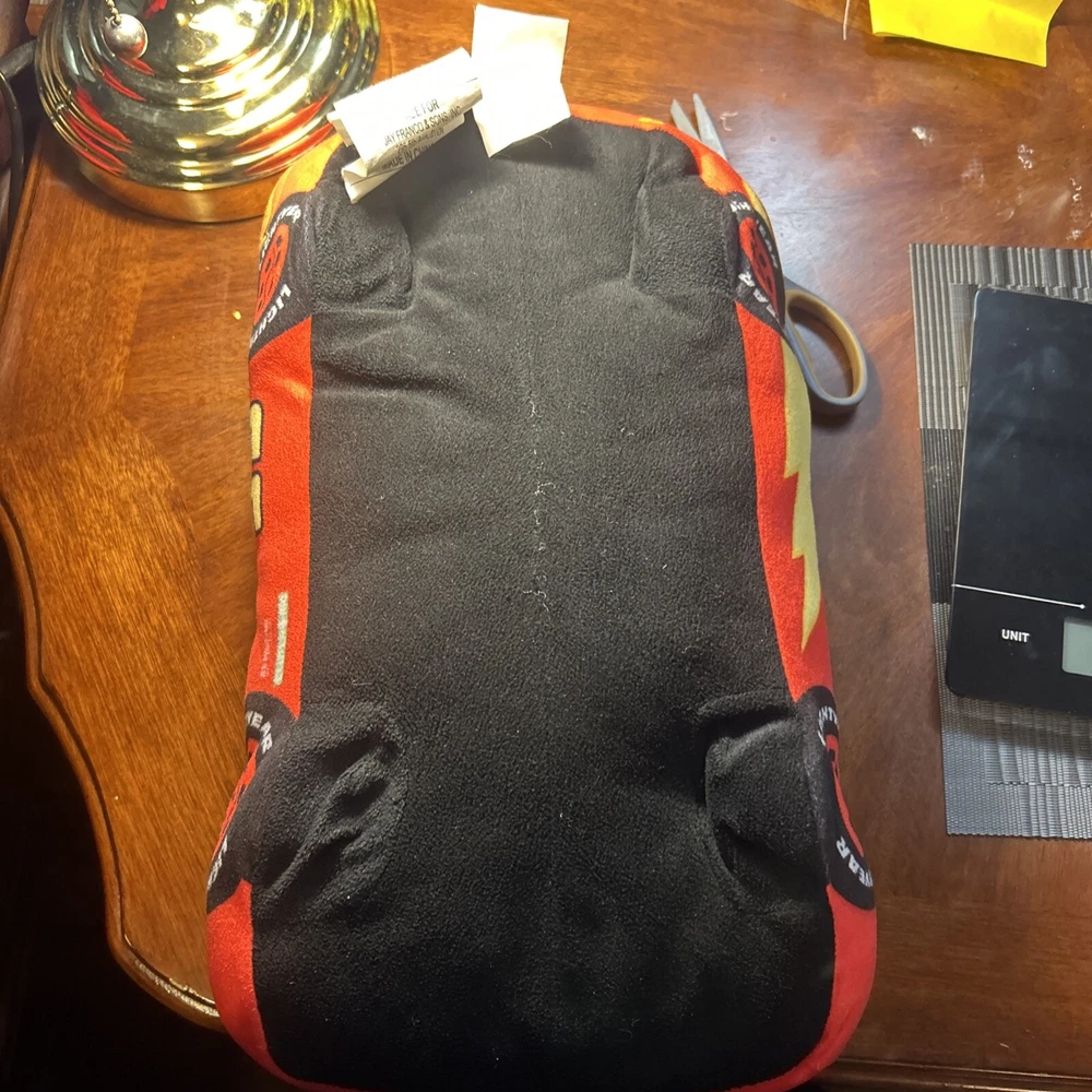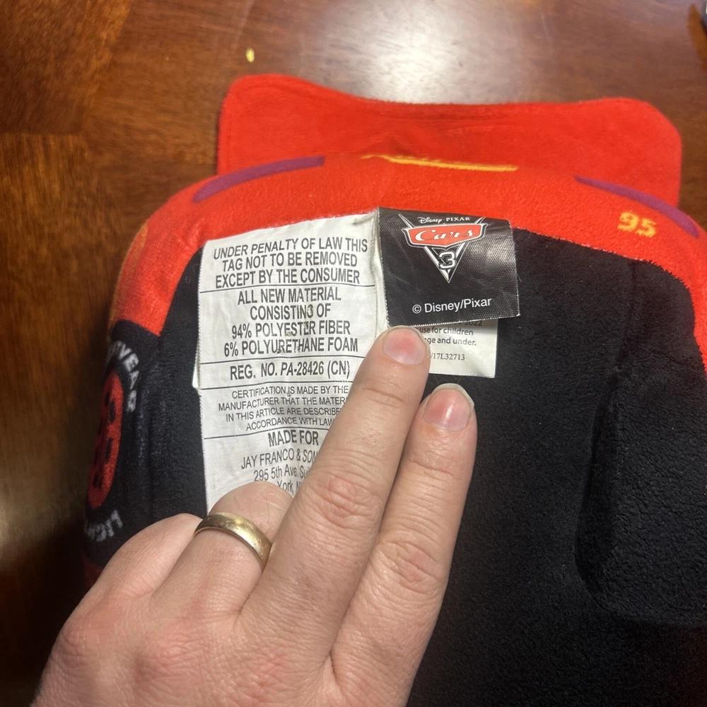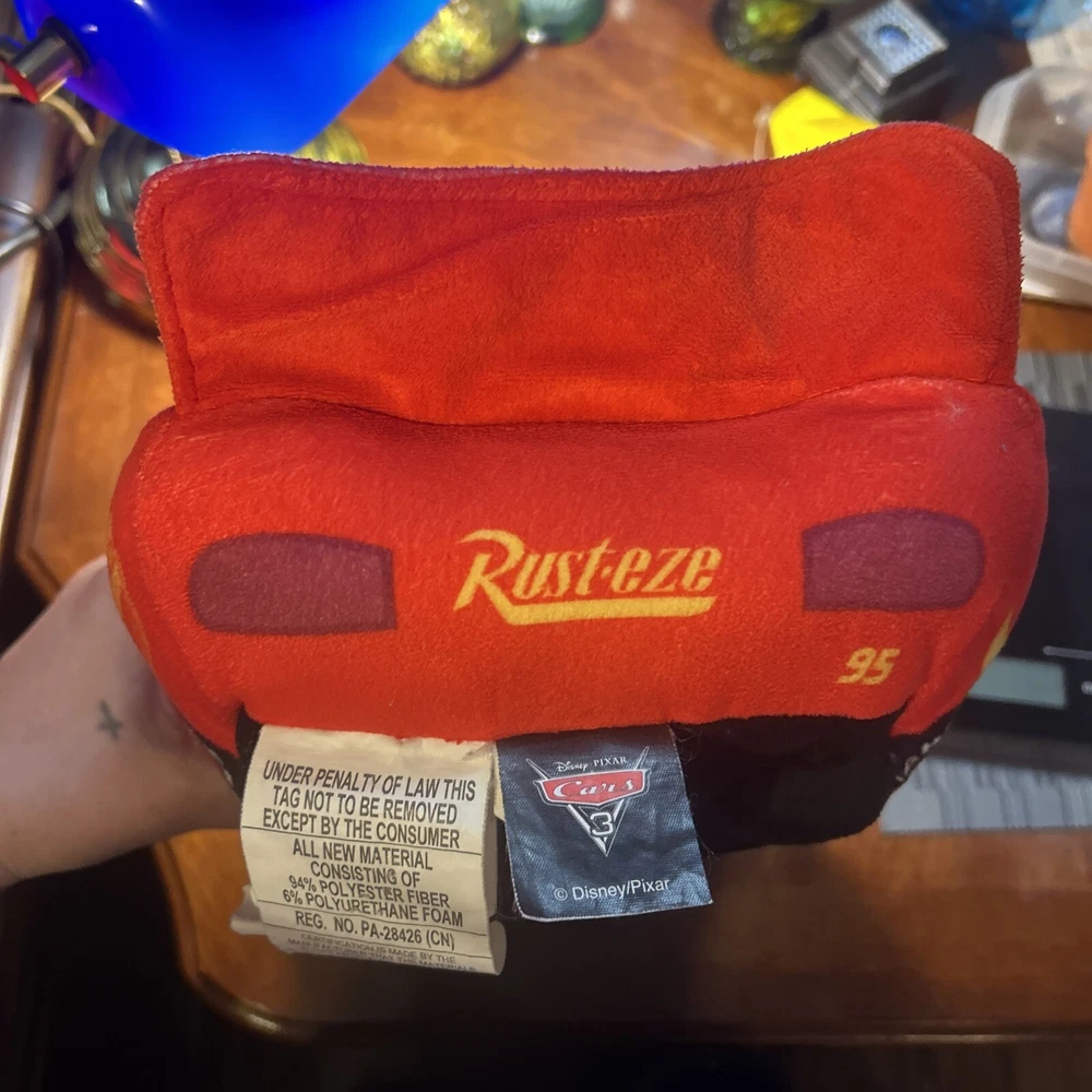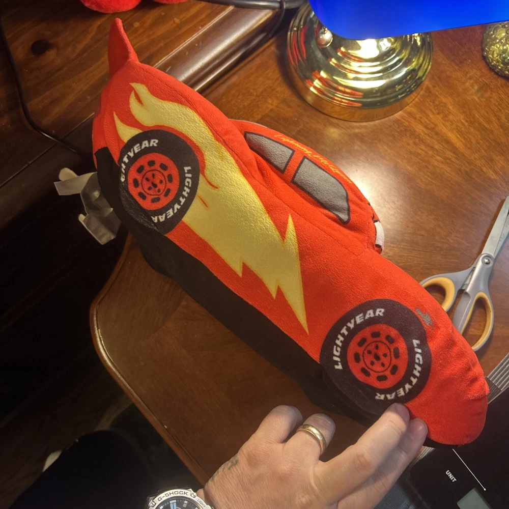 This Cars 3 Lightning McQueen plush pillow is a Disney Store Pixar Cars collectible featuring the beloved race car character from the Disney Pixar Cars franchise. Perfect for fans of the movies, this stuffed toy is both a decorative pillow and a cuddly companion. The plush material adds a soft touch, making it an ideal addition to any Disney Pixar Cars collection or a cozy addition to a child's bedroom.17” X 9”X 7” tall sold as-is