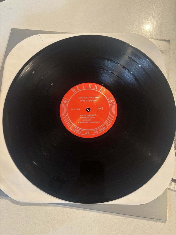 The product is a first pressing of the LP record "Drag Explosive" by Cars Get Crushed, released by Deluxe in the 1995. The record is in a 12" format with stereo audio. The record comes in a cardboard sleeve, making it a valuable addition for fans of vintage American emo / indie rock music.