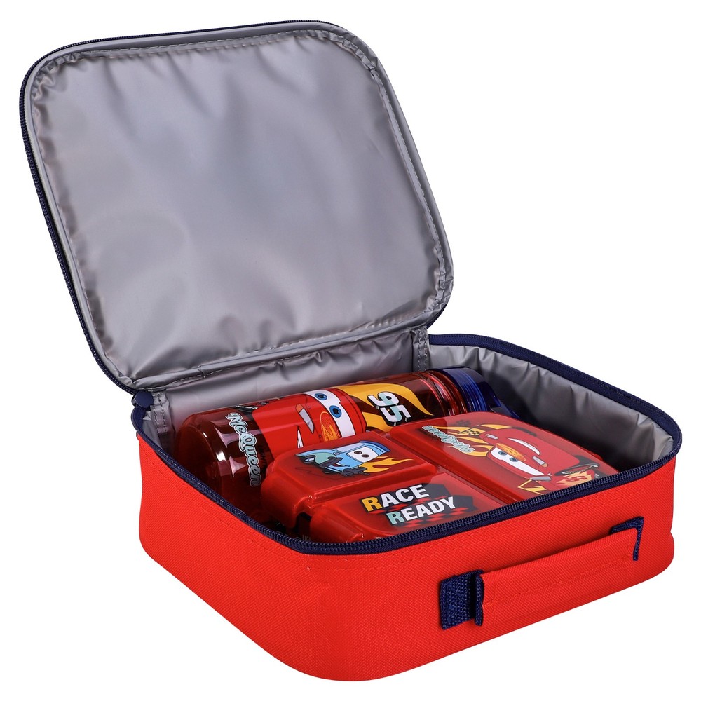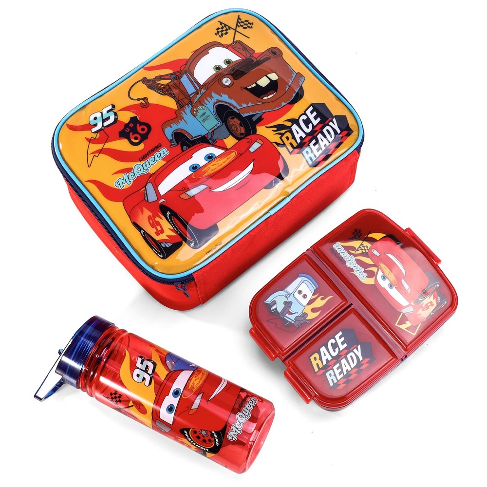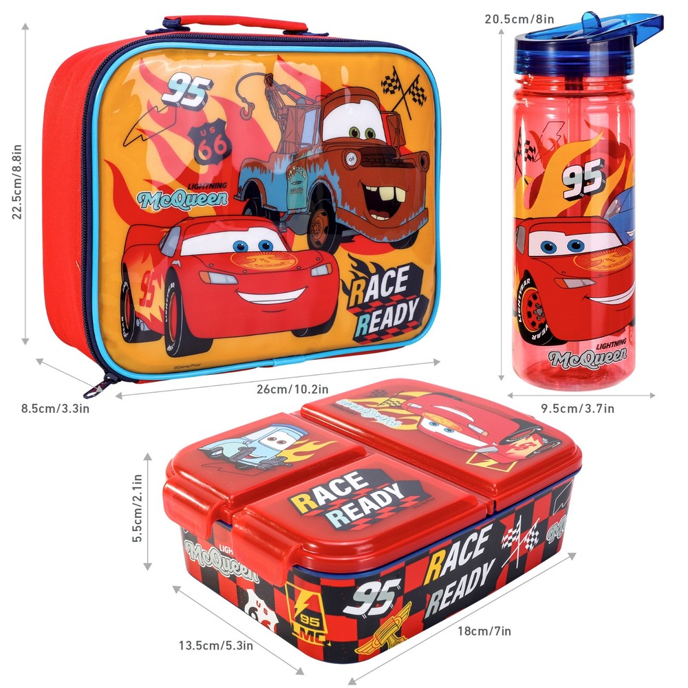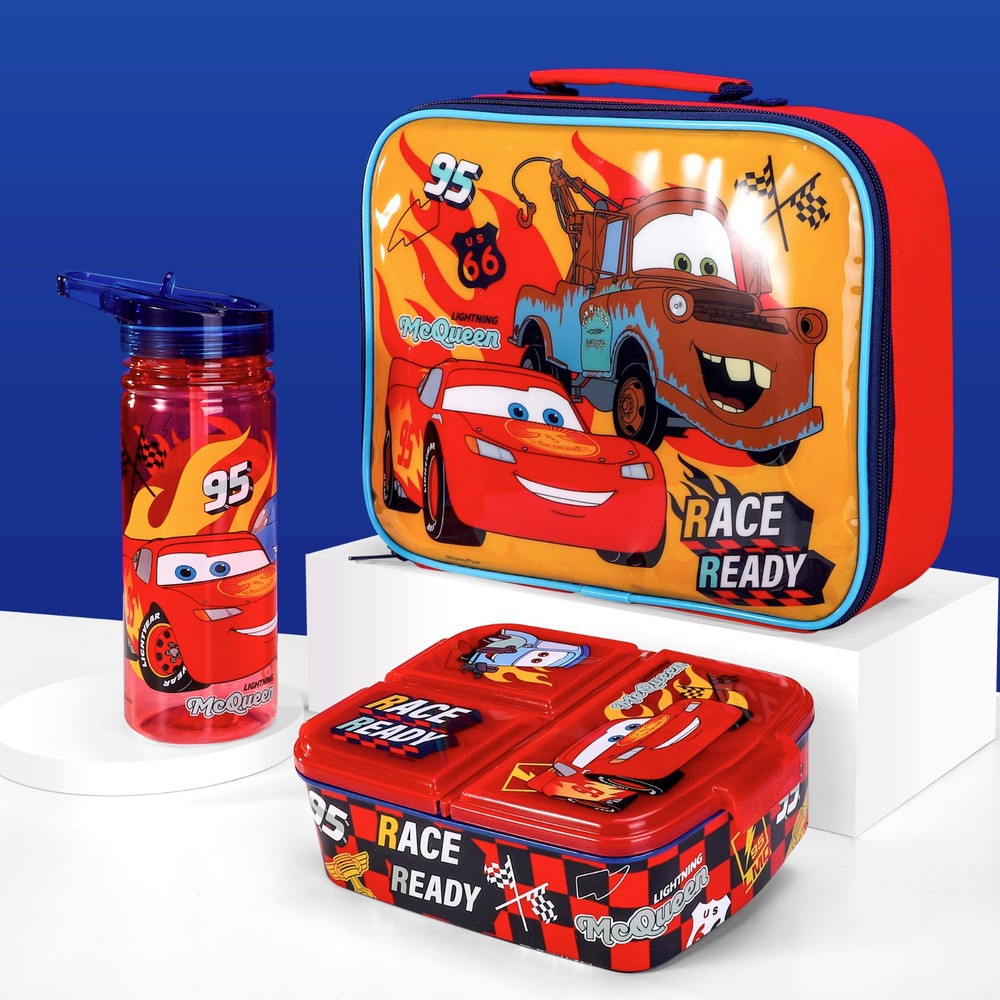 Cars Lightning McQueen Kids Childrens Lunch Box Set – Insulated Lunch Bag, Multicompartment Lunch Box & 580ml Water Bottle - School Travel Lunch Food Set, BPA Free KIDS FRIENDLY DESIGN : Practical and original Lunch Set for food, ideal for kids to carry their lunch or snacks in their outings away from home or to School. Thanks to its stricking designs, based on some of the most emblematic movie and TV characters, kids will love using it every day. EASY TO CARRY AND CLEAN : Easy to clean set that are light and highly resistant and very practical for children to handle. BEST FOR KIDS : 100% BPA free that are great for everyday use for school, sports, holiday clubs, days out and holidays. FOOD SAFE AND EARTH FRIENDLY : Our products are environmentally friendly and food safe that are BPA Free. LUNCH BOX SET : Includes Insulated Lunch Bag, Multi Compartment Lunch Box and 580ml Bottle