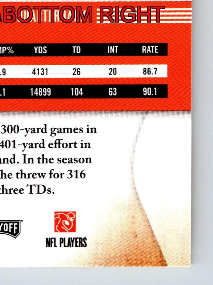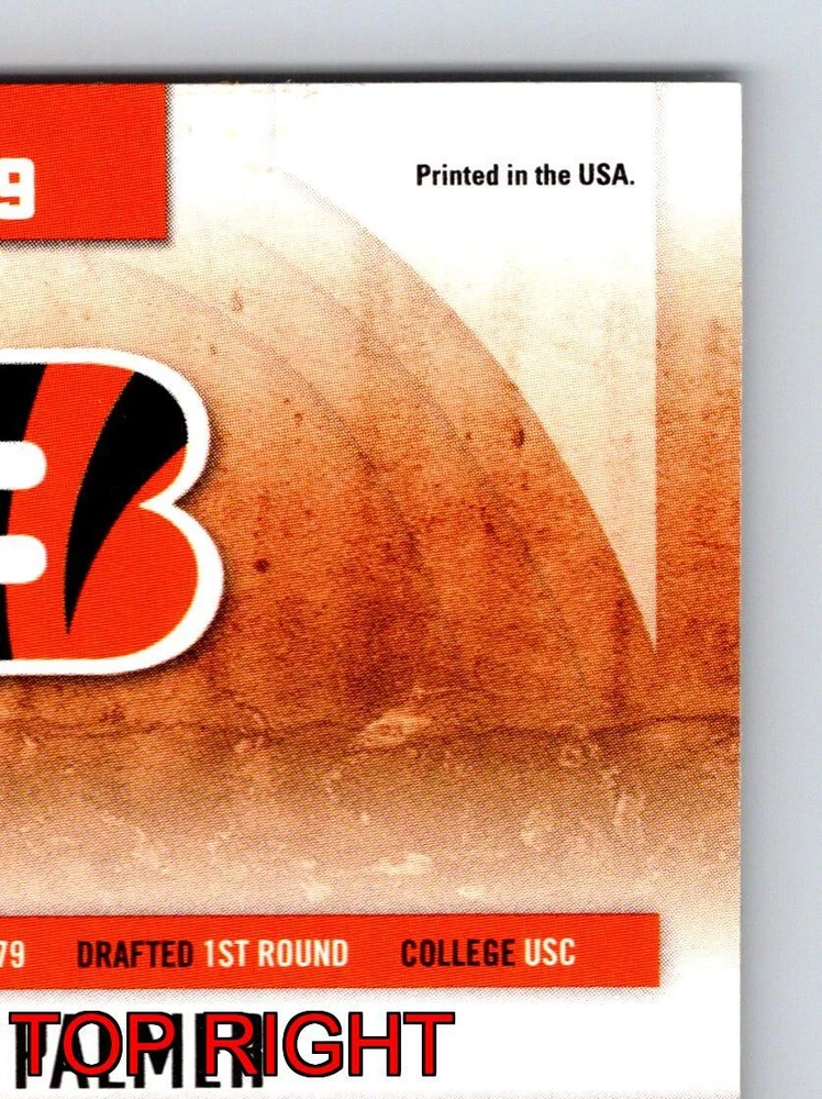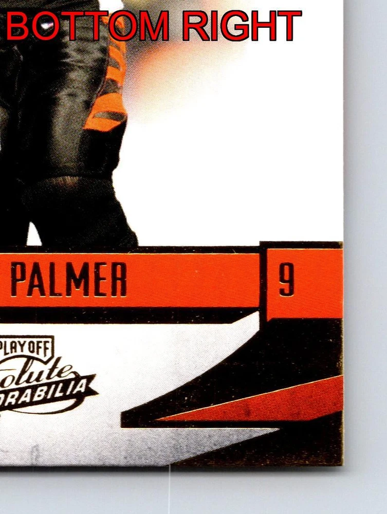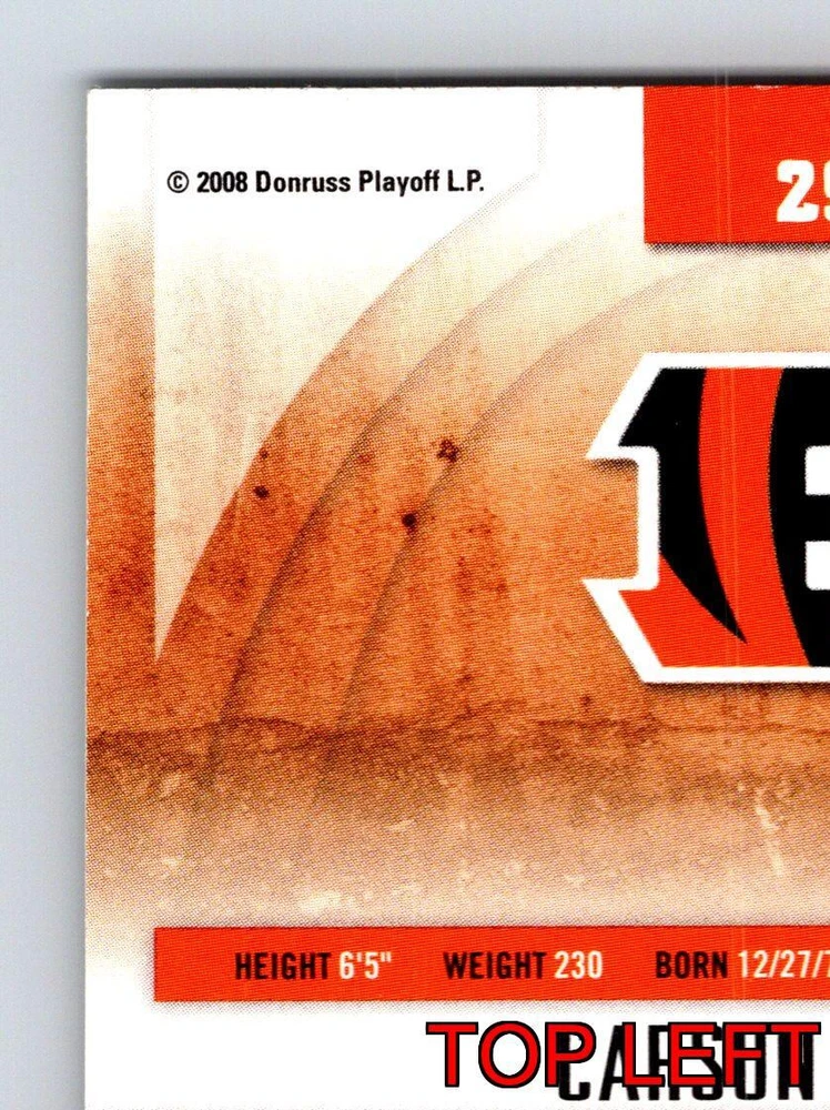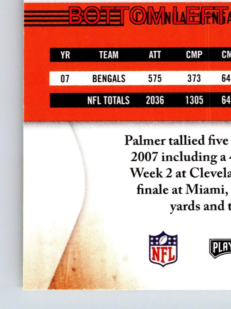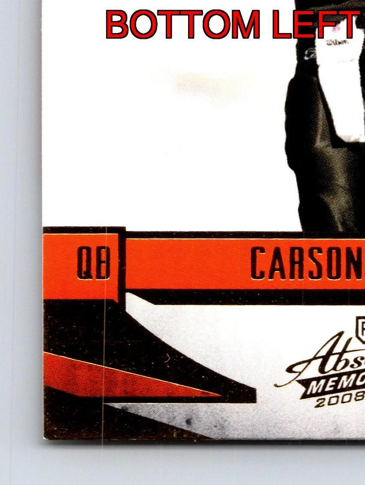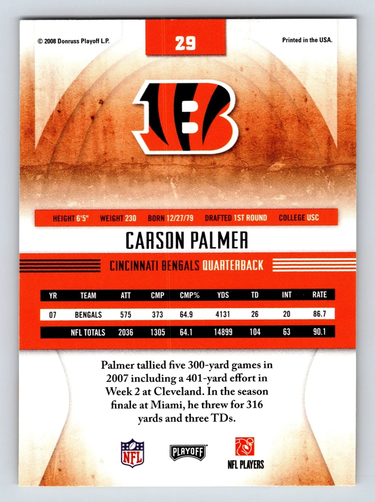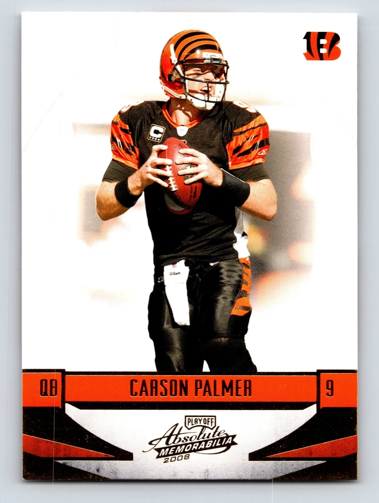 Item Description Title: Carson Palmer Cincinnati Bengals Quarterback Absolute Memorabilia 2008 Description: This sports trading card features Carson Palmer; the accomplished quarterback for the Cincinnati Bengals. It is part of the 2008 Absolute Memorabilia set; recognized for its attention to detail and premium design. Palmer is depicted in the Bengals' iconic black and orange uniform; captured in a dynamic pose that highlights his poise and focus on the field. The back of the card provides a snapshot of Palmer's impressive statistics from the 2007 season; where he led his team with remarkable skill and precision. Known for his strong arm and leadership qualities; Palmer stands at 6'5 and weighs 230 pounds; adding to his commanding presence on the gridiron. Born on December 27; 1979; and drafted in the first round from USC; Carson Palmer remains a significant figure in the NFL; making this card a prized possession for collectors and fans of the sport. MRSP: $12.99 Sport: Football Player/Athlete: Carson Palmer Season: 2008 Manufacturer: Playoff Parallel/Variety: Unknown Set: Absolute Memorabilia Team: Cincinnati Bengals League: National Football League (NFL) Card Number: 29 Counter: 399 Folder: FOOTBALL1224A02